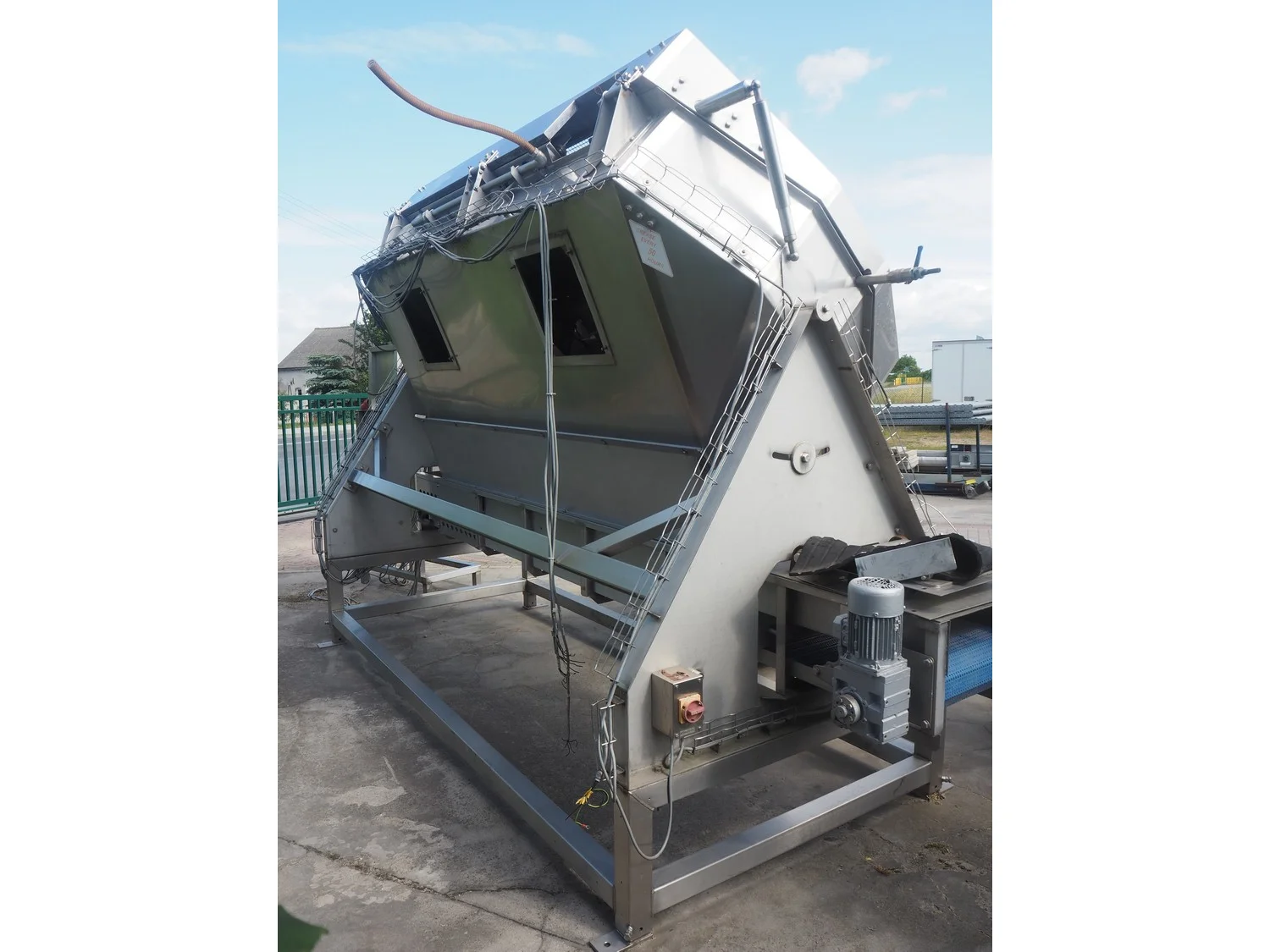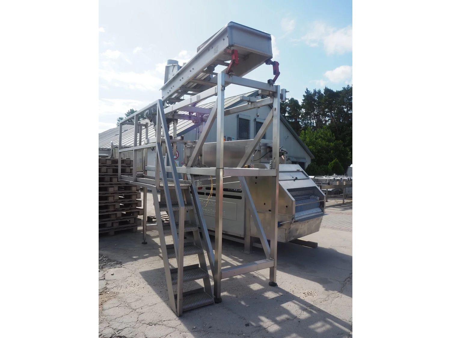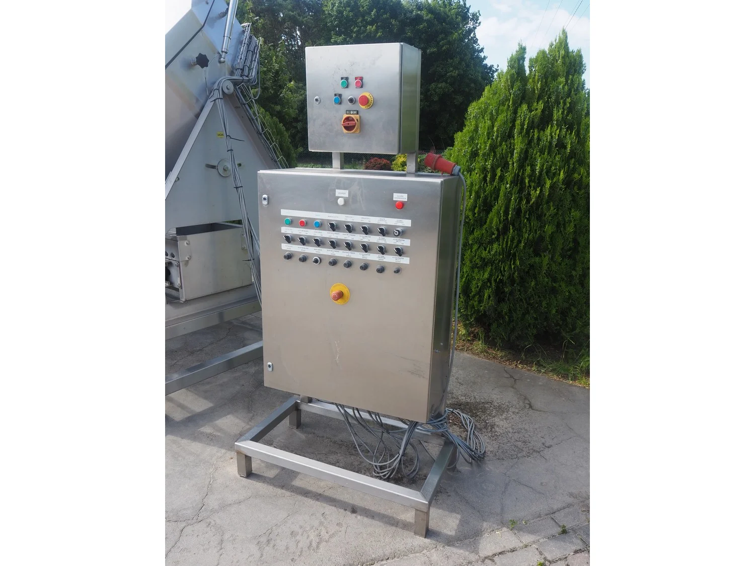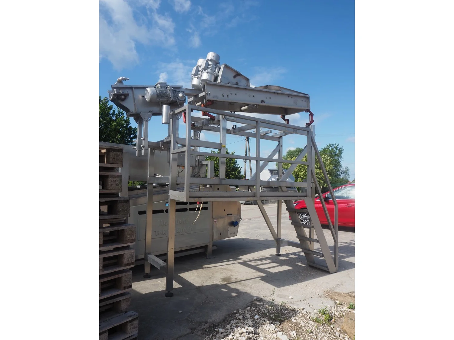 Everet Bross/Niagri Engineering carrot cutter with vibrating infeed gutter, year of construction: 2009, dimensions cutter: 4000 mm x 1600 mm x 2850 mm, dimensions infeed gutter: 3300 mm x 1270 mm x 3150 mm. Including switch cabinet, dimensions: 1000 mm x 550 mm x 2000 mm.