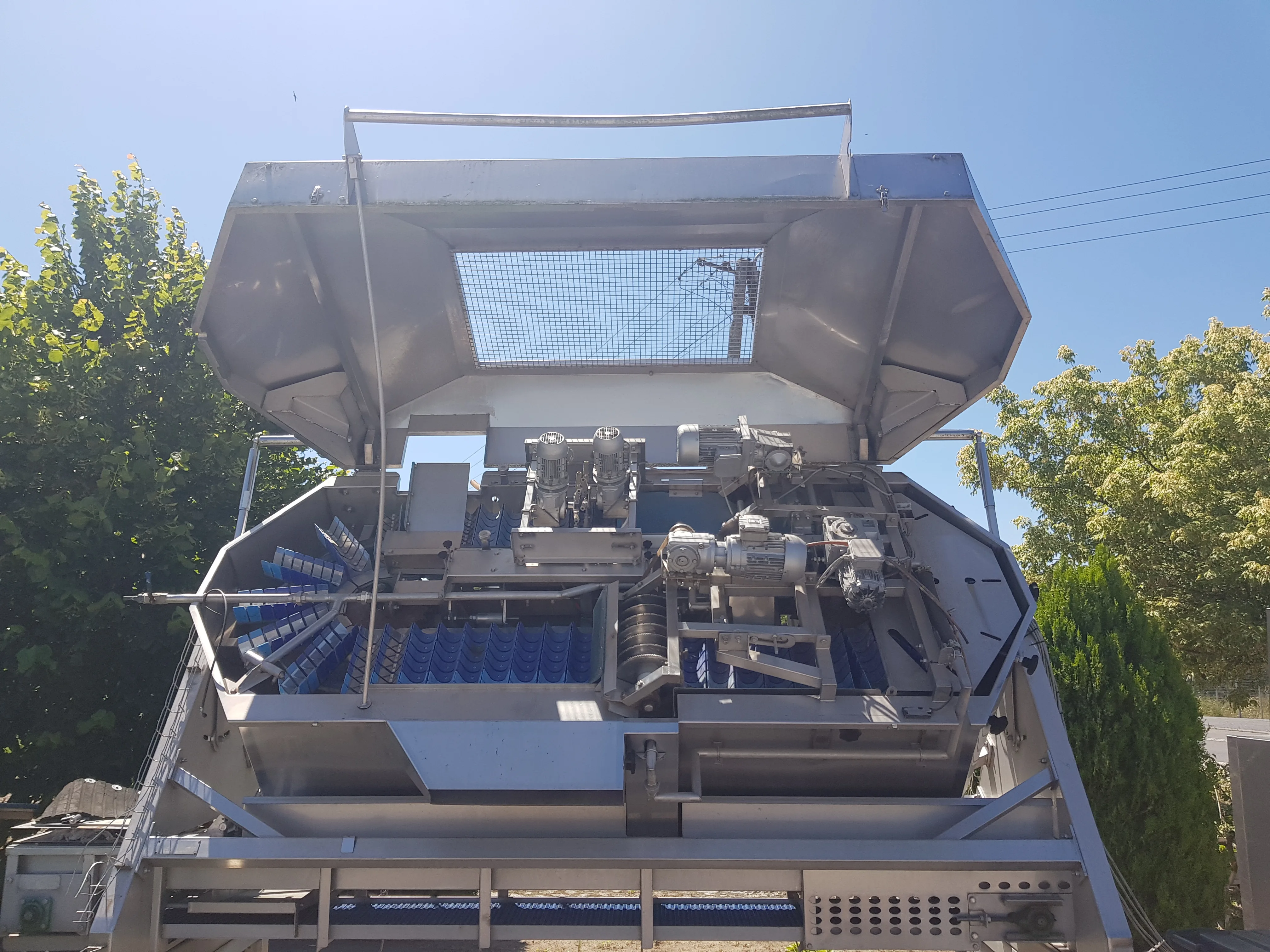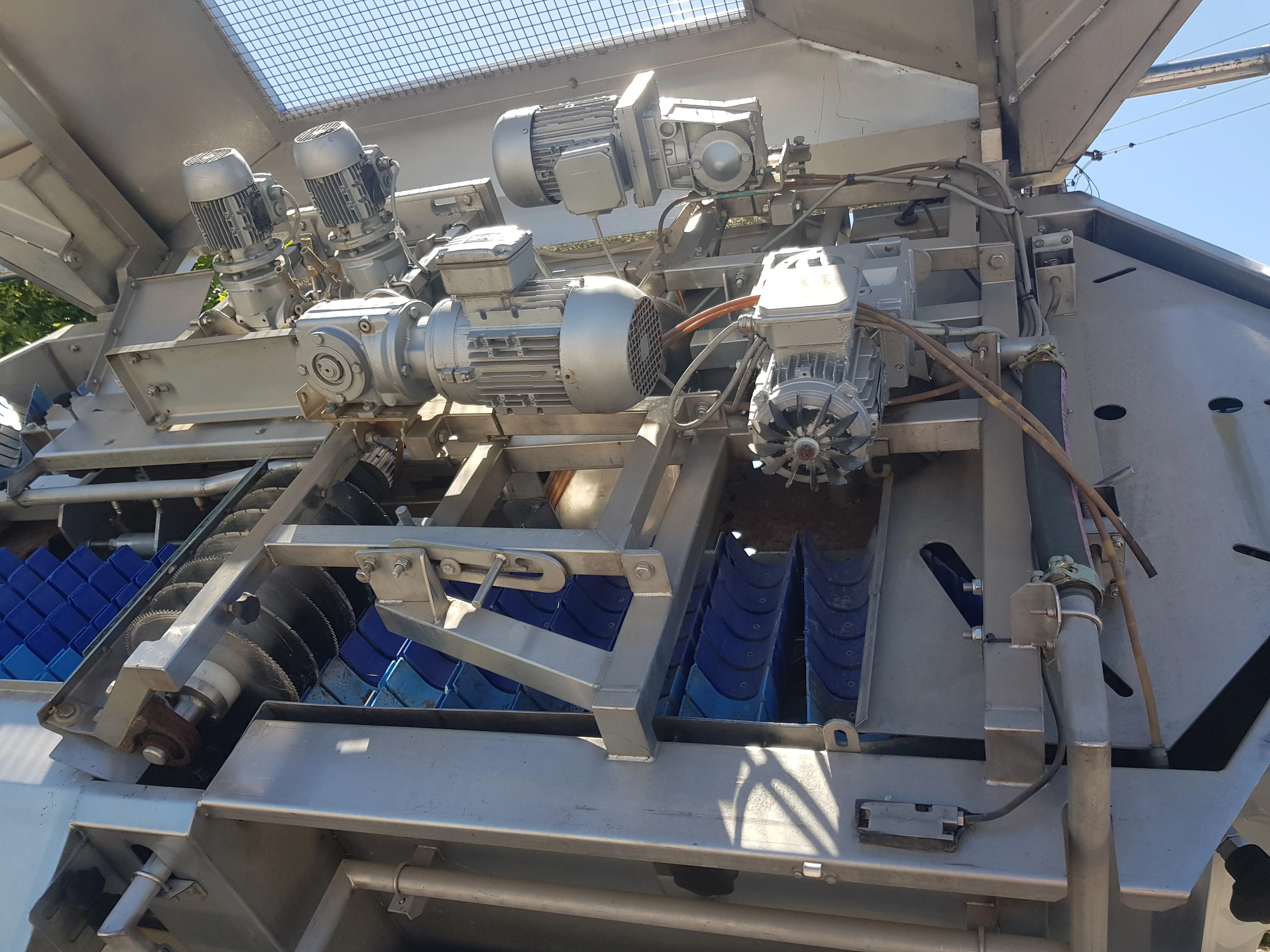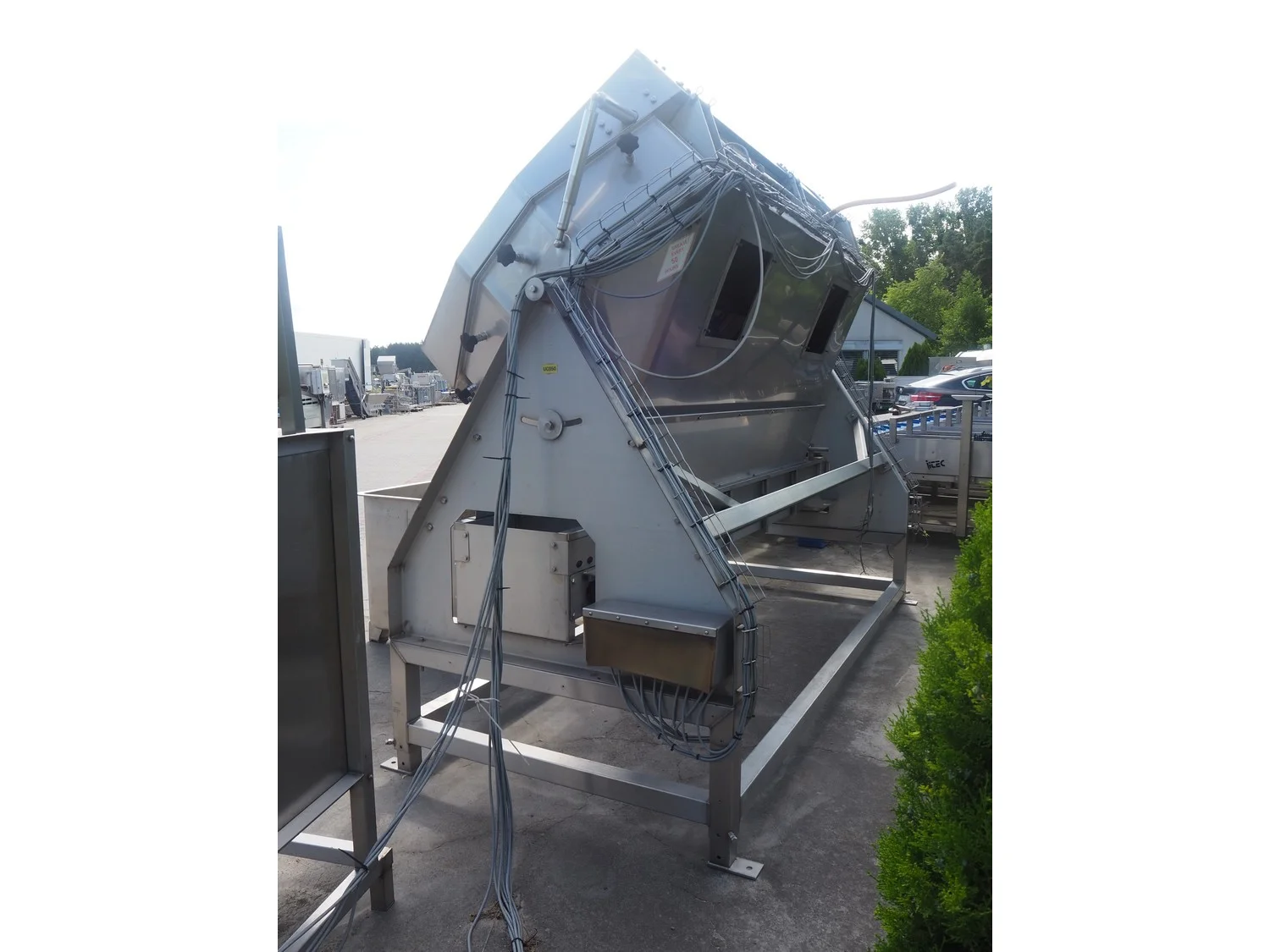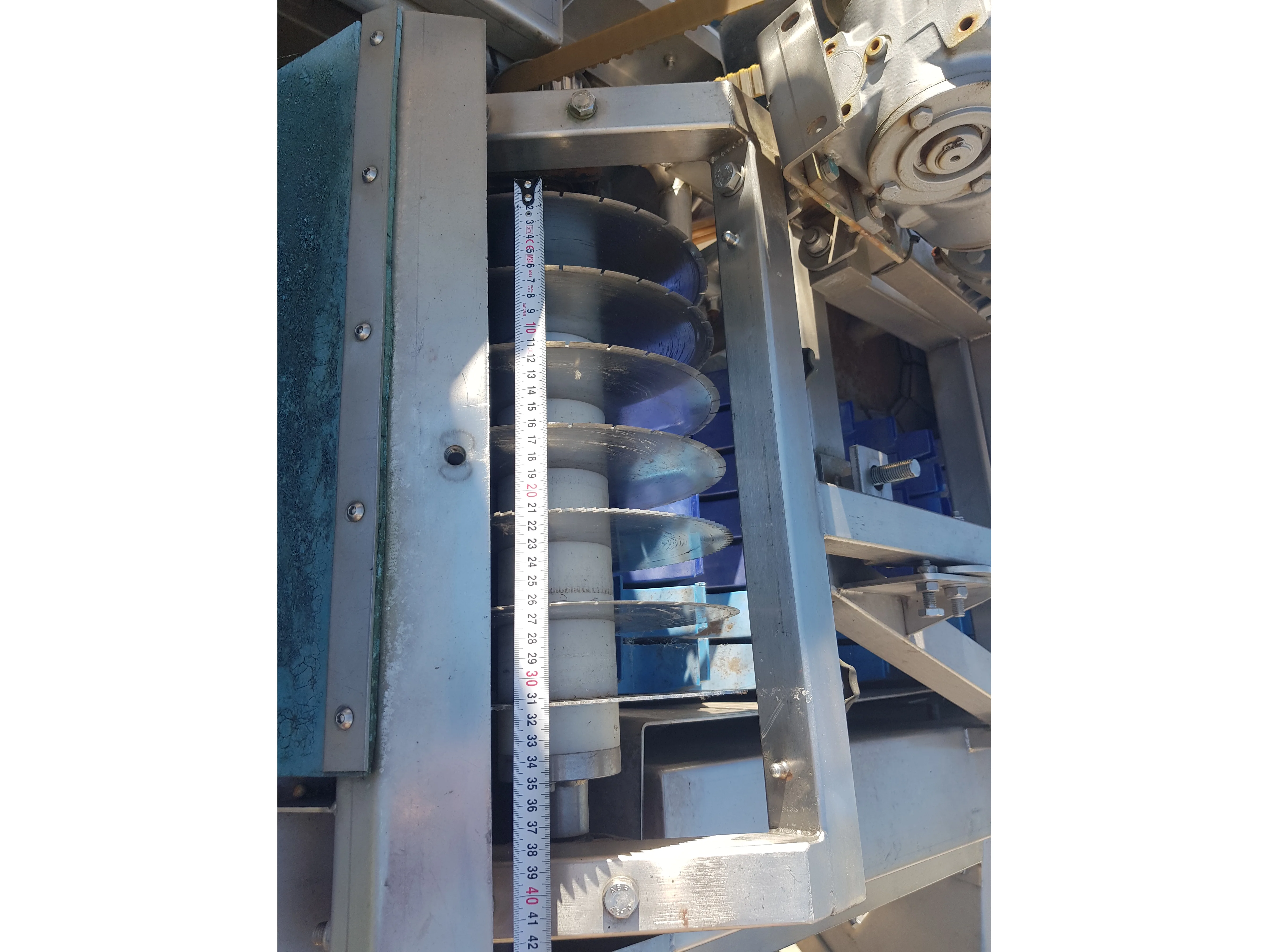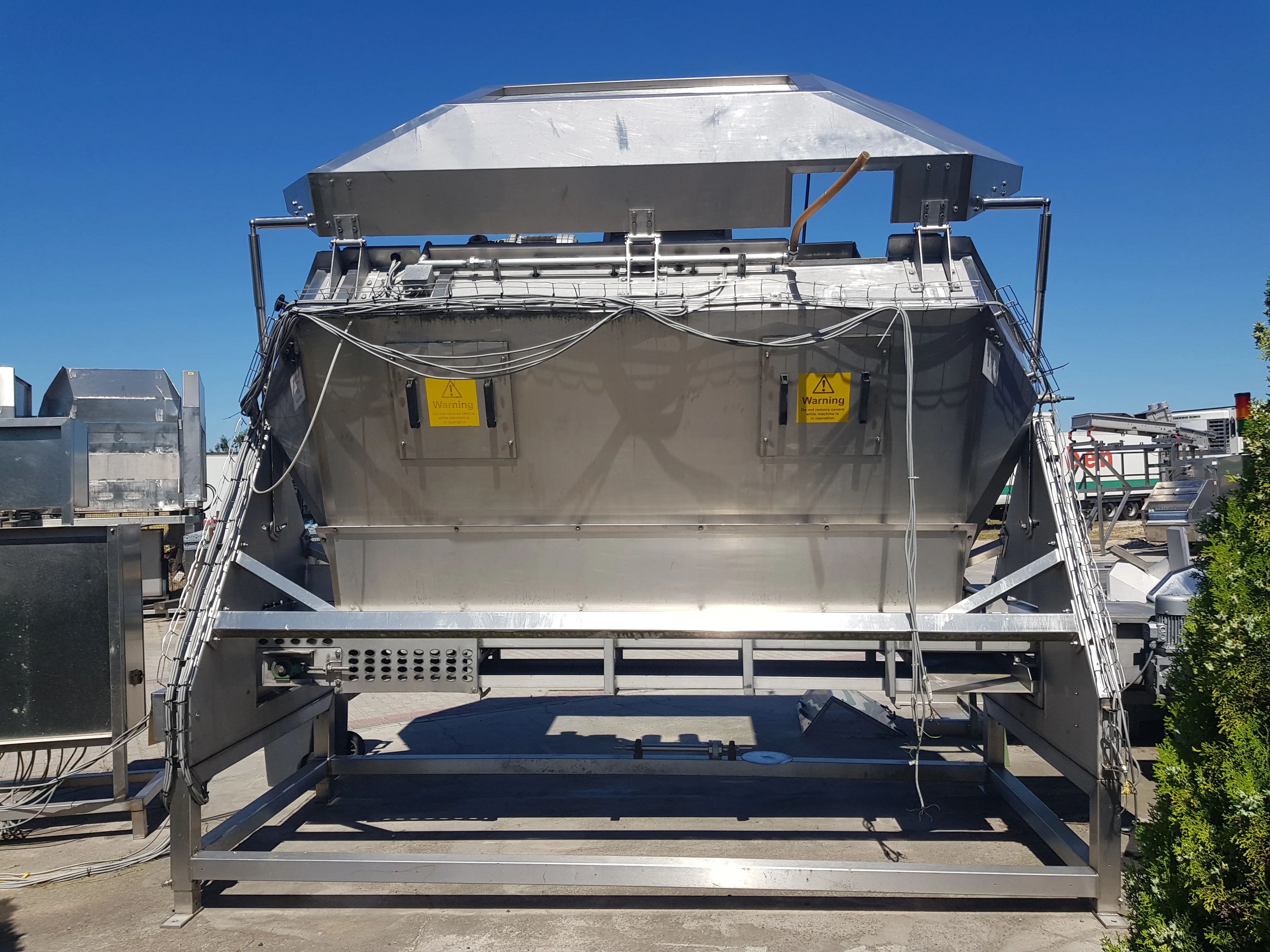 Everet Bross/Niagri Engineering carrot cutter with vibrating infeed gutter, year of construction: 2009, dimensions cutter: 4000 mm x 1600 mm x 2850 mm, dimensions infeed gutter: 3300 mm x 1270 mm x 3150 mm. Including switch cabinet, dimensions: 1000 mm x 550 mm x 2000 mm.