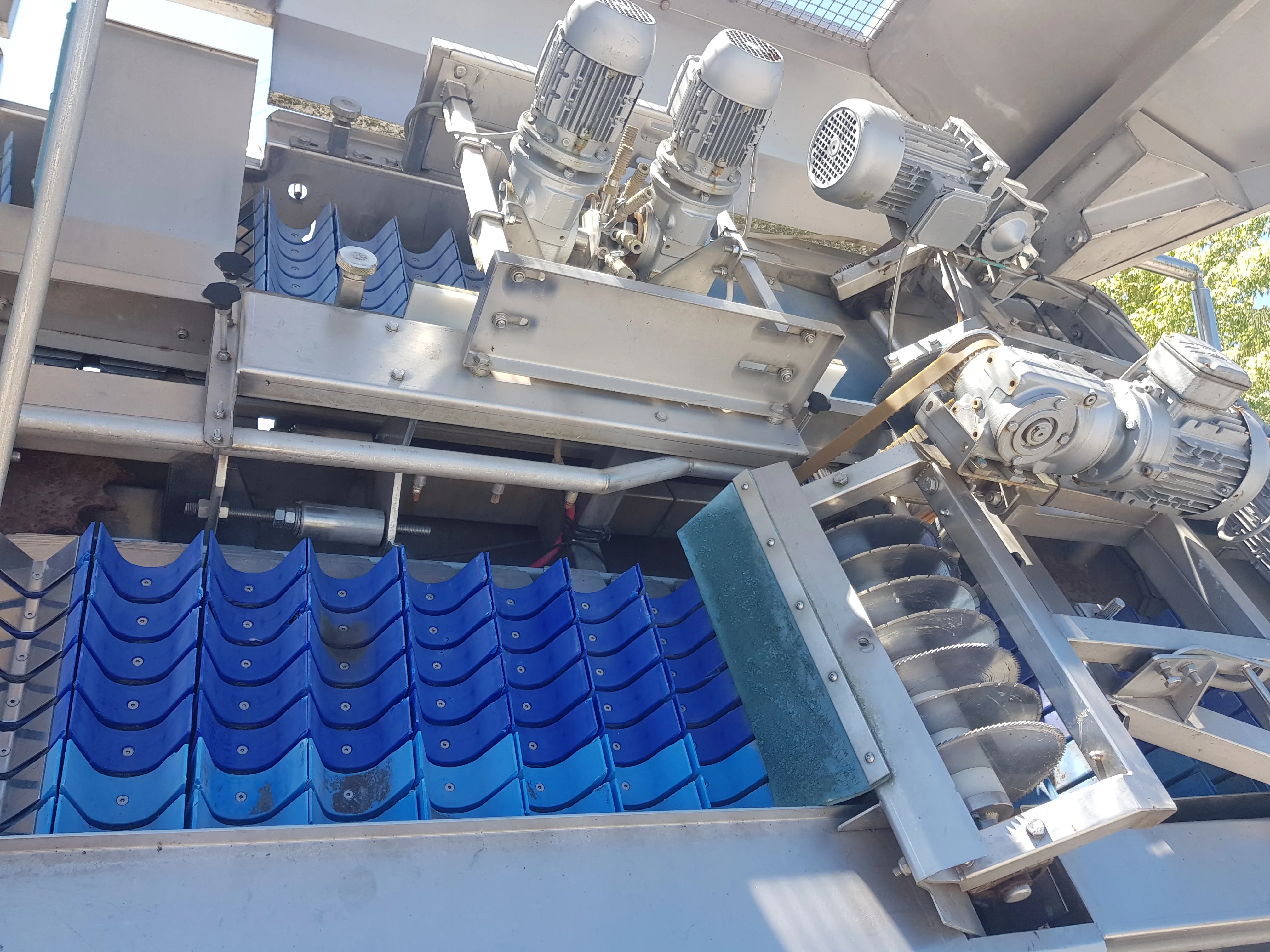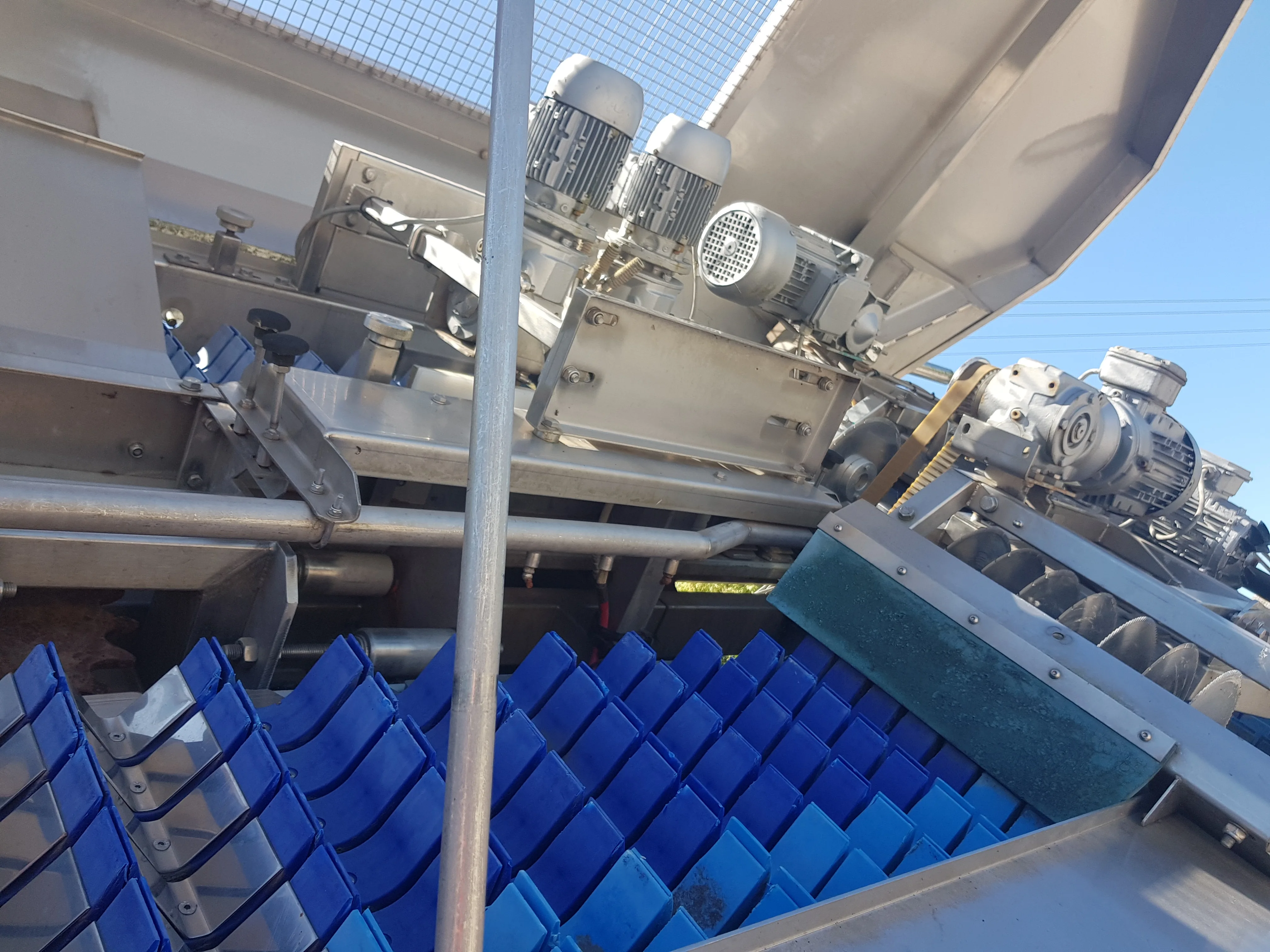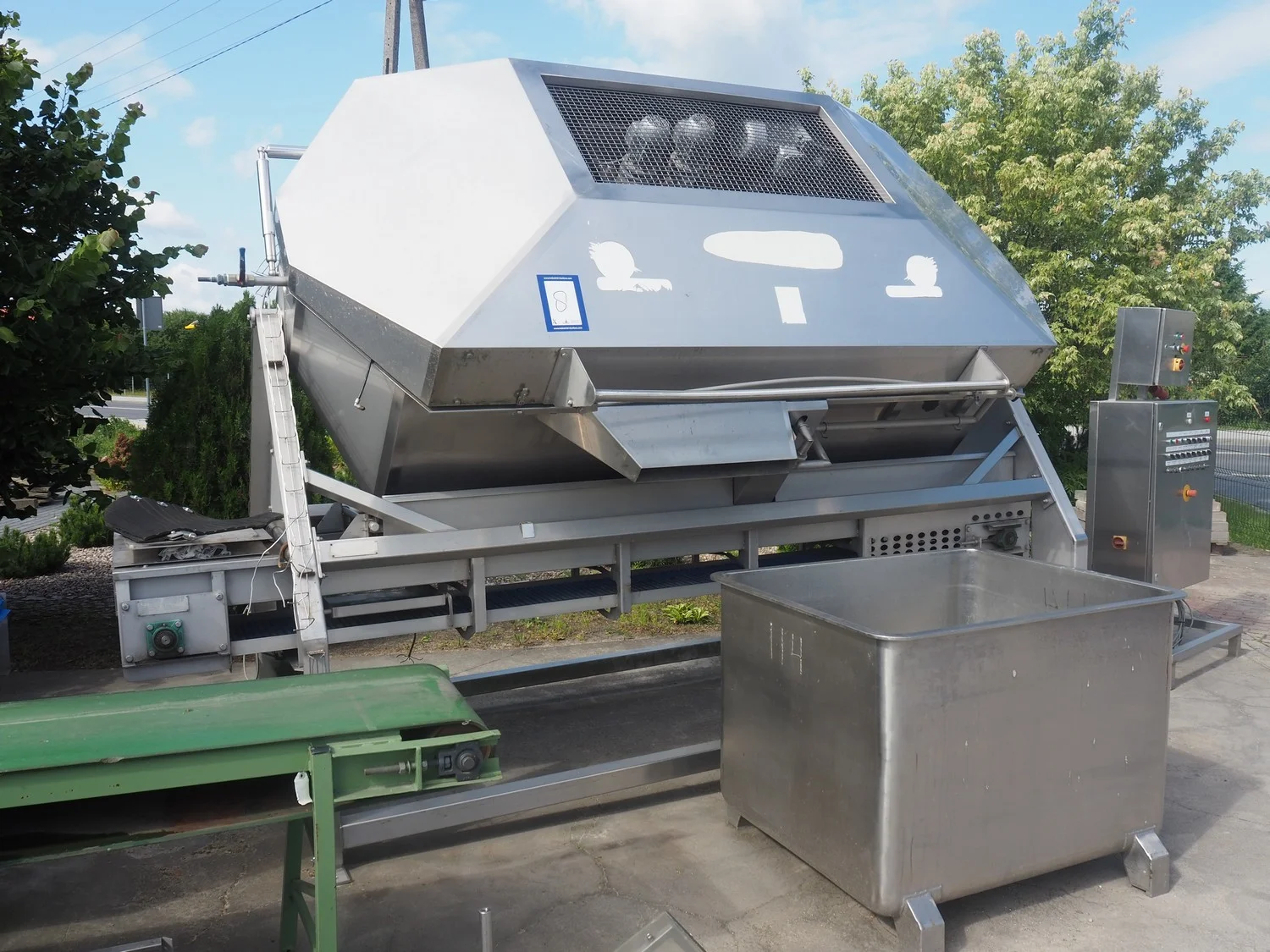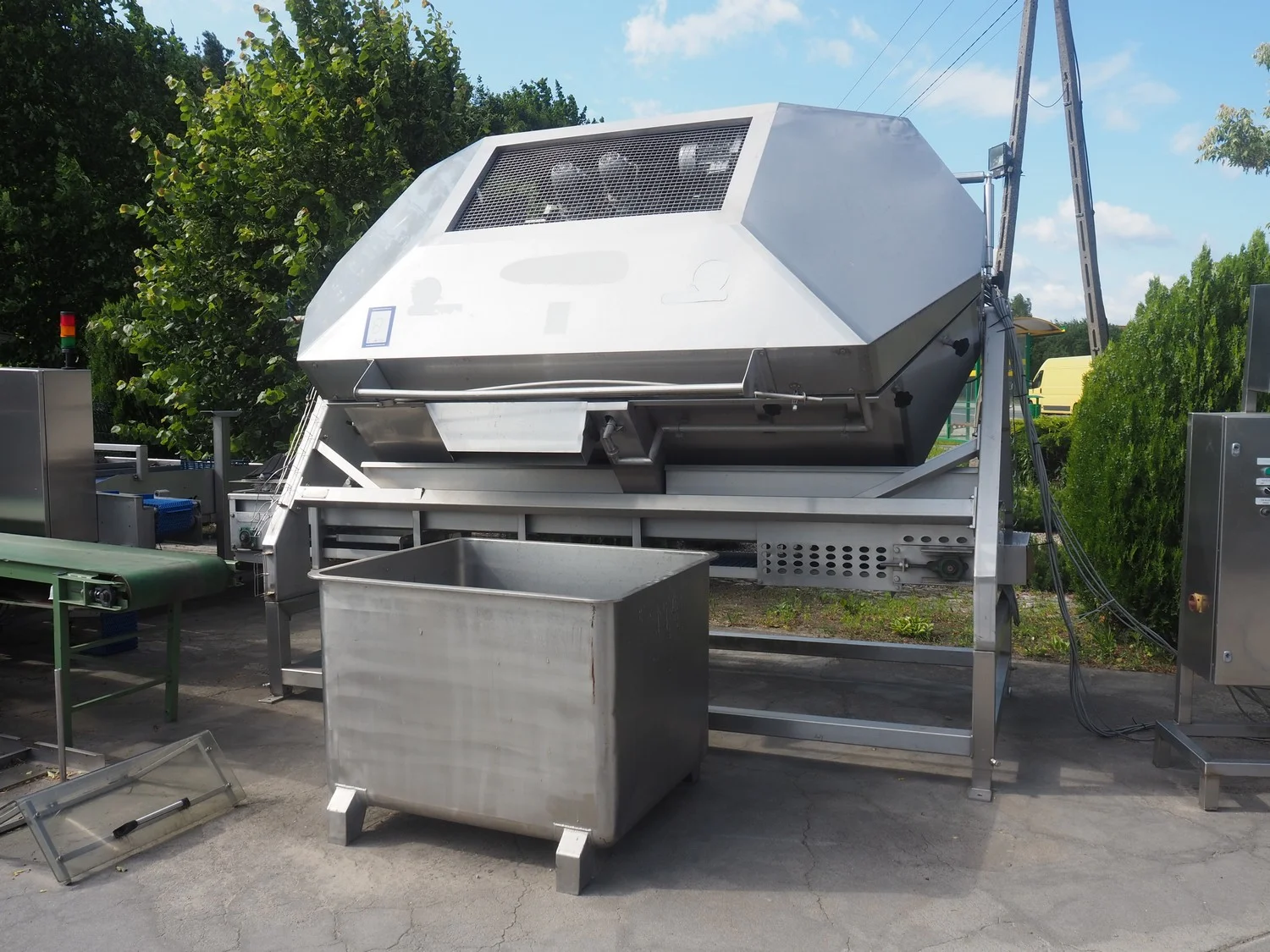 Everet Bross/Niagri Engineering carrot cutter with vibrating infeed gutter, year of construction: 2009, dimensions cutter: 4000 mm x 1600 mm x 2850 mm, dimensions infeed gutter: 3300 mm x 1270 mm x 3150 mm. Including switch cabinet, dimensions: 1000 mm x 550 mm x 2000 mm.