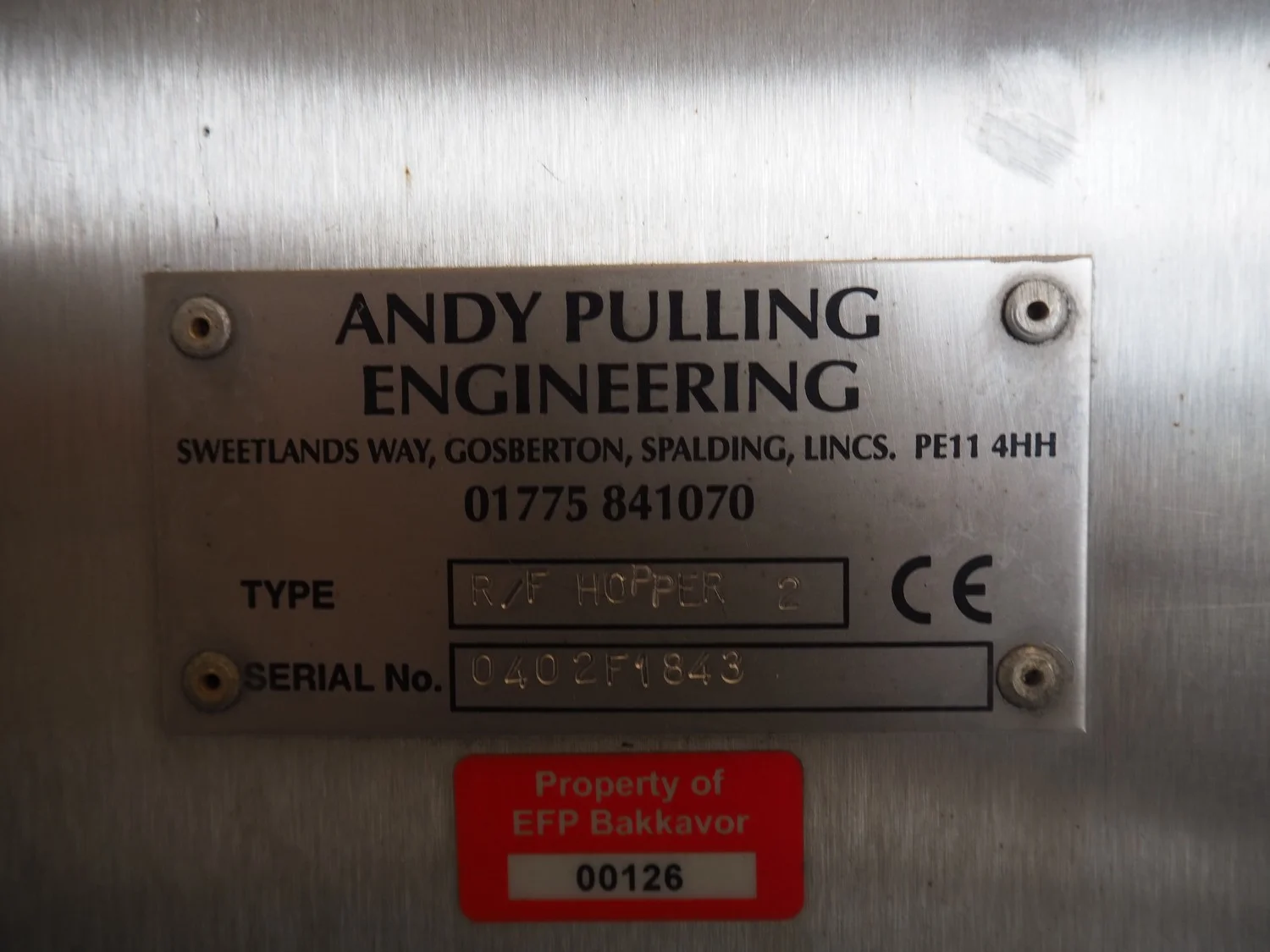Andy Pulling Engineering even flow hopper, type: R/F HOPPER 2, serial number: 0402F1843, belt width: 500 mm, total dimensions: 2500 mm x 1100 mm x 1600 mm.