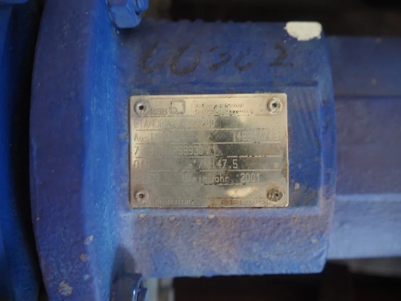 KSB centrifugal pump, year of construction: 2001, capacity: 15 m³ per hour, dimensions: 650 mm x 250 mm x 400 mm.