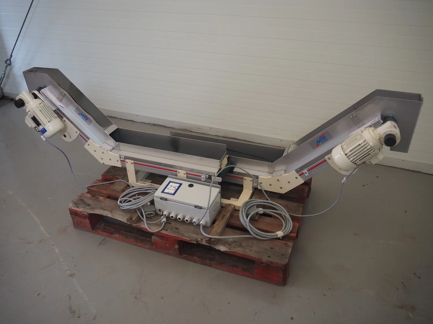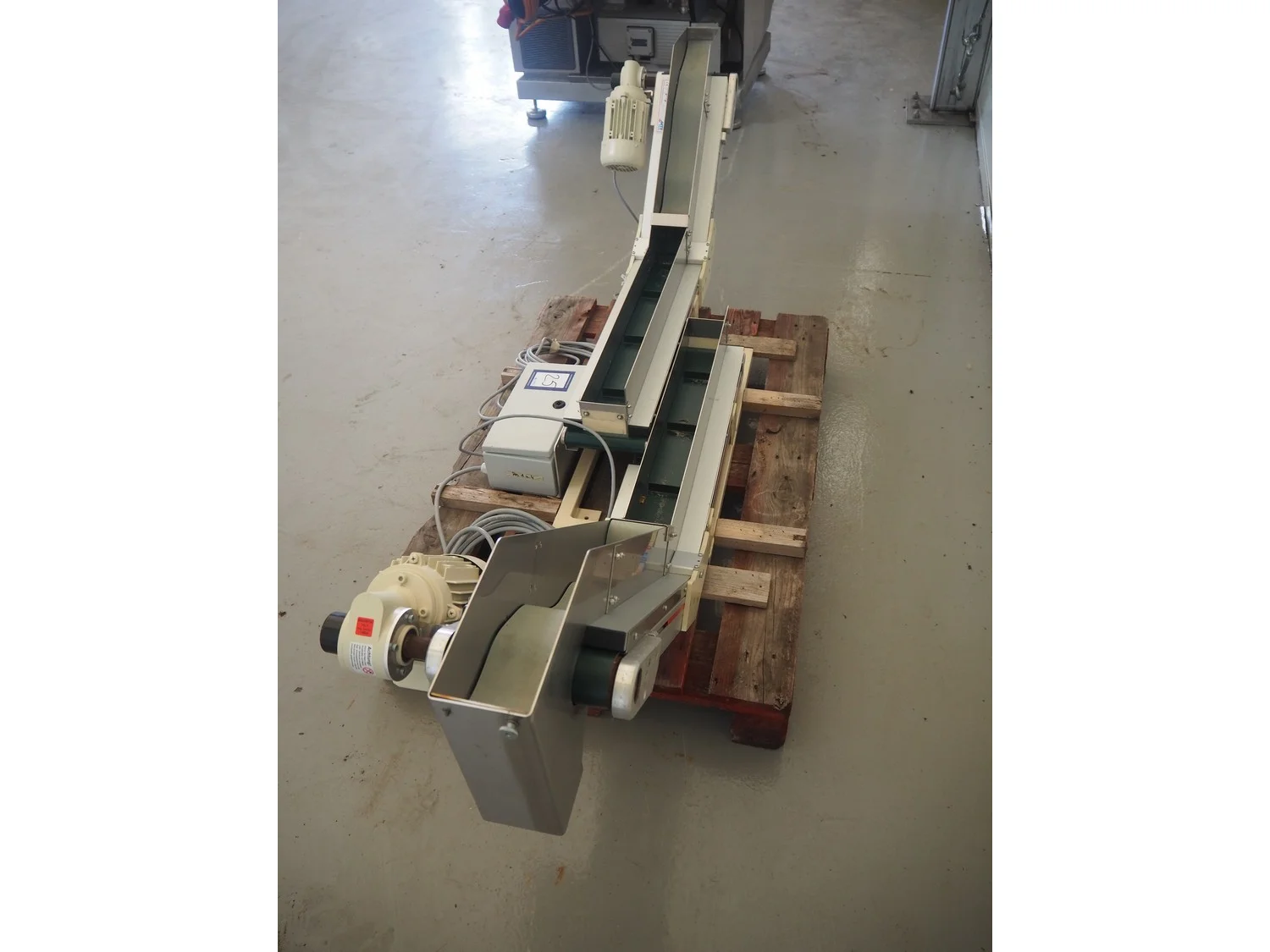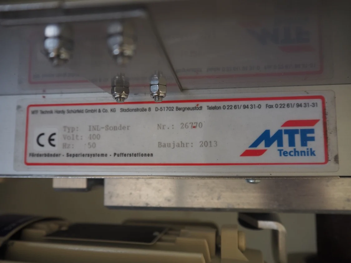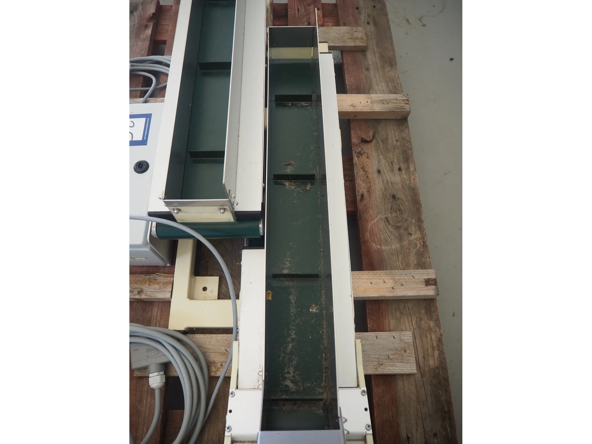 MTF Technik double elevating belt, type: INL-Sonder, number: 26768 and 26770, year of construction: 2013, 400 V, 50 Hz, belt width: (2x) 90 mm, elevating height: (2x) 600 mm, total dimensions: 2040 mm x 550 mm x 600 mm.