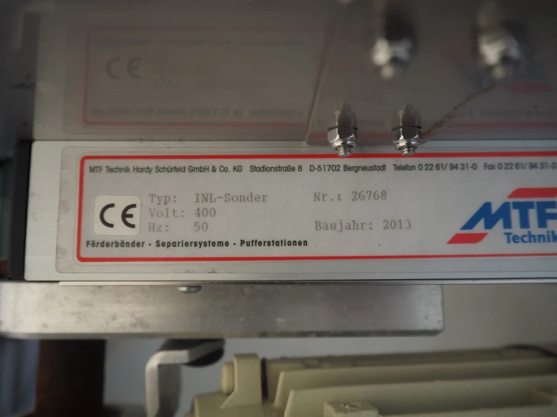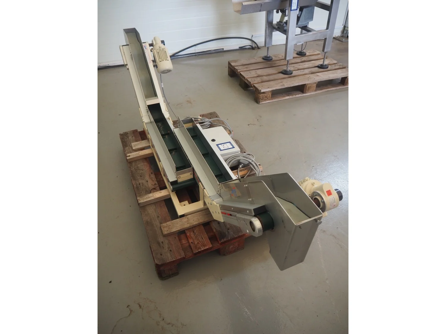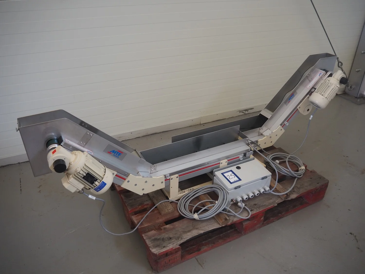 MTF Technik double elevating belt, type: INL-Sonder, number: 26768 and 26770, year of construction: 2013, 400 V, 50 Hz, belt width: (2x) 90 mm, elevating height: (2x) 600 mm, total dimensions: 2040 mm x 550 mm x 600 mm.