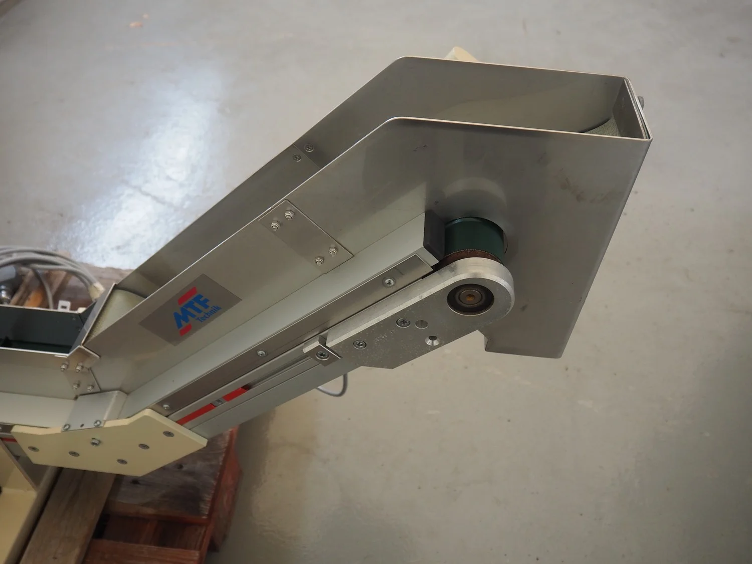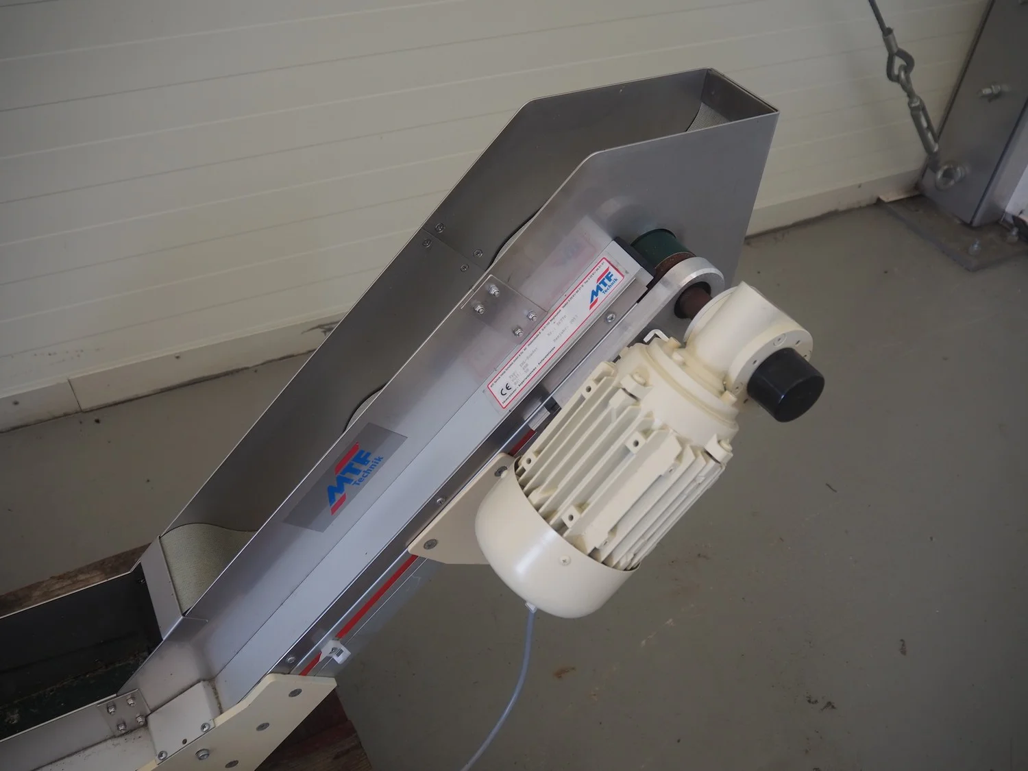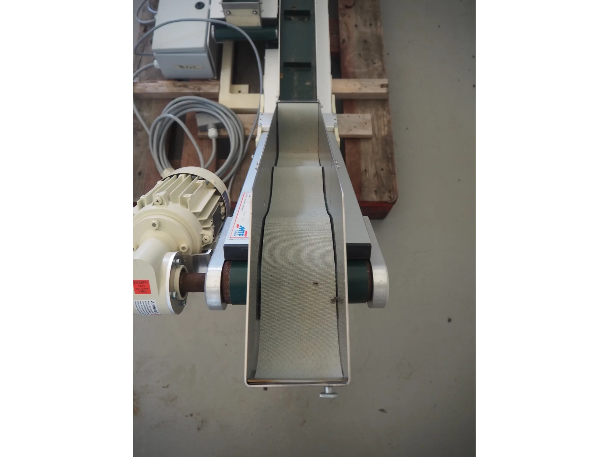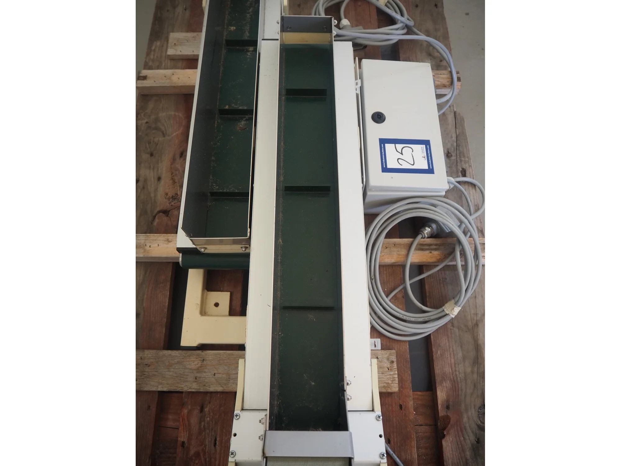 MTF Technik double elevating belt, type: INL-Sonder, number: 26768 and 26770, year of construction: 2013, 400 V, 50 Hz, belt width: (2x) 90 mm, elevating height: (2x) 600 mm, total dimensions: 2040 mm x 550 mm x 600 mm.