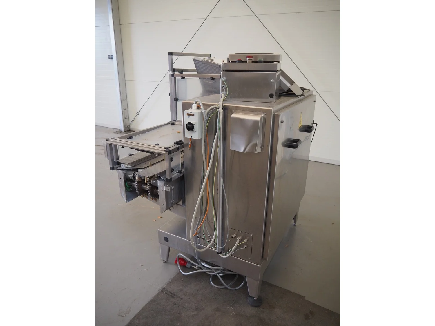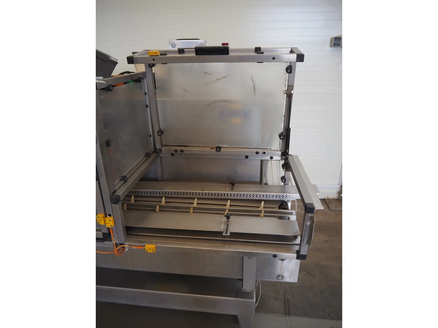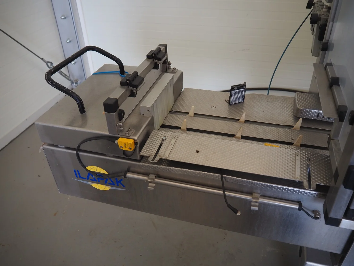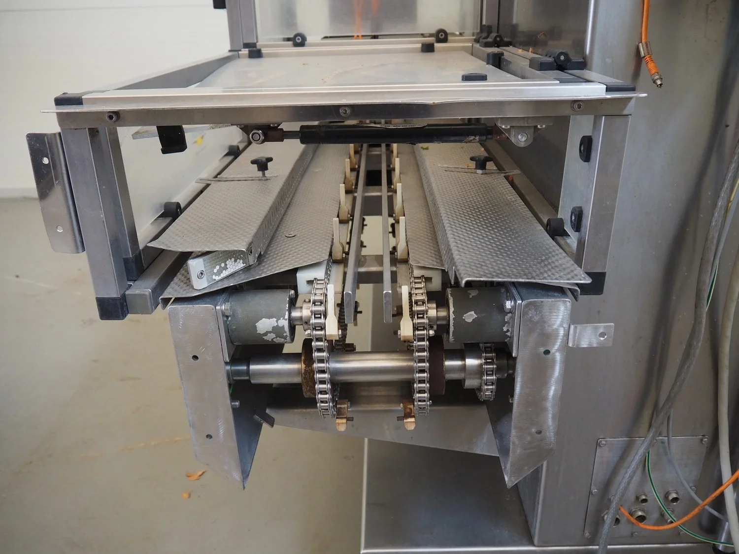 Ilapak Italia S.p.A. depositor for Ilapak Carrera 1000 flowpacker, year of construction: 2004, diameter hopper: 330 mm, height hopper: 350 mm, chain conveyor with dividers, distance between dividers: 150 mm, total dimensions: 2150 mm x 1150 mm x 1600 mm.