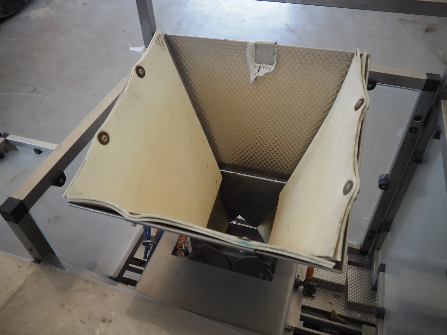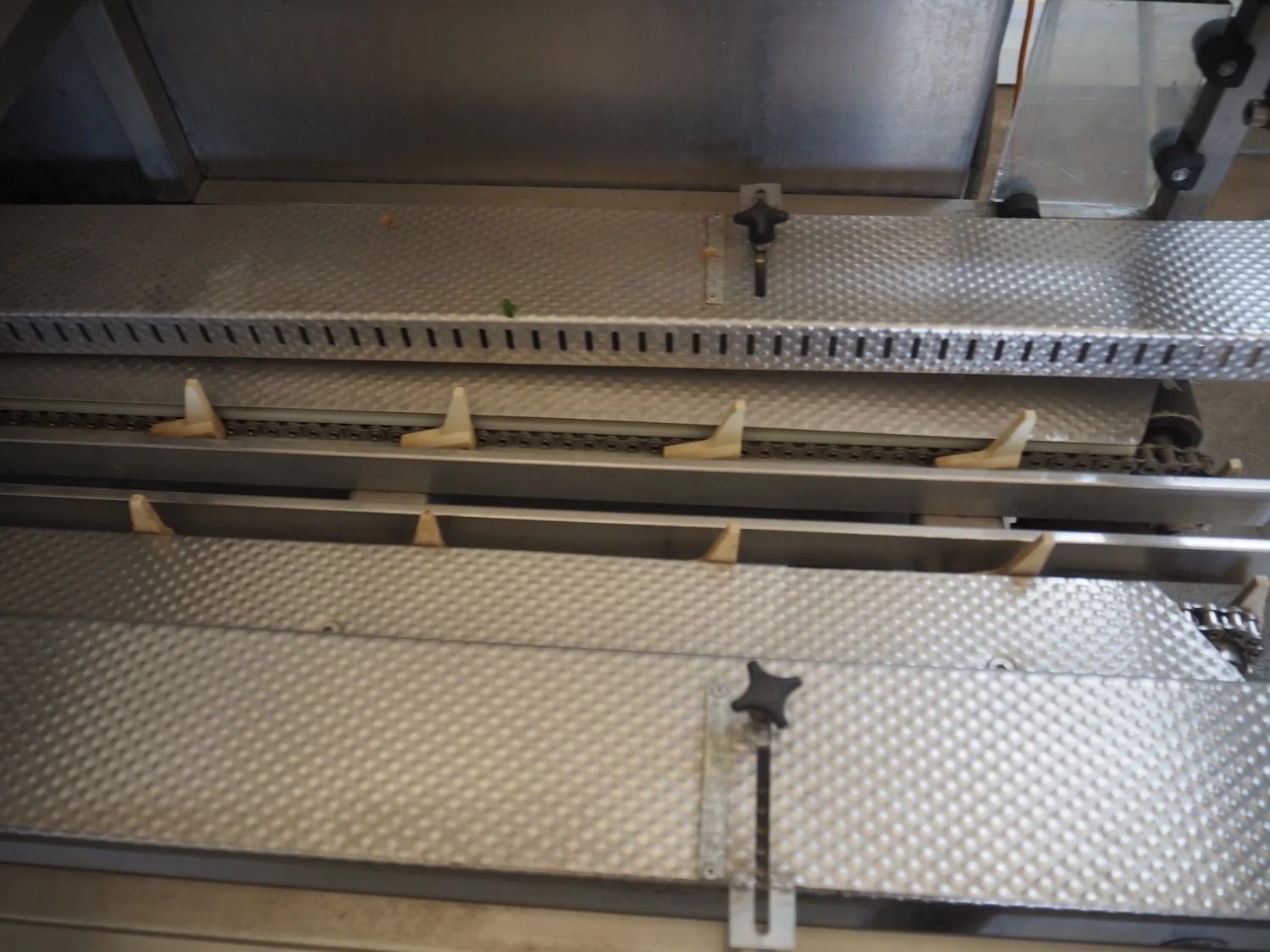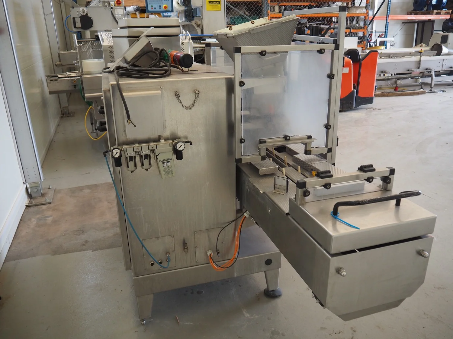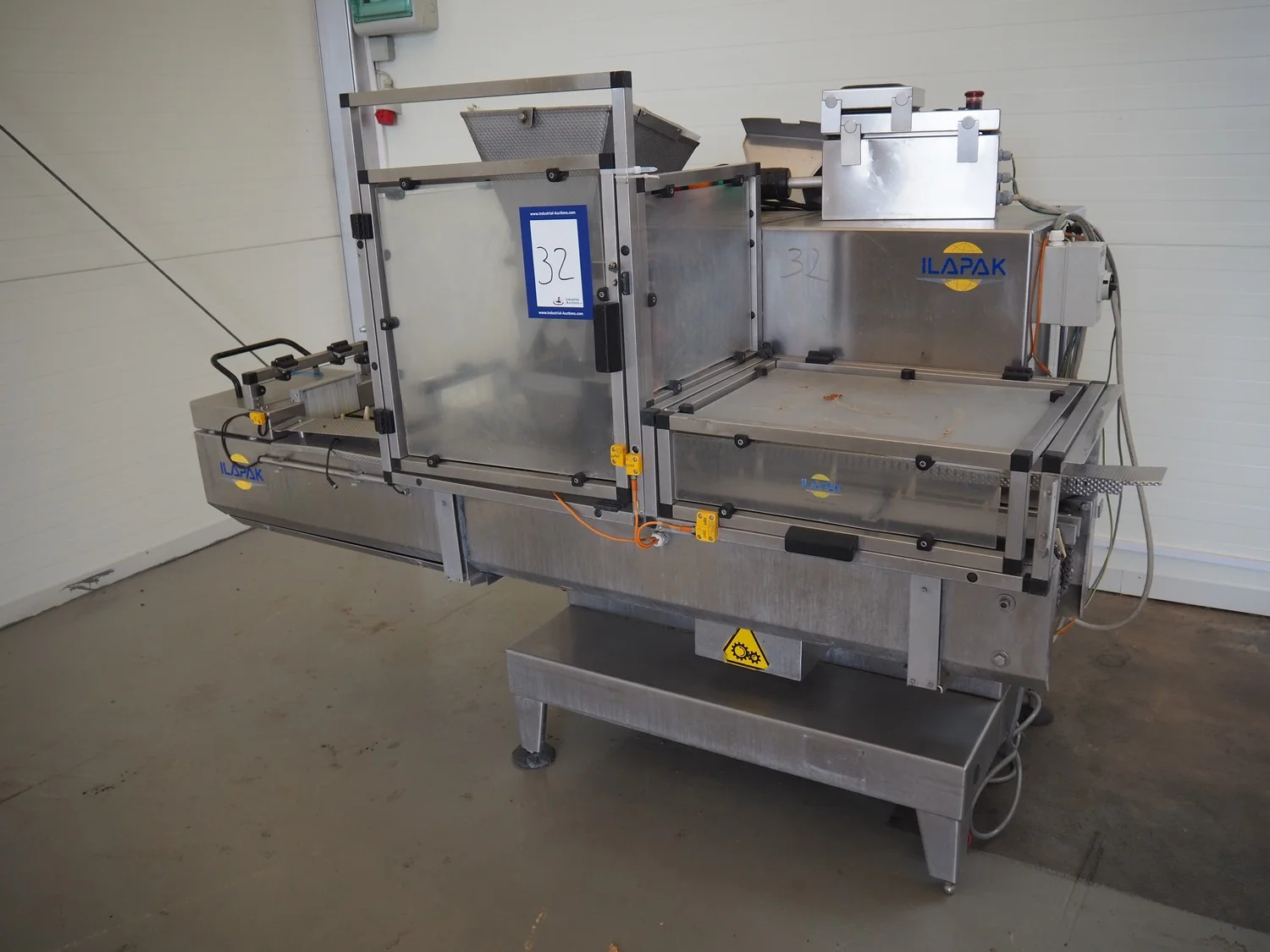 Ilapak Italia S.p.A. depositor for Ilapak Carrera 1000 flowpacker, year of construction: 2004, diameter hopper: 330 mm, height hopper: 350 mm, chain conveyor with dividers, distance between dividers: 150 mm, total dimensions: 2150 mm x 1150 mm x 1600 mm.