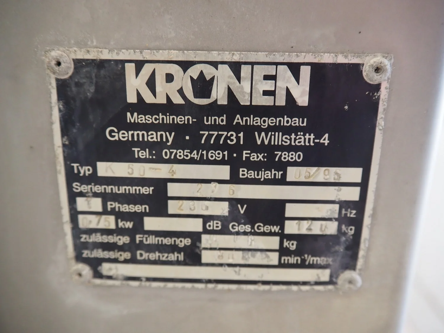Kronen vegetable centrifuge, type: K50-4, serial number: 276, year of construction: 05/95, 230 V, 1 Ph, 0.75 kW, dimensions: 1000 mm x 750 mm x 1000 mm.