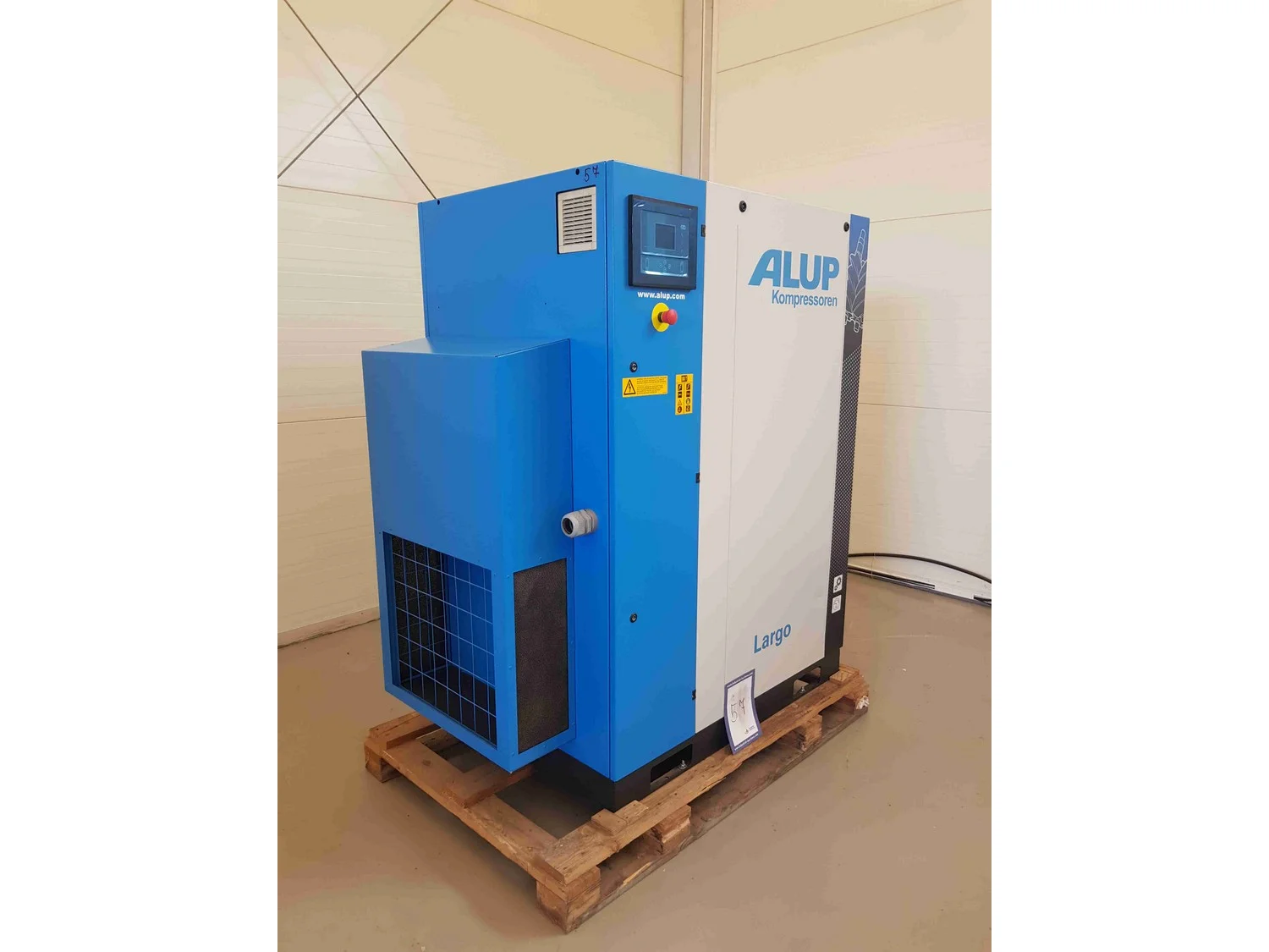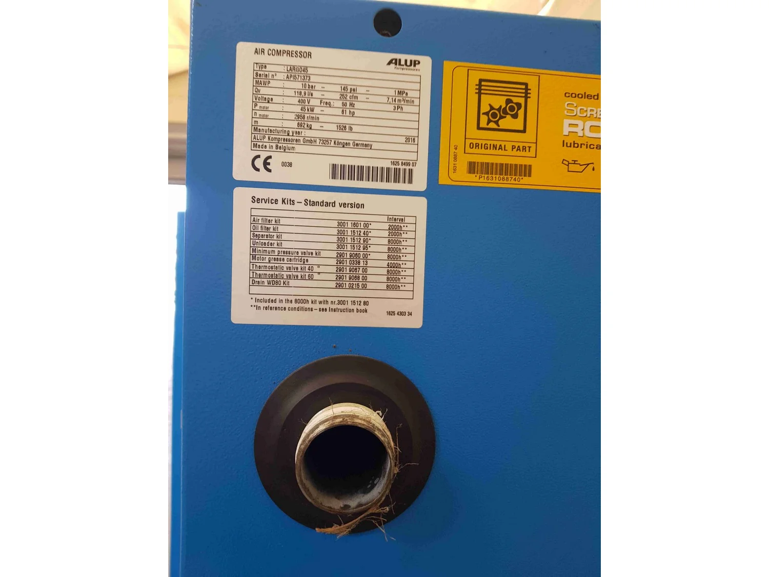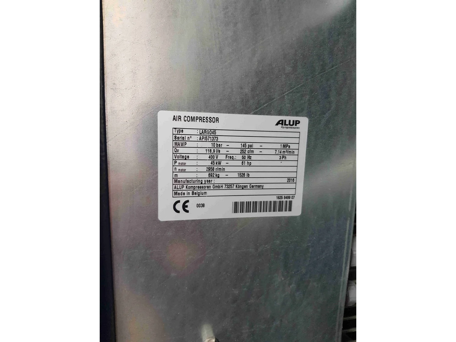 Alup Kompressoren air compressor, type: LARGO45, serial number: API571373, year of construction: 2016, 400 V, 3 Ph, 50 Hz, 45 kW, maximum working pressure: 10 bar, volume: 7.14 m³ per minute, dimensions: 1700 mm x 1000 mm x 2000 mm.