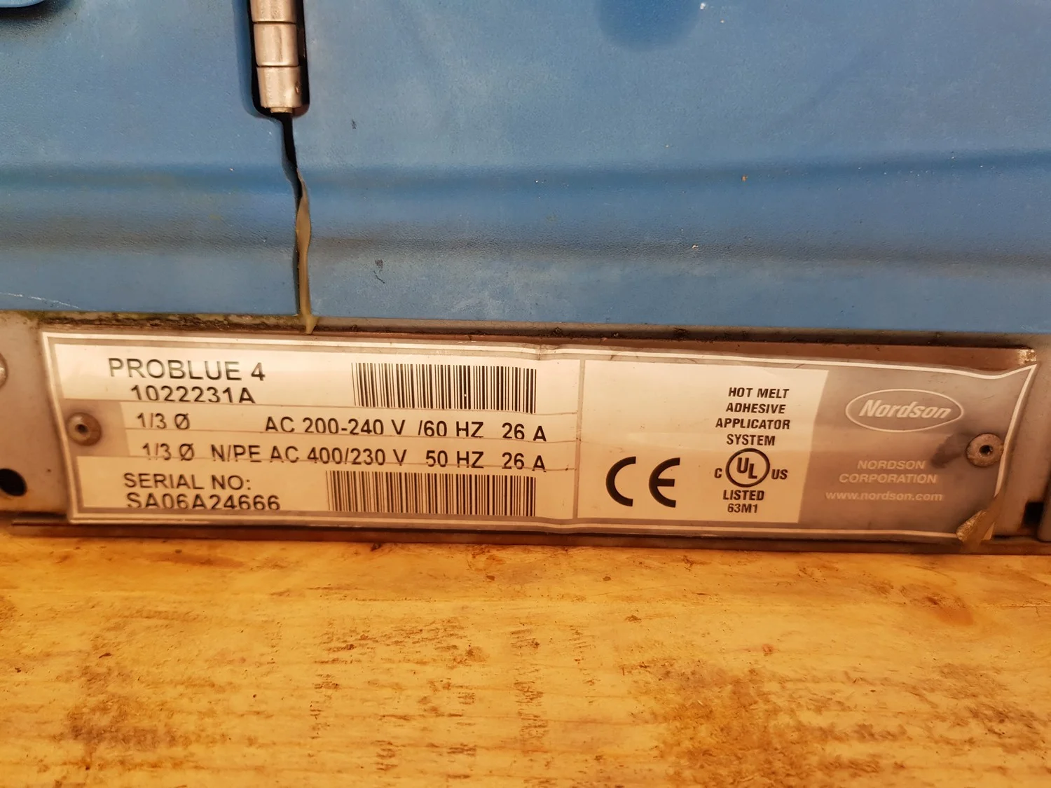 Nordson glue unit, type: Problue 4, serial number: SA06A24666, 200-240 V, 60 Hz, 26 A, dimensions: 600 mm 450 mm x 500 mm.