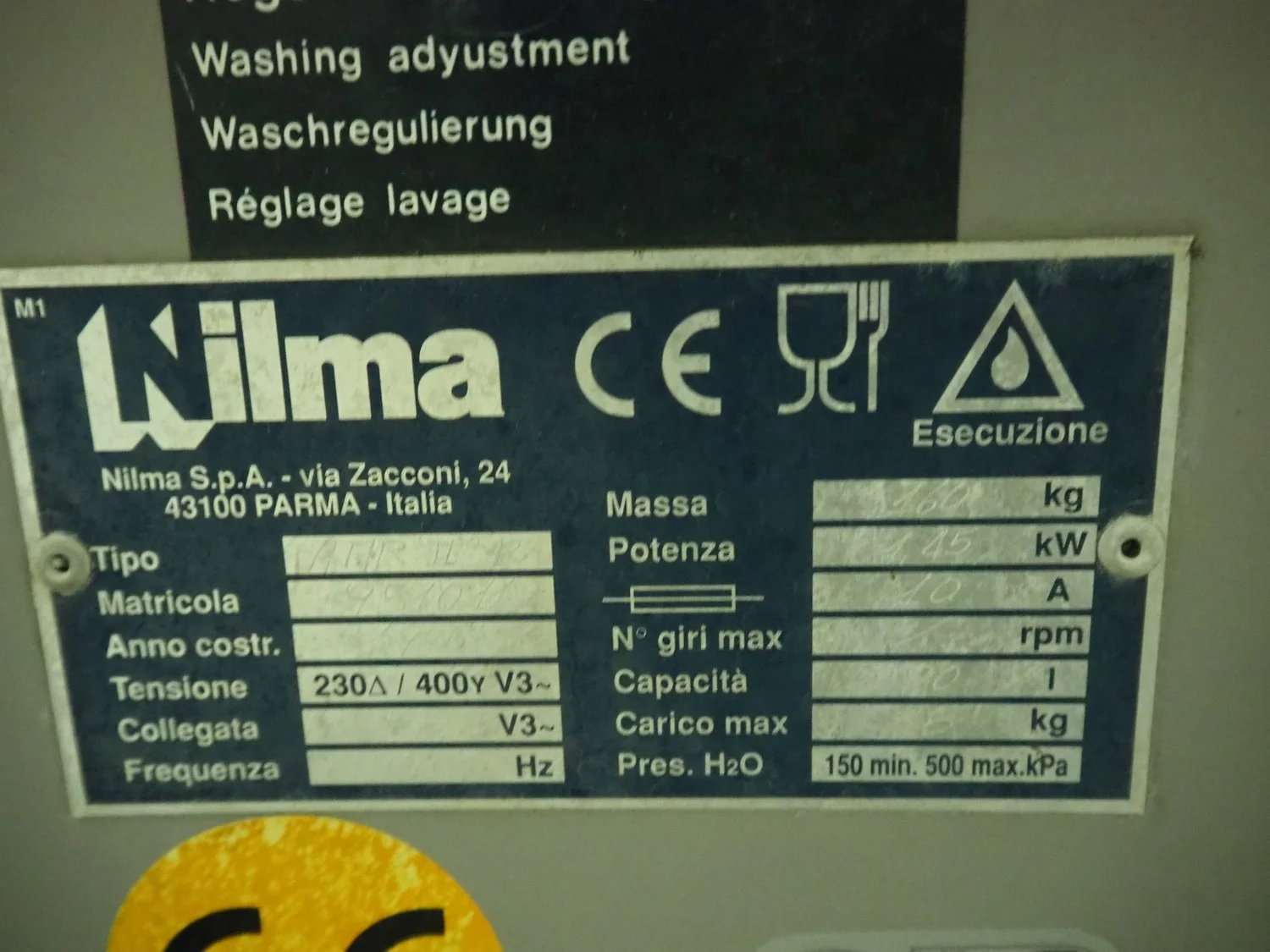 Nilma washing machine, type: ATIR II-R, 220/400 V, 3 Ph, 50 Hz, 10 A, 1.45 kW, weight: 160 kg, inside dimensions: 800 mm x 650 mm x 600 mm, total dimensions: 1300 mm x 1100 mm x 1100 mm.