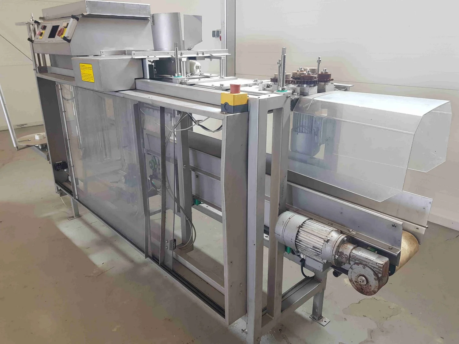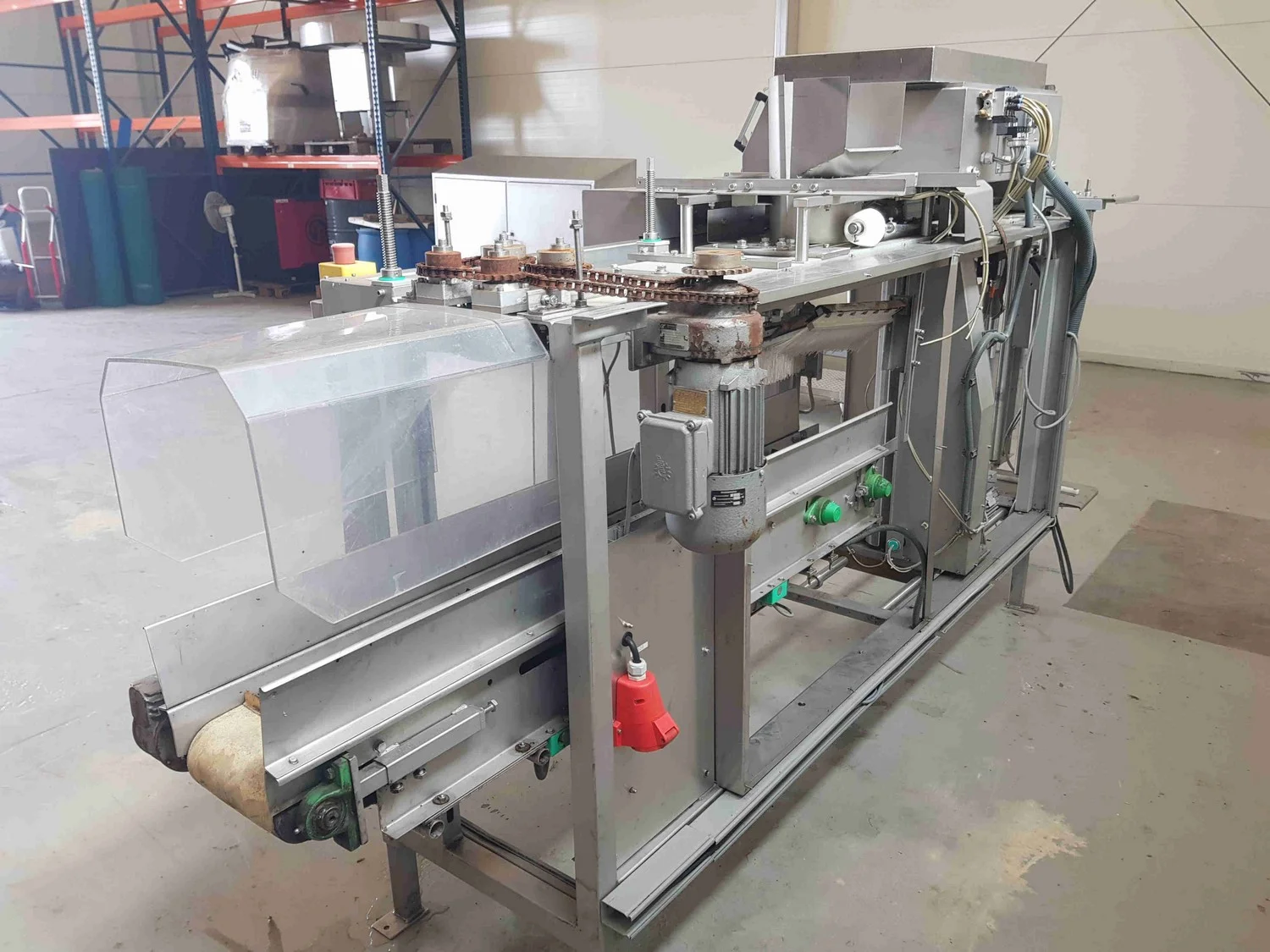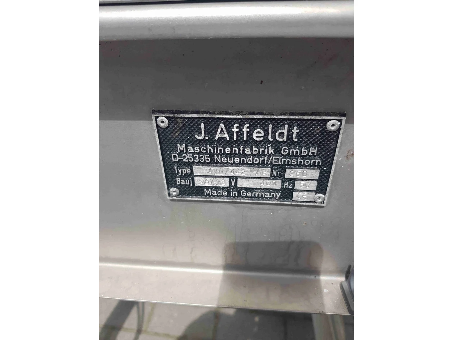 Affeldt Machinenbau GmbH horizontal bag filling machine, type: AVN 442 V/G, number: 960, year of construction: 96/12, 400V, 50 Hz, belt width: 200 mm, divider height: 20 mm, distance between dividers: 200 mm, total dimensions: 3400 mm x 1200 mm x 1700 mm.