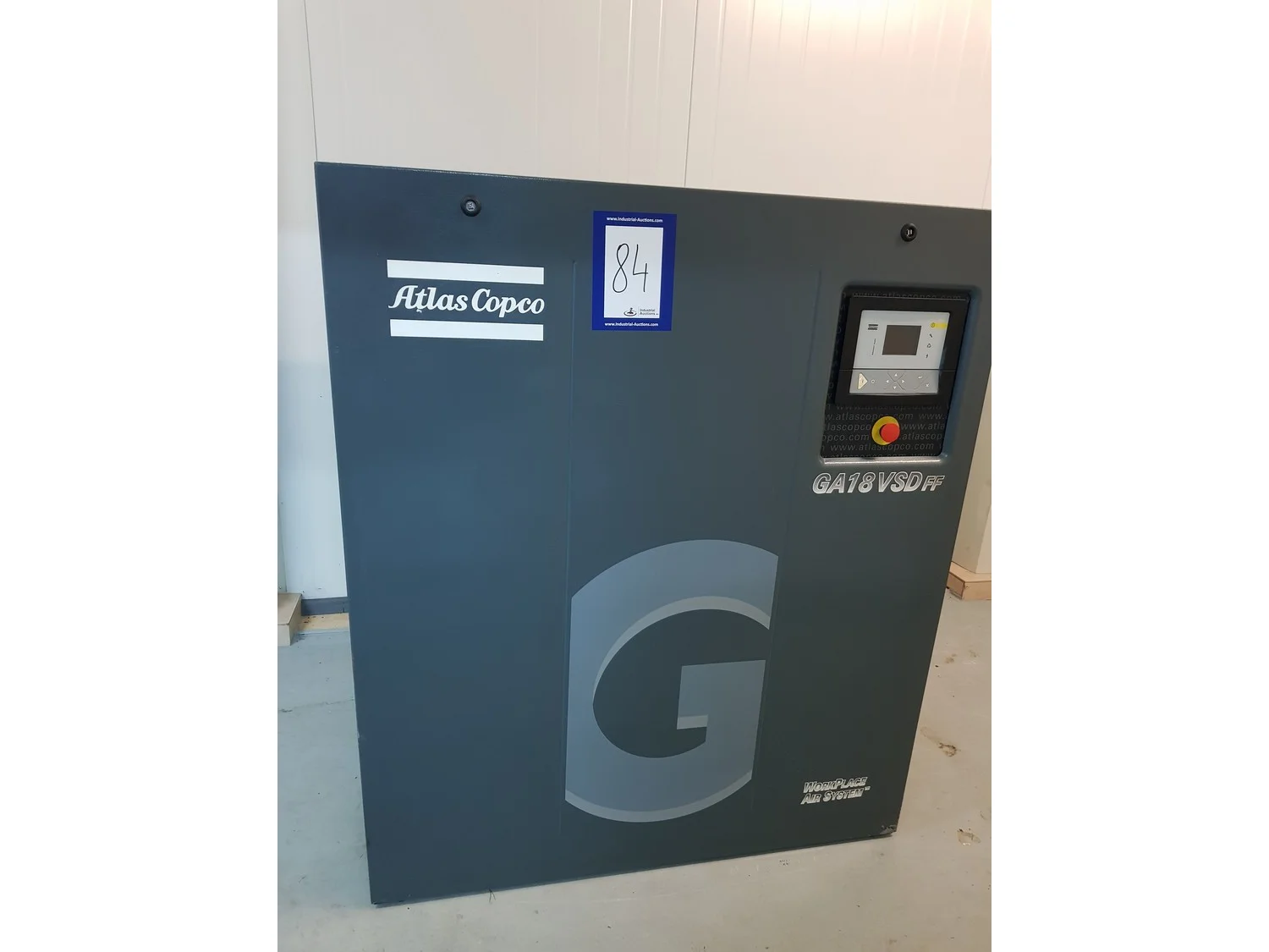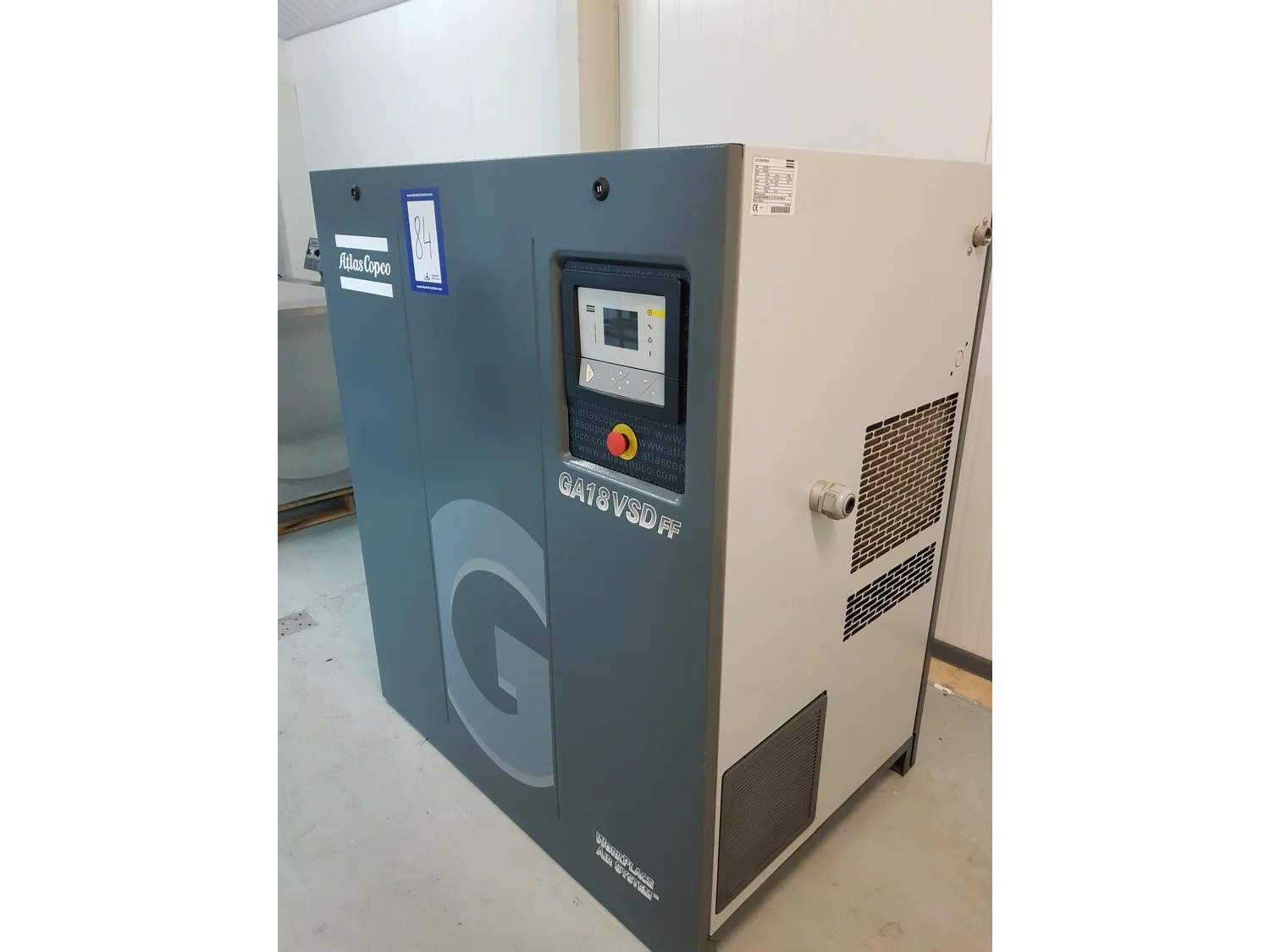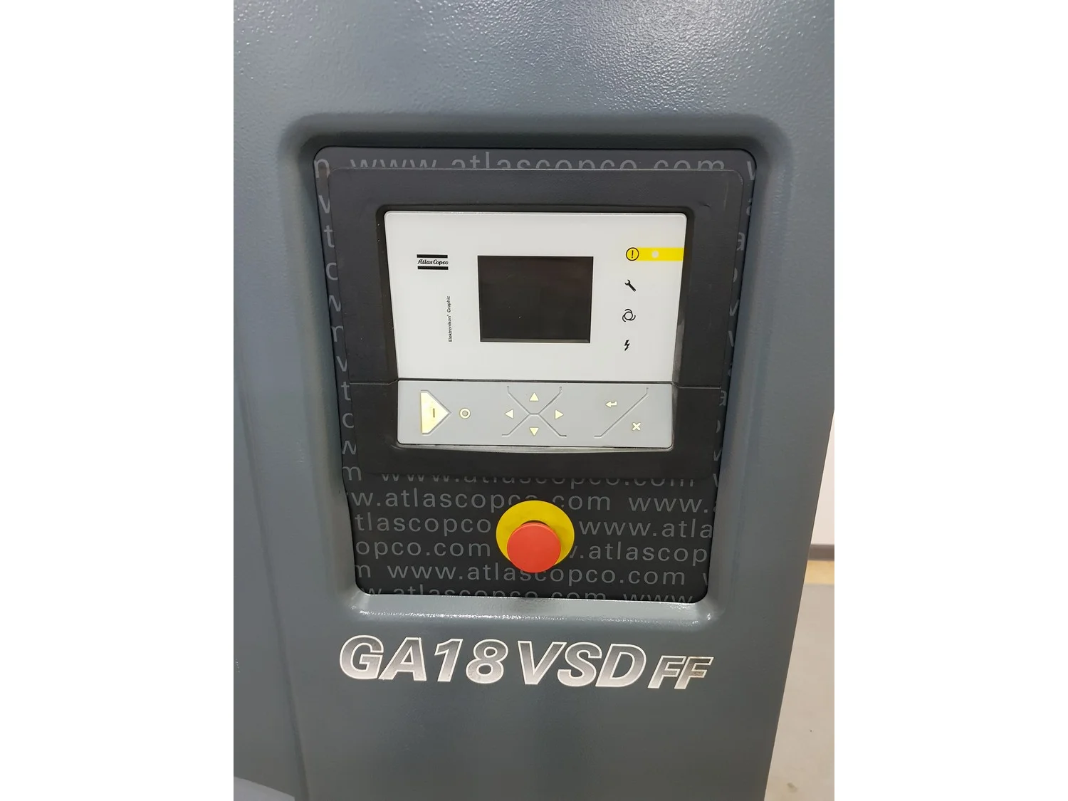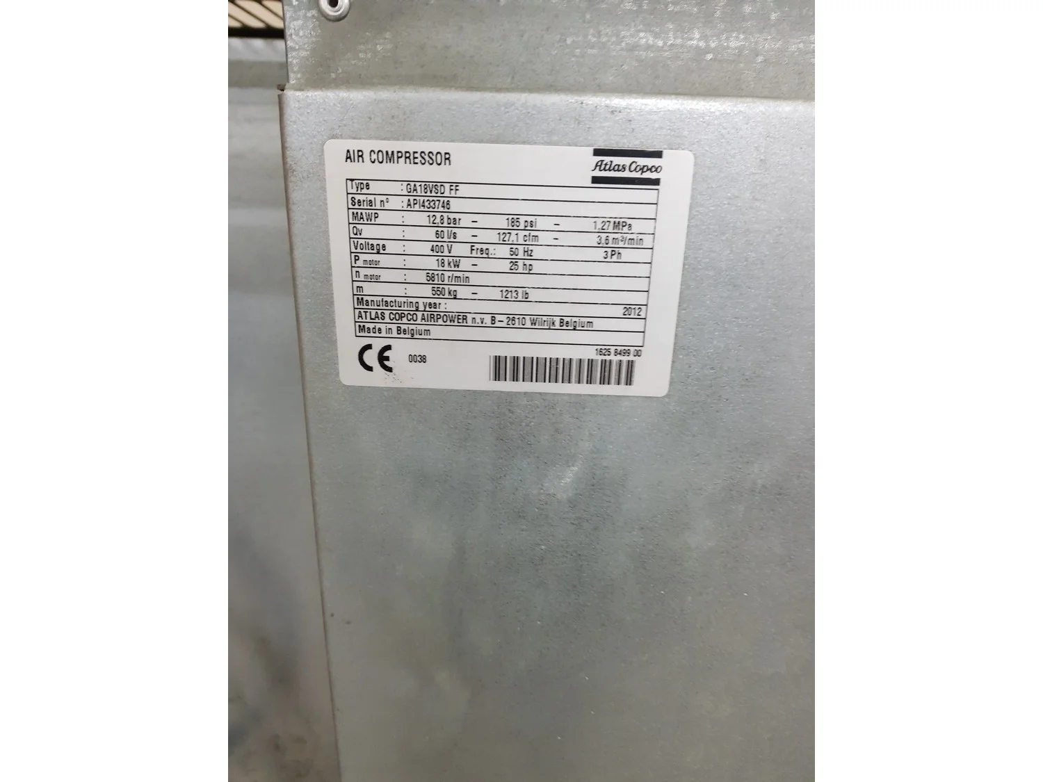 Atlas Copco screw compressor, type: GA18VSD FF, serial number: AP1433746, year of construction: 2012, 400 V 3 Ph, 50 Hz, 18 kW, 12.8 bar, weight: 550 kg, dimensions: 1300 mm x 900 mm x 1500 mm.