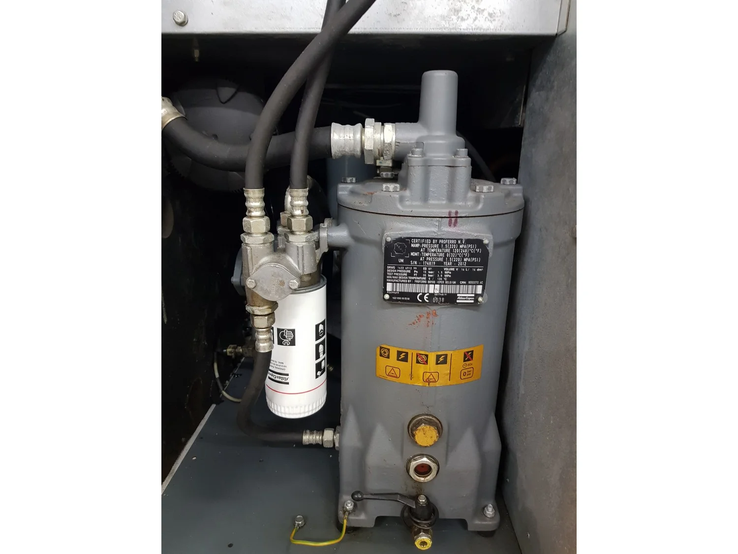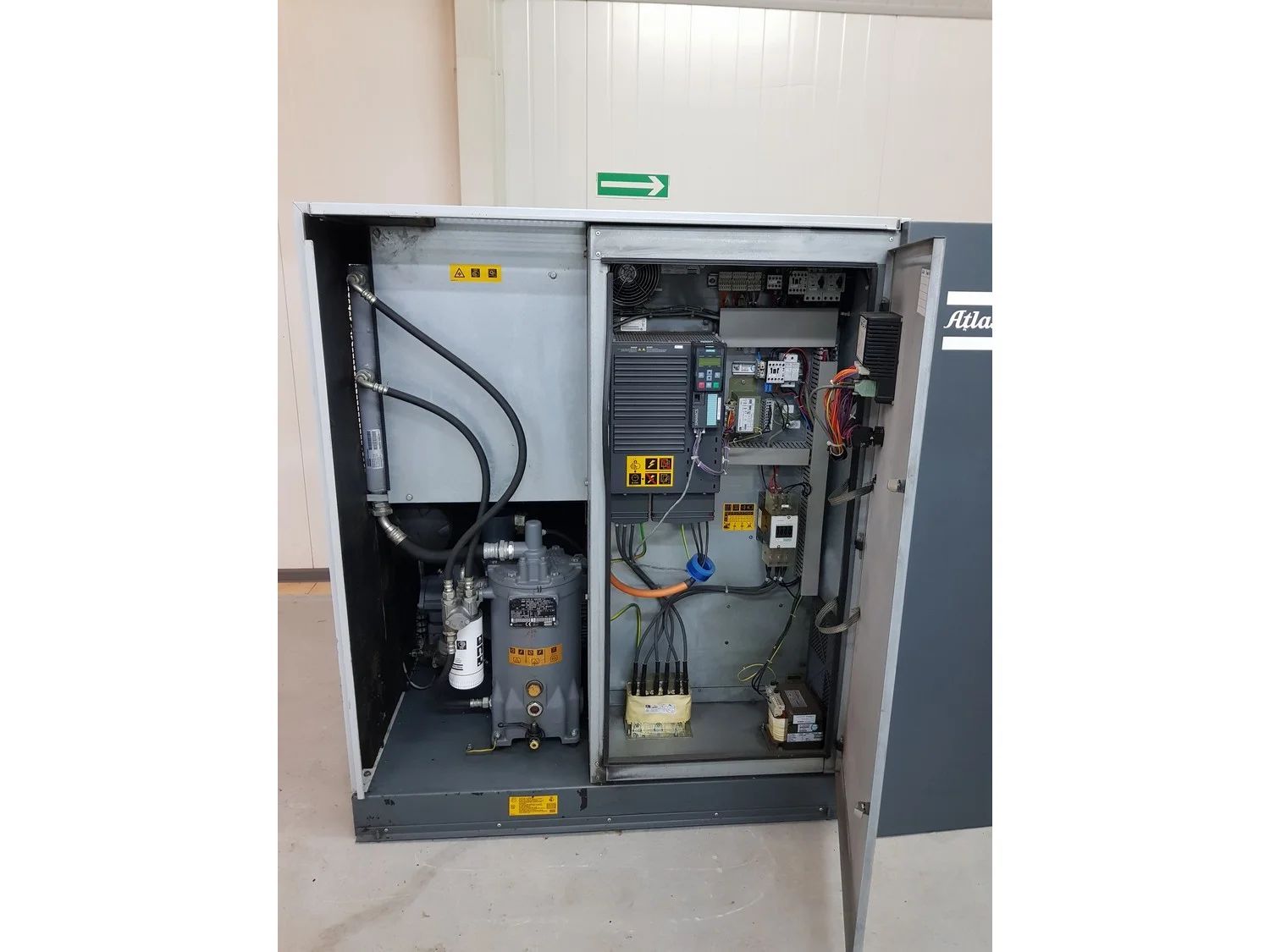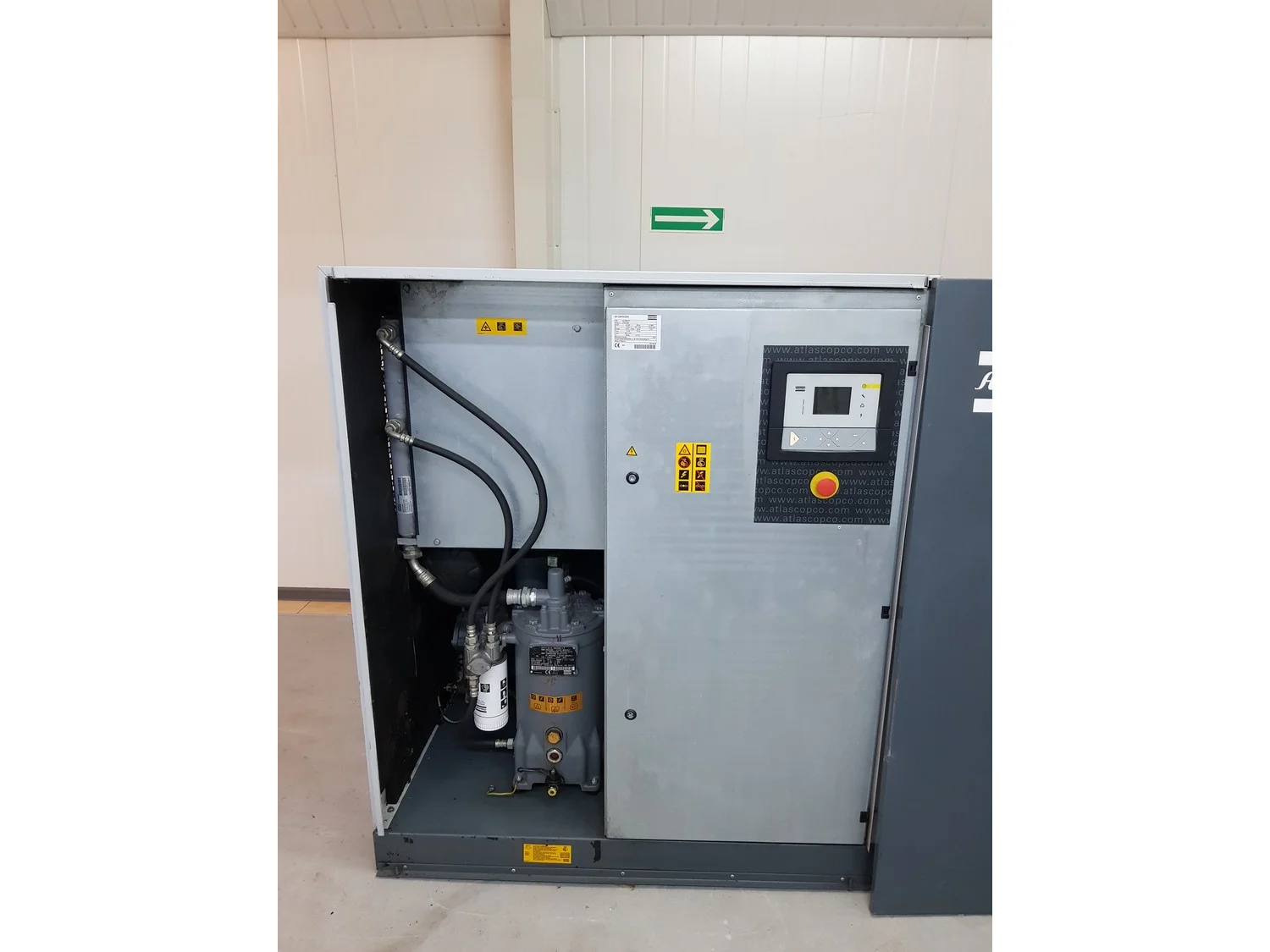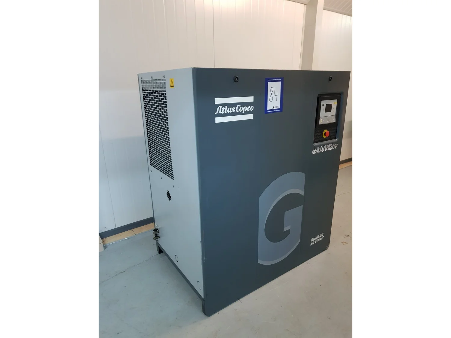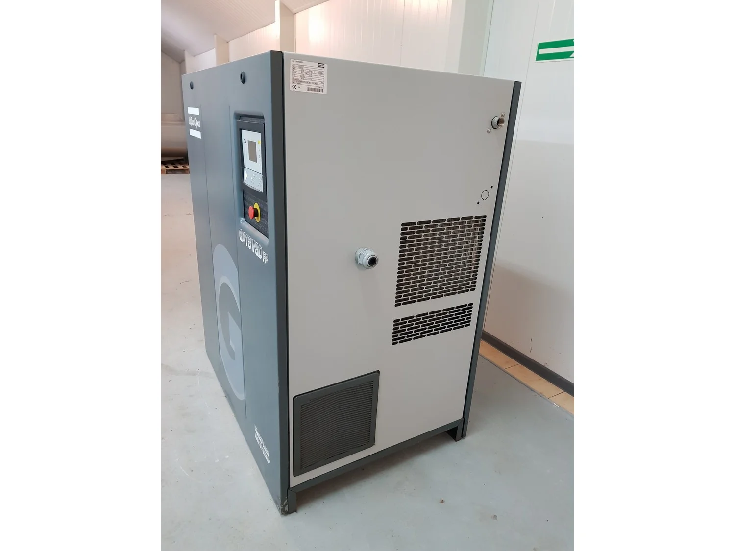 Atlas Copco screw compressor, type: GA18VSD FF, serial number: AP1433746, year of construction: 2012, 400 V 3 Ph, 50 Hz, 18 kW, 12.8 bar, weight: 550 kg, dimensions: 1300 mm x 900 mm x 1500 mm.
