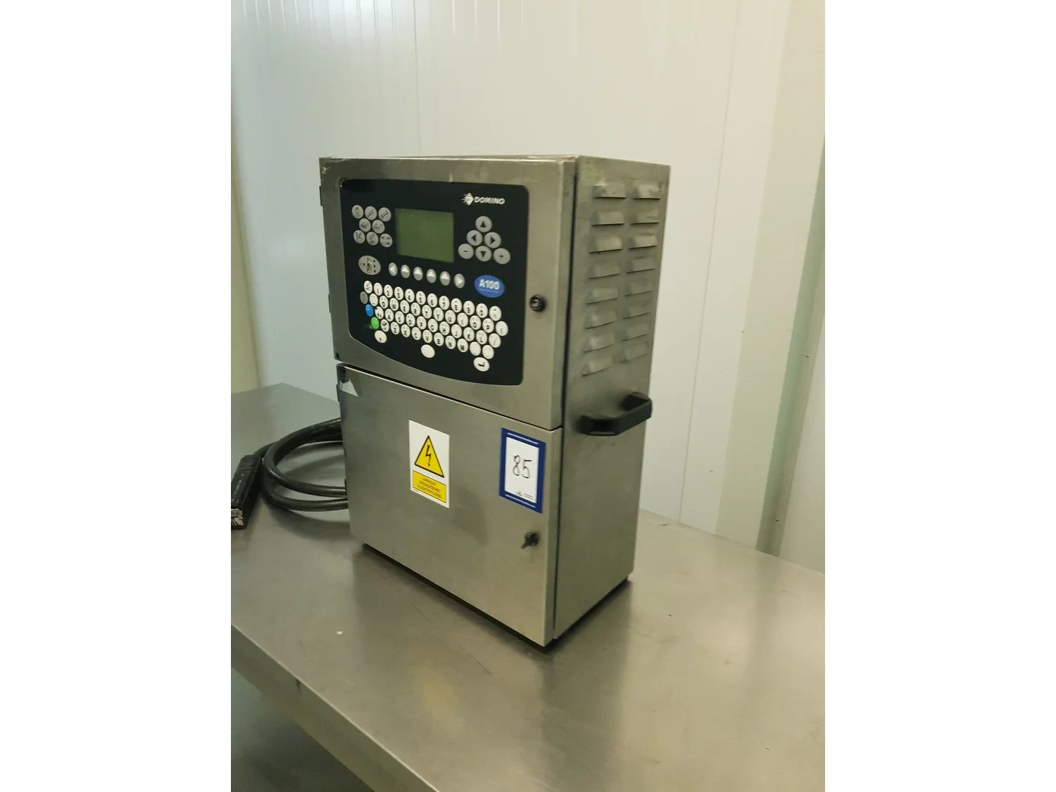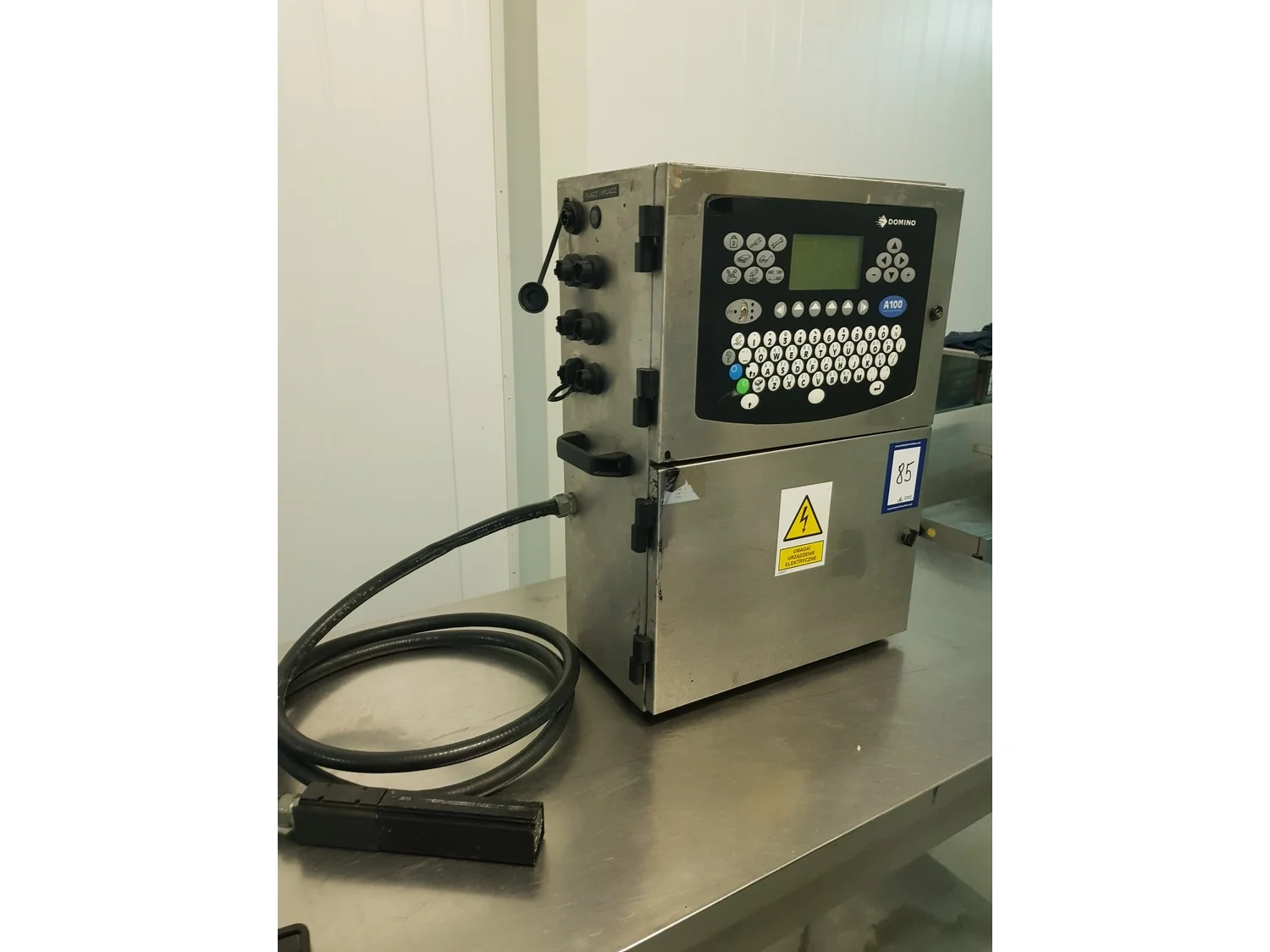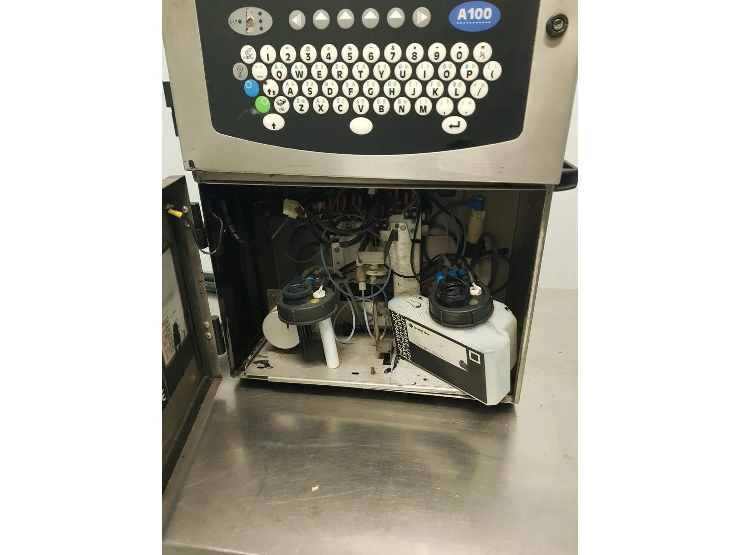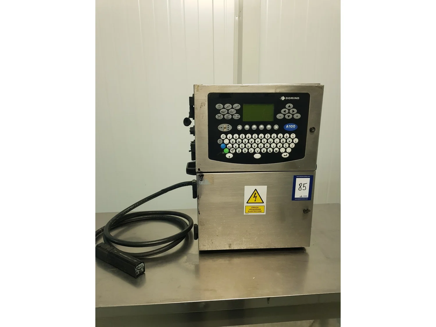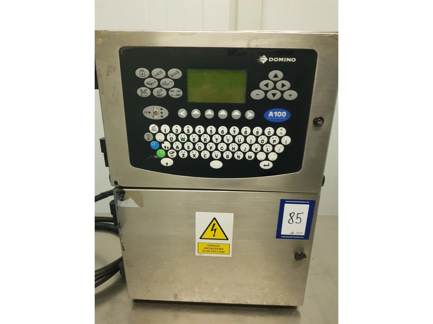 Domino inkjet printer, model: A100, serial number: N1A09056, dimensions: 600 mm x 350 mm x 750 mm. Incomplete.