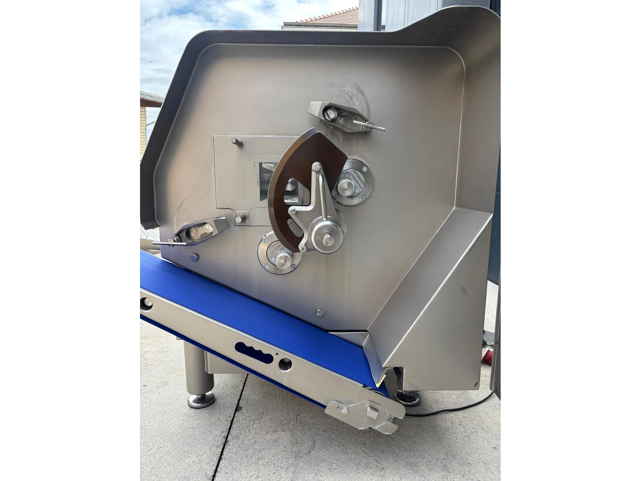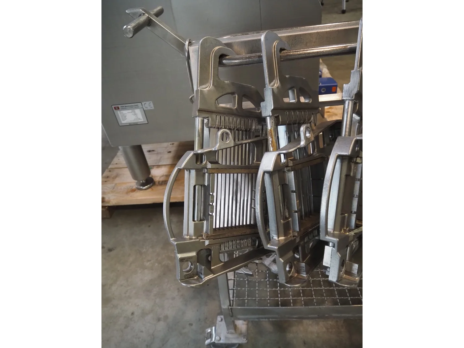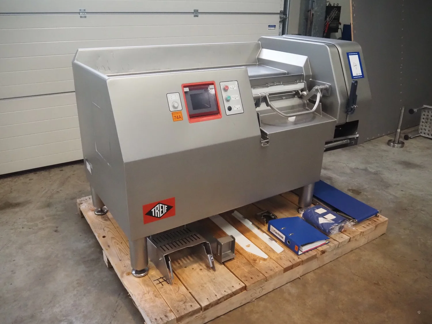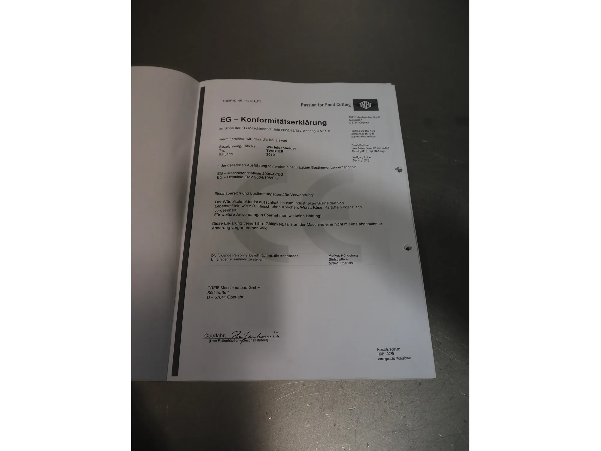 Treif dicer, model: Twister, machine number: 412006.158091.109783, year of construction: 2010, 380-480 V, 3 Ph, 50/60 Hz, 10-8 A, 4.5 kW, 670 kg, dimensions chamber:120 mm x 120 mm, plastic outfeed belt, belt width 240 mm, total dimensions: 1950 mm x 1500 mm x 1300 mm. With trolley with grids.