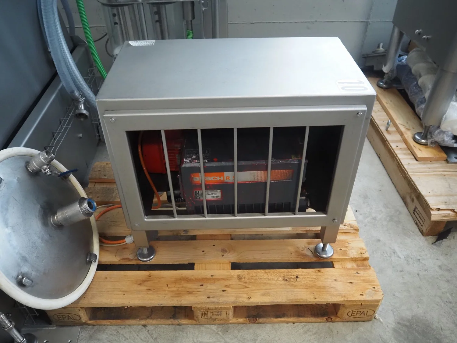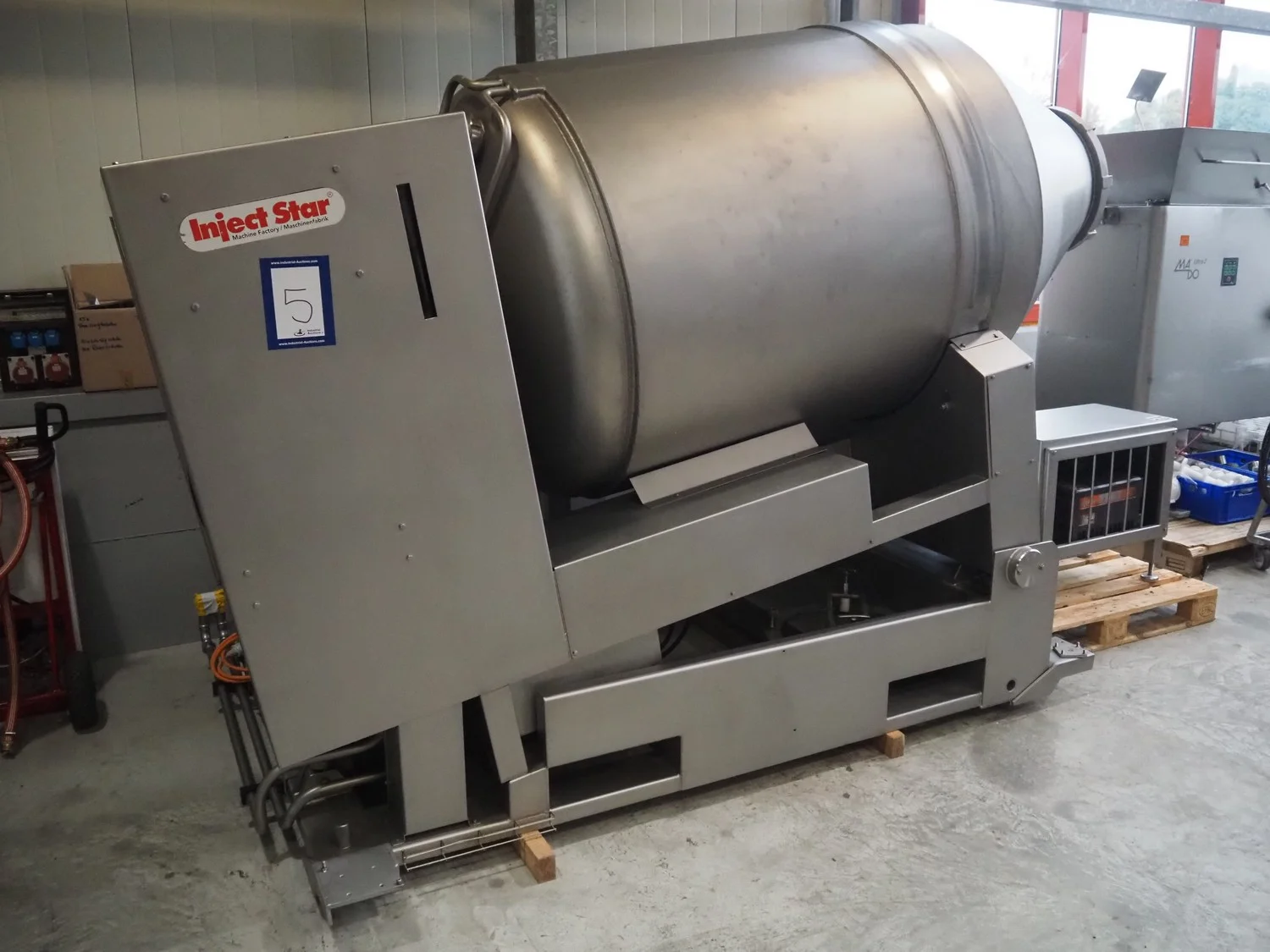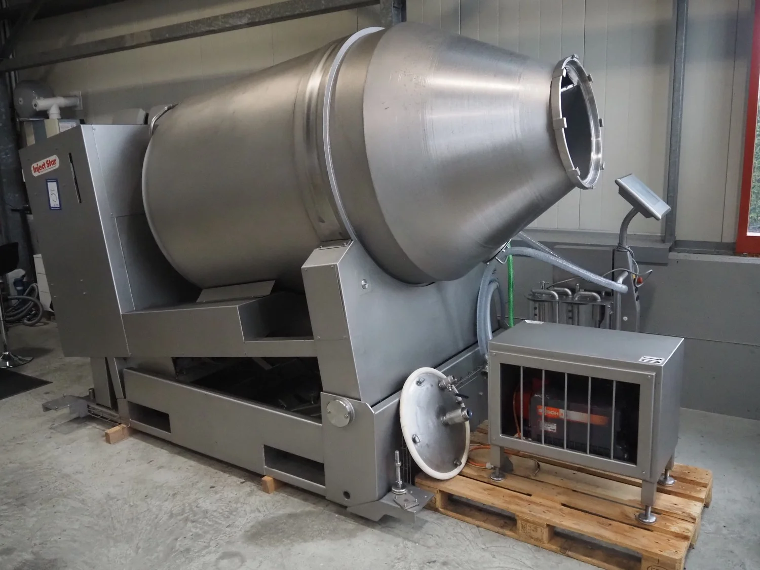 Inject Star cooled tiltable vacuum tumbler, model: Magnum 2600-CSL, number: MAG2600-141, year of construction: 2008, 400 V, 3 Ph, 50 Hz, 9 kW, volume: 2600 liter, dimensions: 3900 mm x 2350 mm x 2600 mm. With cabinet with Busch vacuum pump, type: RA 0063 F 4S3, number: 100063962, year of construction: 2010, capacity: 63 m³ per hour.