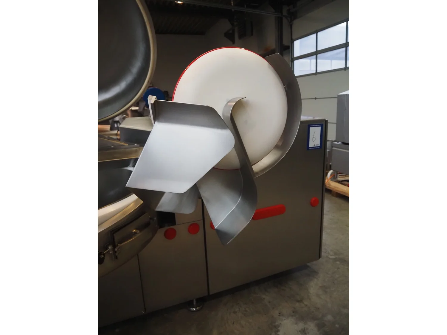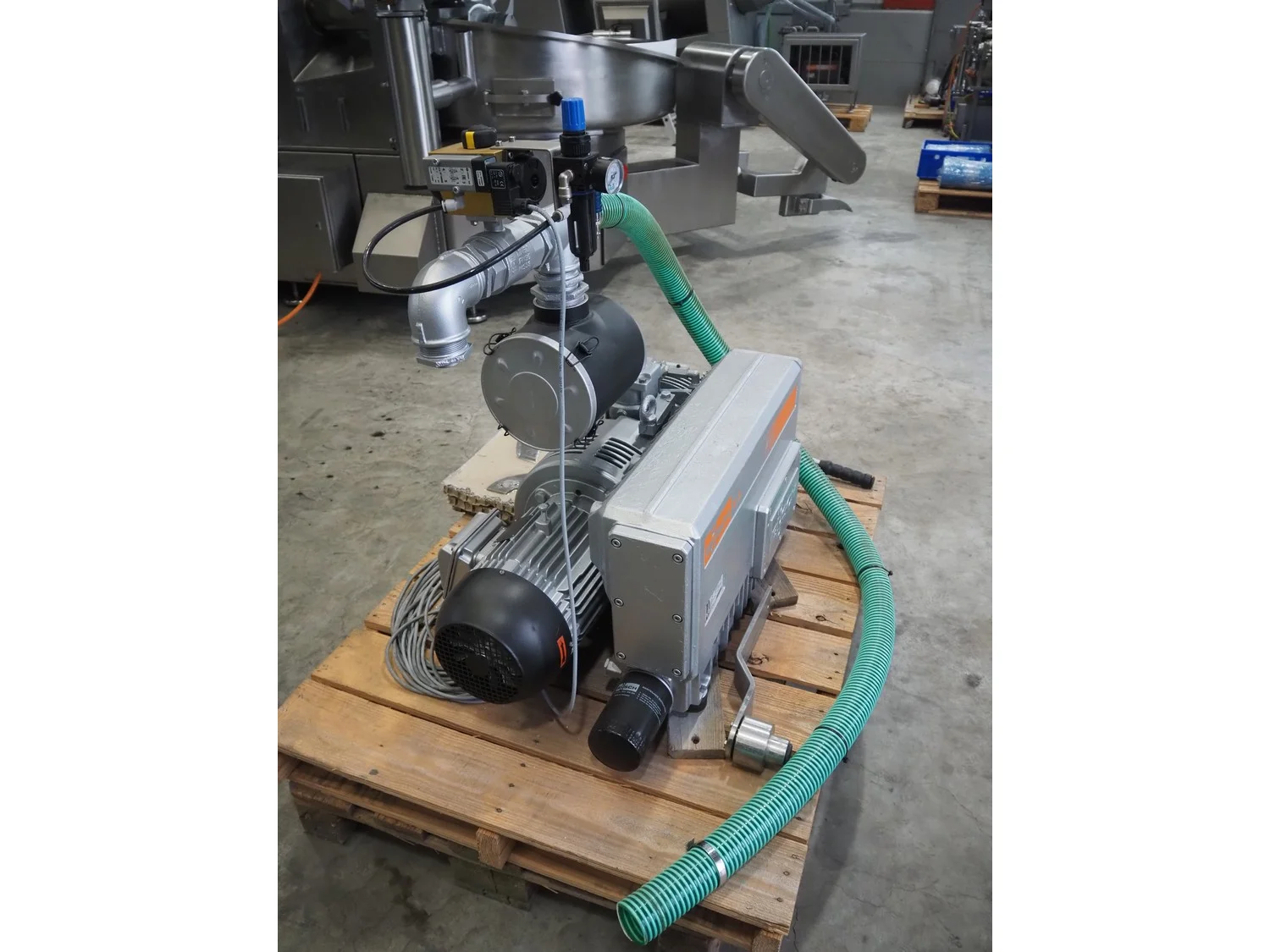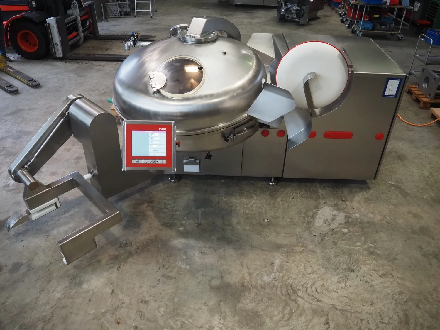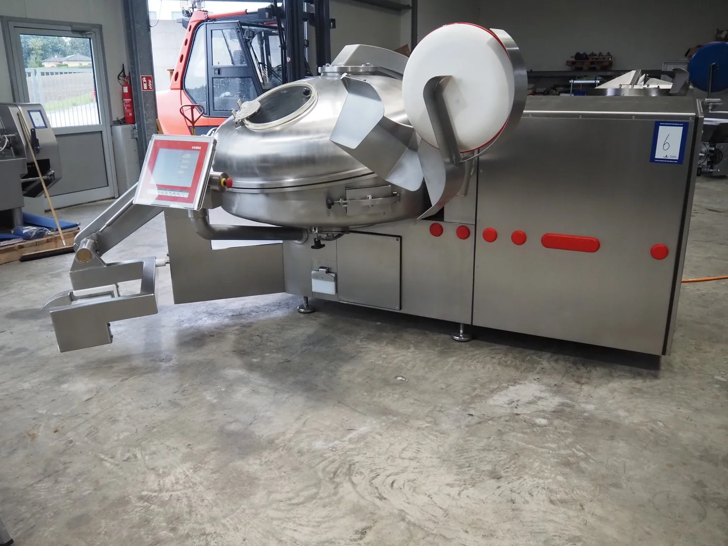 Laska vacuum cutter with lifter for meat bins and ejector, type: KU 200 V.DC, machine number: 14215, year of construction: 2012, 400 V, 3 PH, 60 Hz, 260 A, 103 kW, s/s bowl, volume: 200 liter, dimensions: 3300 mm x 2300 mm x 2000 mm. With Busch vacuum pump, type: RA 0160 D 5Z1 VRXZ, number: C1209000354, year of construction: 2012, capacity: 160 m³ per hour, and spare knife set. Completely overhauled.