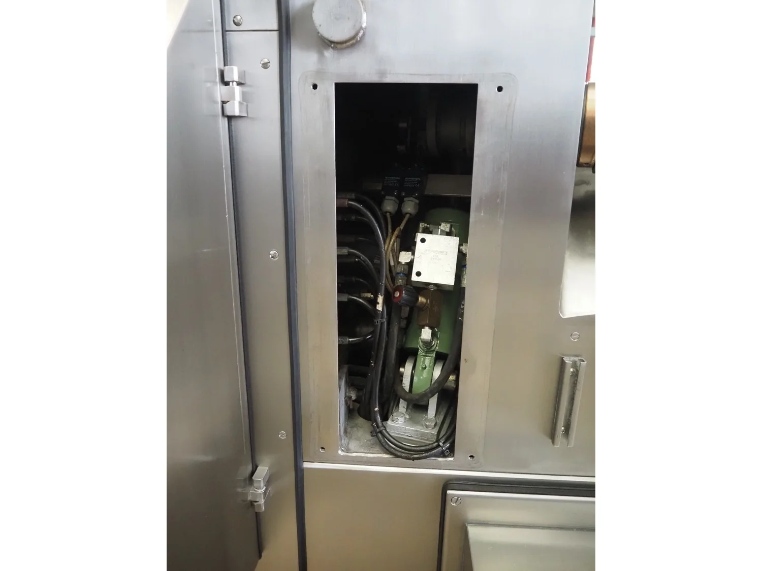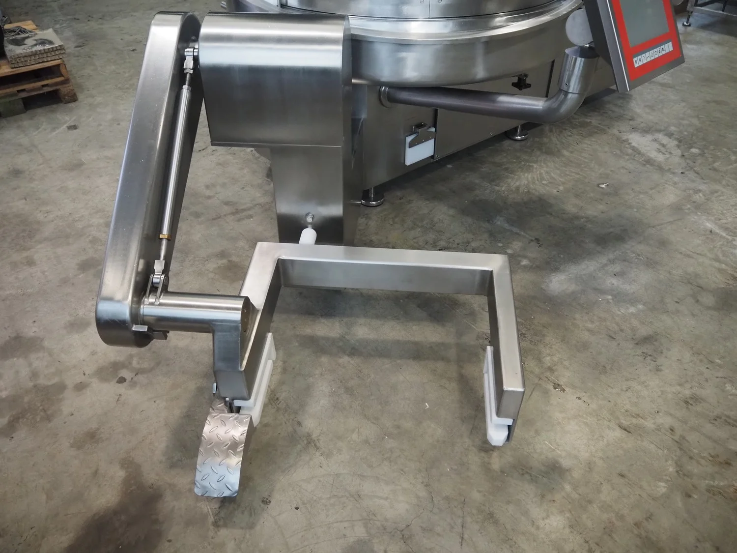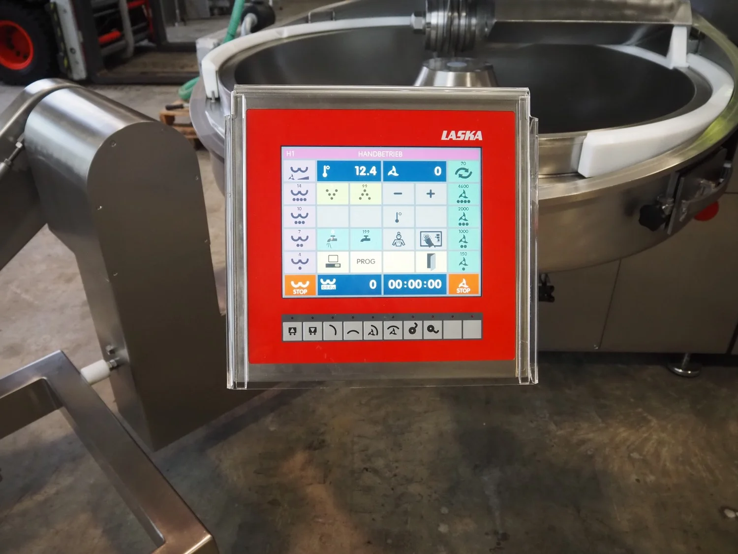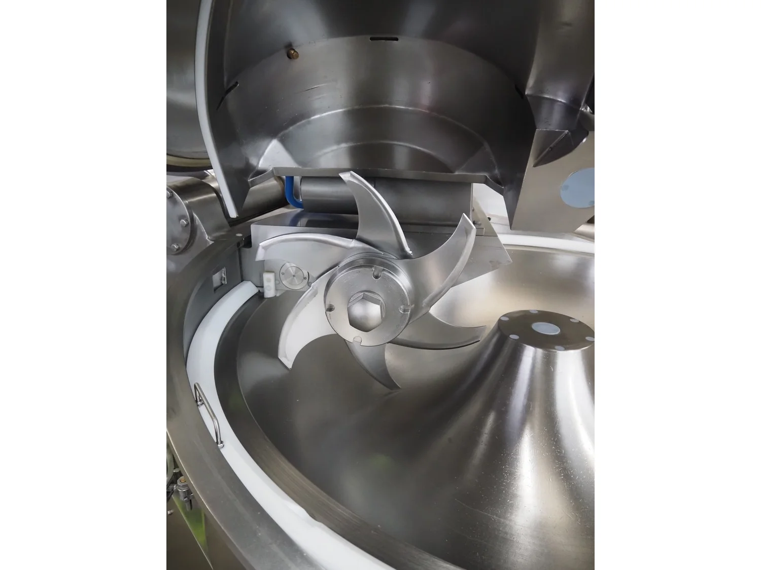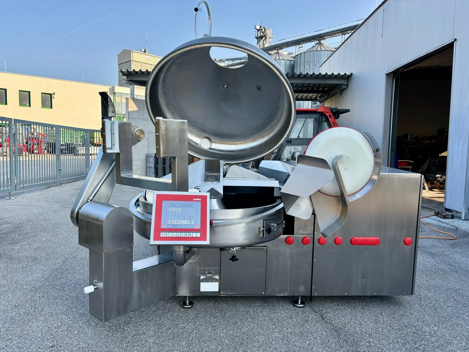 Laska vacuum cutter with lifter for meat bins and ejector, type: KU 200 V.DC, machine number: 14215, year of construction: 2012, 400 V, 3 PH, 60 Hz, 260 A, 103 kW, s/s bowl, volume: 200 liter, dimensions: 3300 mm x 2300 mm x 2000 mm. With Busch vacuum pump, type: RA 0160 D 5Z1 VRXZ, number: C1209000354, year of construction: 2012, capacity: 160 m³ per hour, and spare knife set. Completely overhauled.