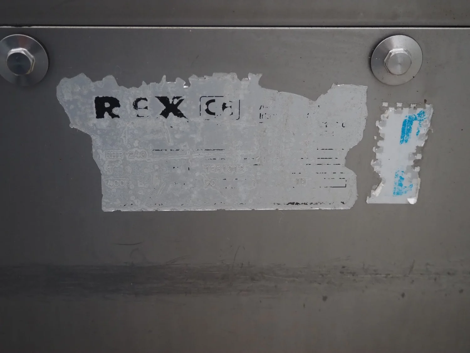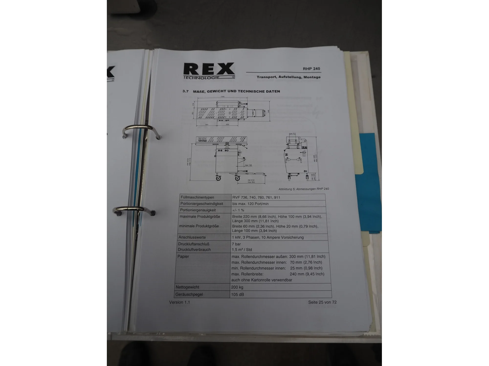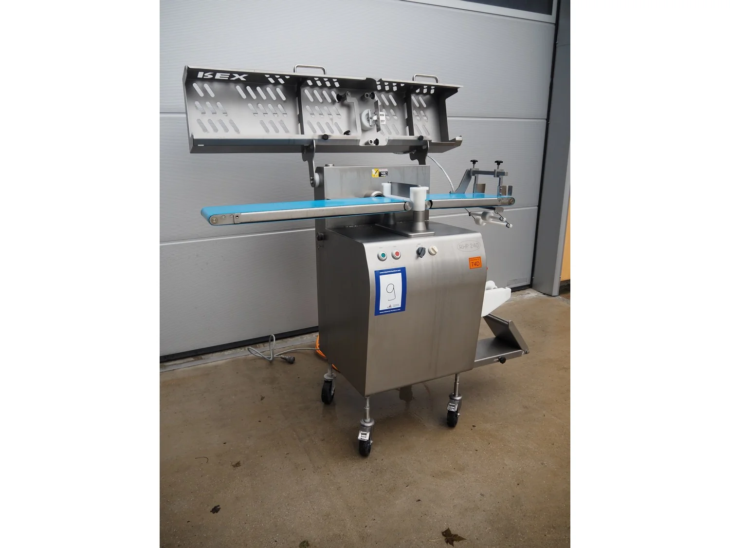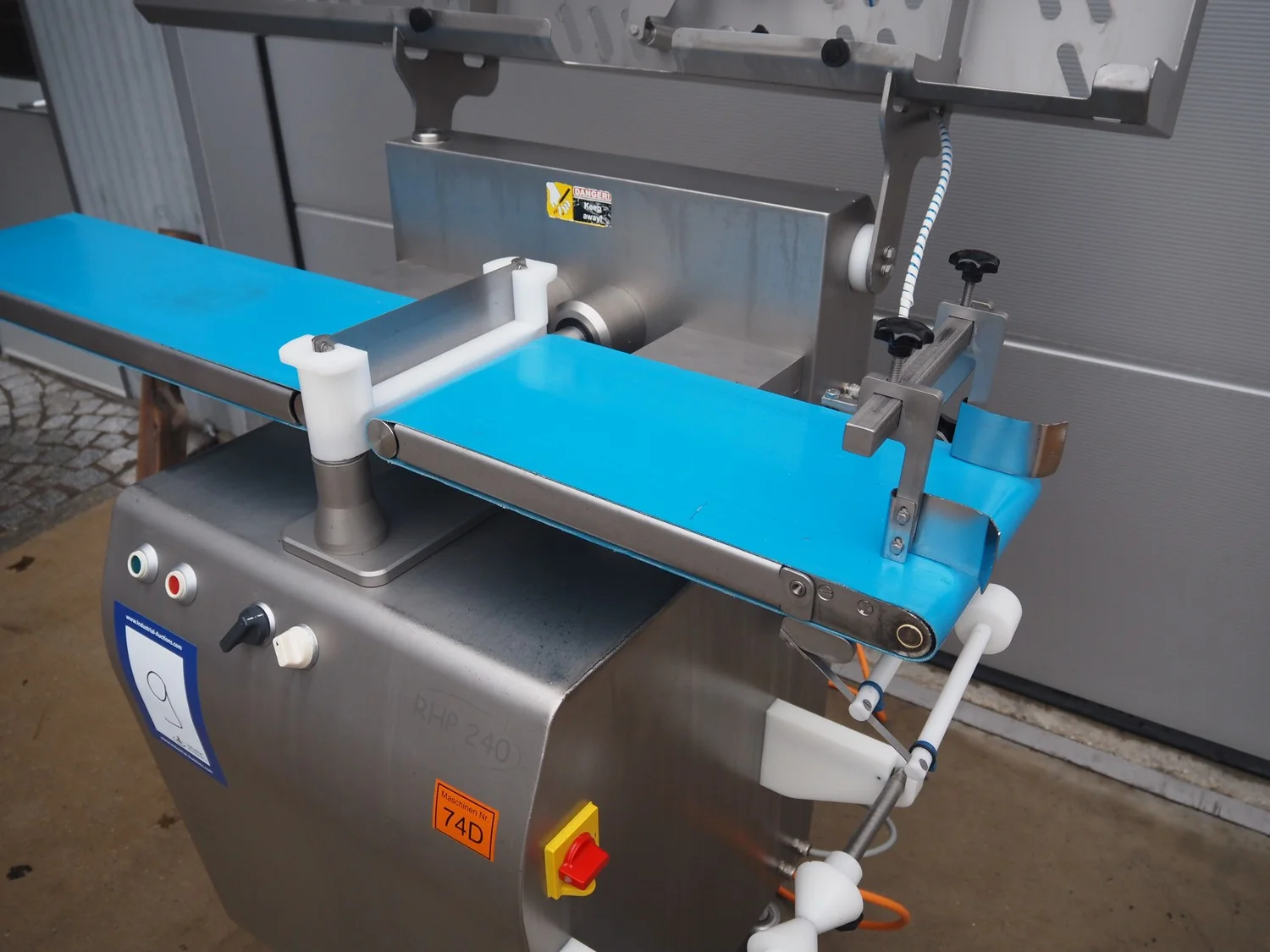 Rex mobile portioning machine, model: RHP 240, number: 1261012, 400 V, 50 Hz, capacity: 120 portions per minute, working width: 210 mm, plastic belt, belt width: 300 mm, total dimensions: 1850 mm x 650 mm x 1300 mm.