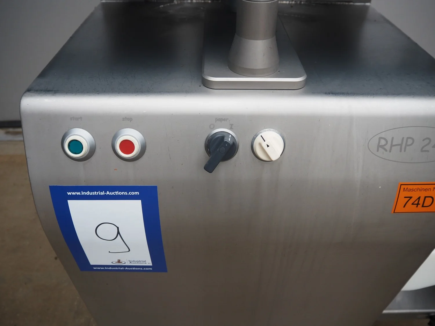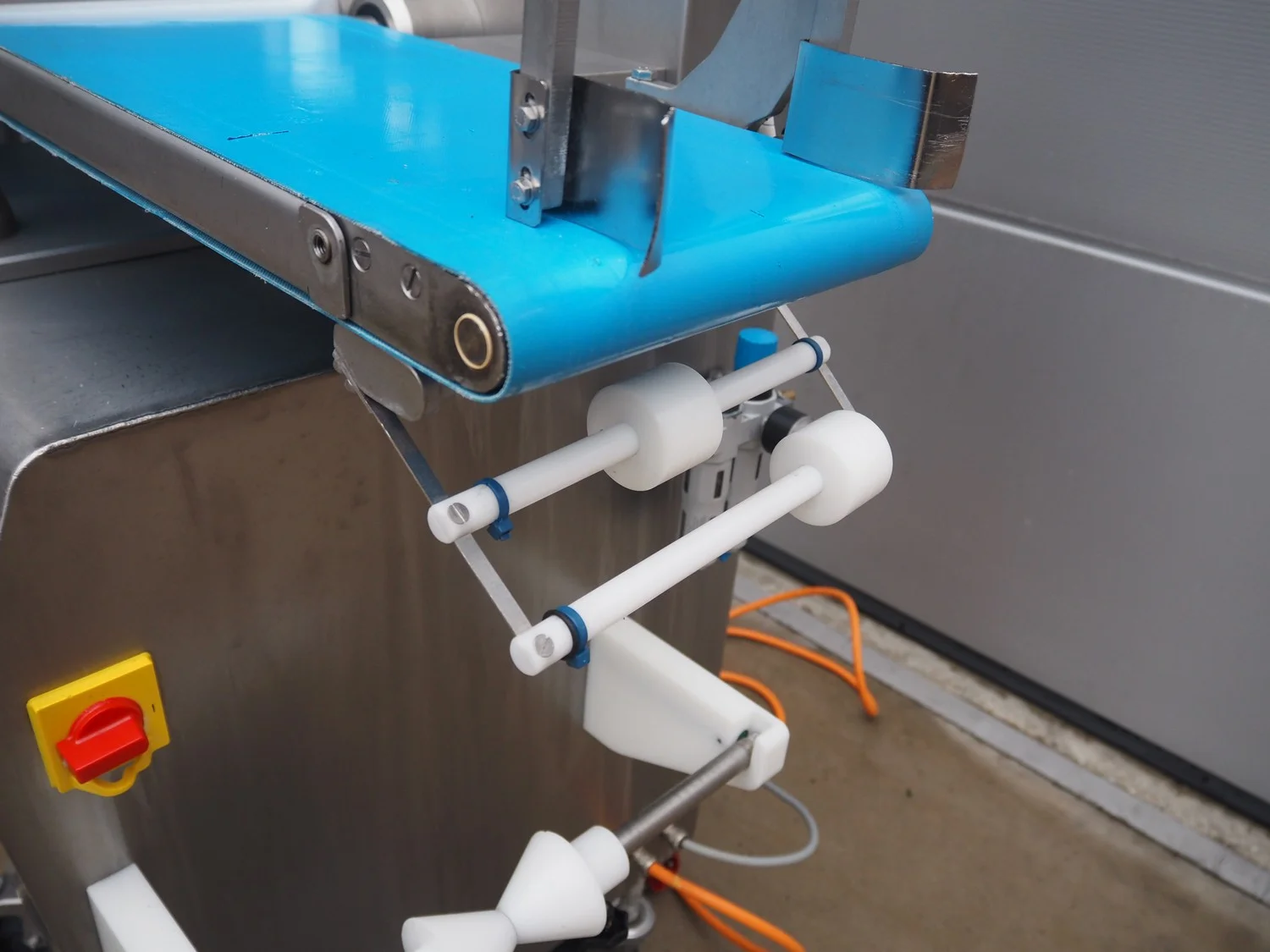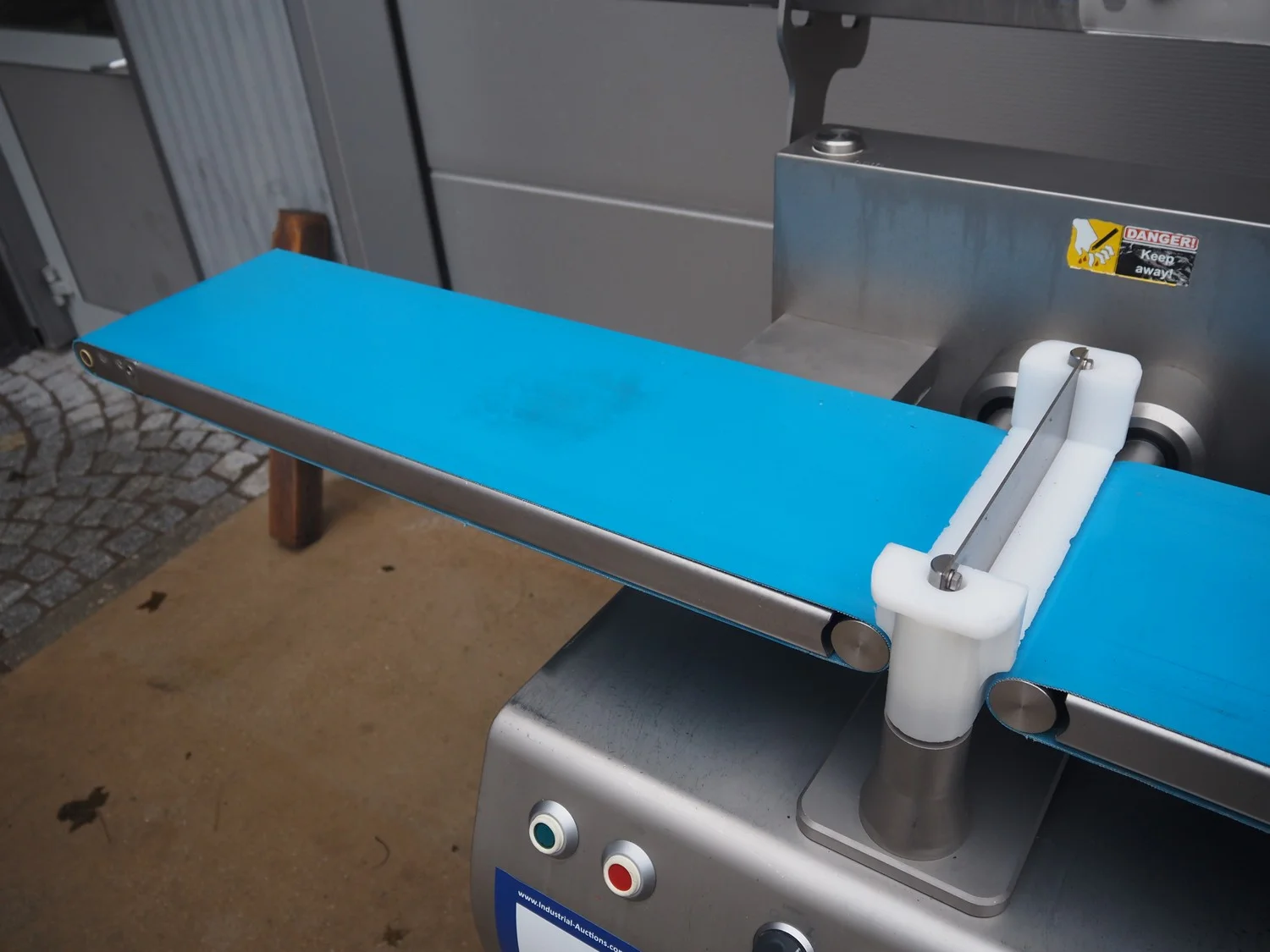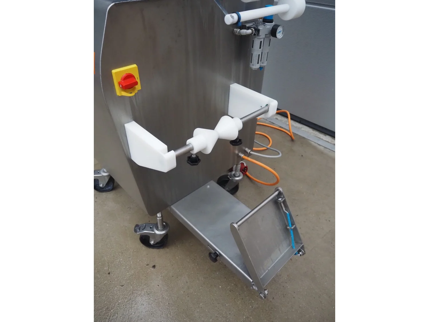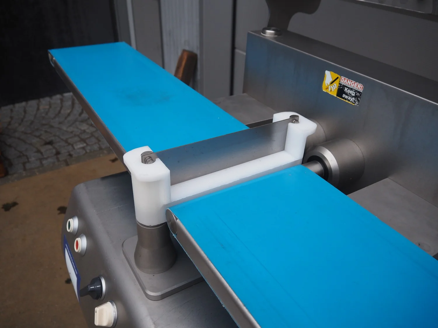 Rex mobile portioning machine, model: RHP 240, number: 1261012, 400 V, 50 Hz, capacity: 120 portions per minute, working width: 210 mm, plastic belt, belt width: 300 mm, total dimensions: 1850 mm x 650 mm x 1300 mm.