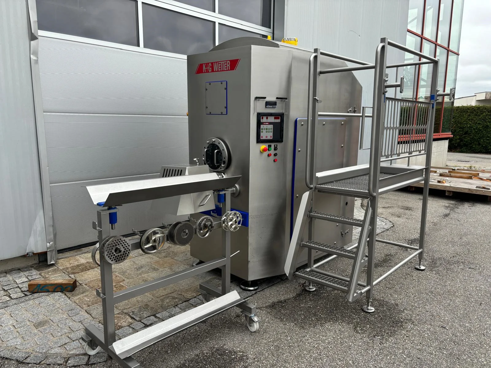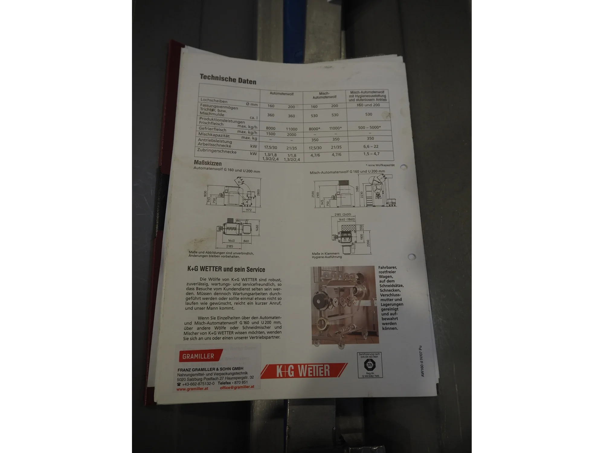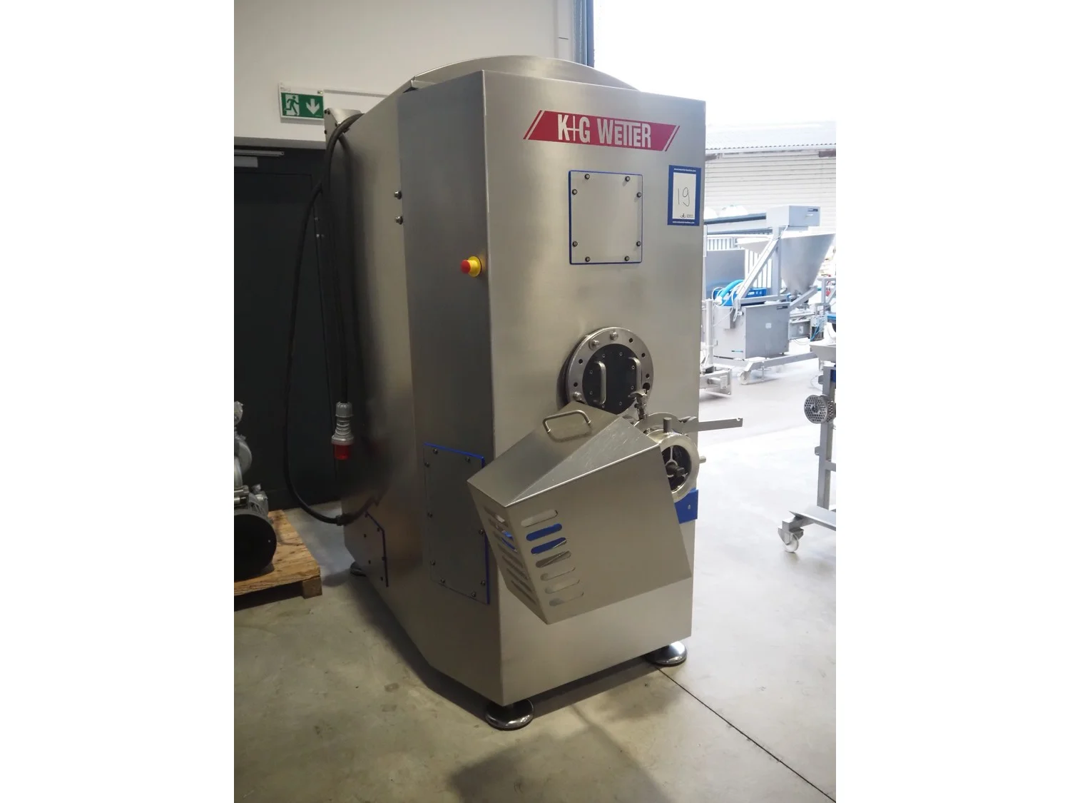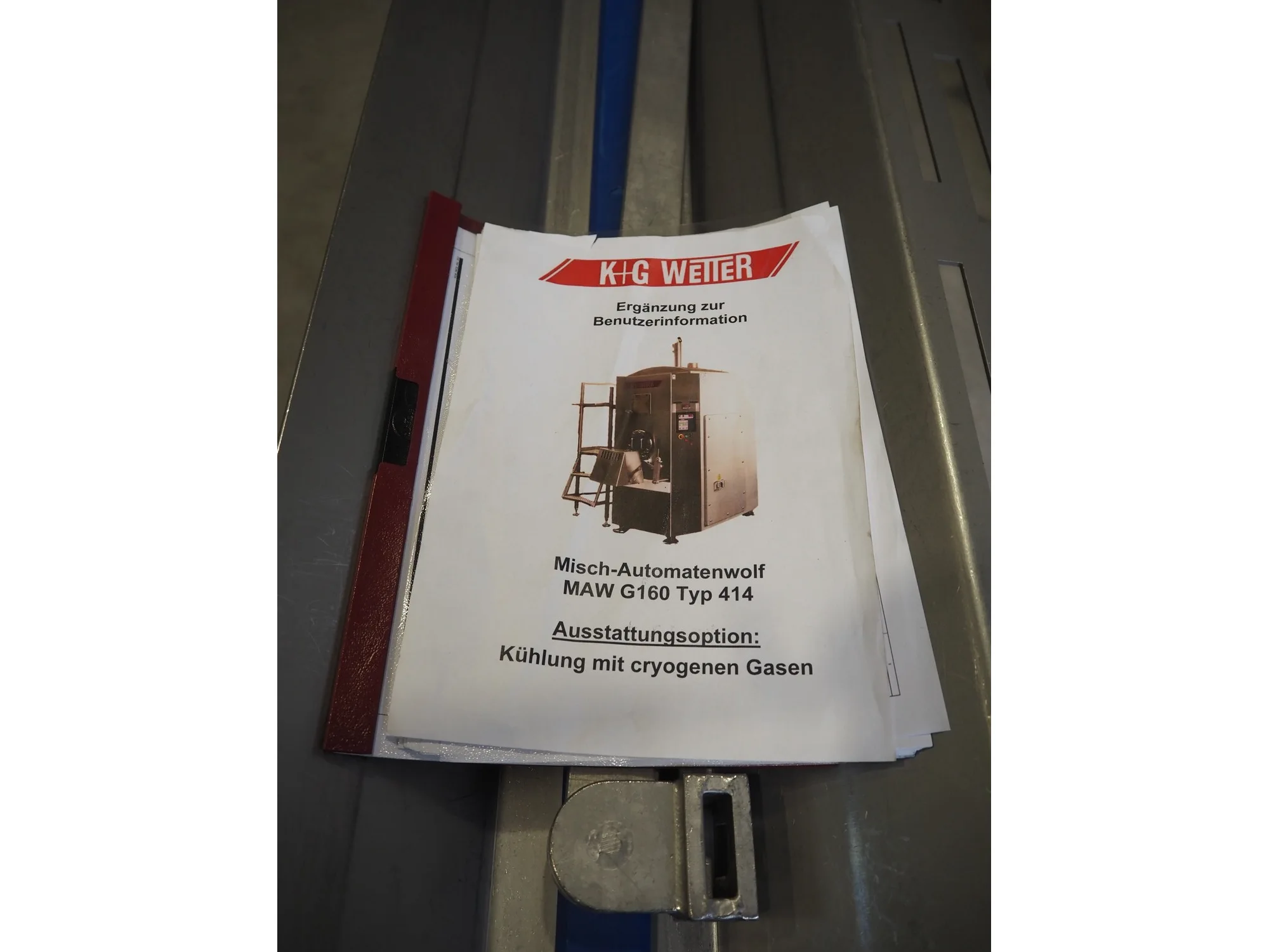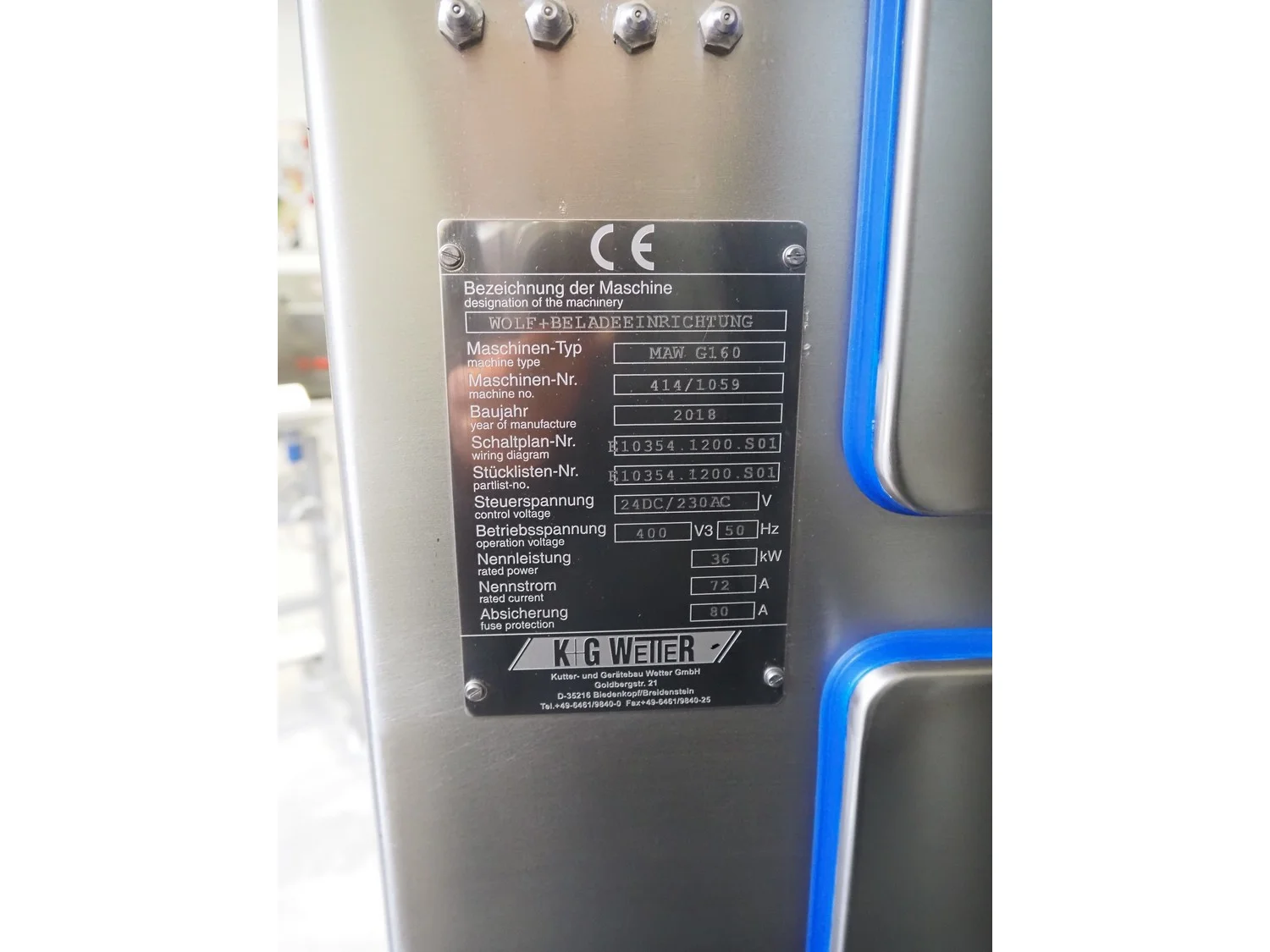 K+G Wetter cooled mixer-grinder, type: MAW G160, machine number: 414/1059, year of construction: 2018, 400 V, 3 Ph, 50 Hz, 72 A, 36 kW, plate diameter: 160 mm, total dimensions: 2400 mm x 1200 mm x 2200 mm. With tool trolley, dimensions: 1000 mm x 600 mm x 1120 mm and lifter for meat bins, lifting height: 2200 mm, dimensions lifter: 3200 mm x 1300 mm x 1200 mm