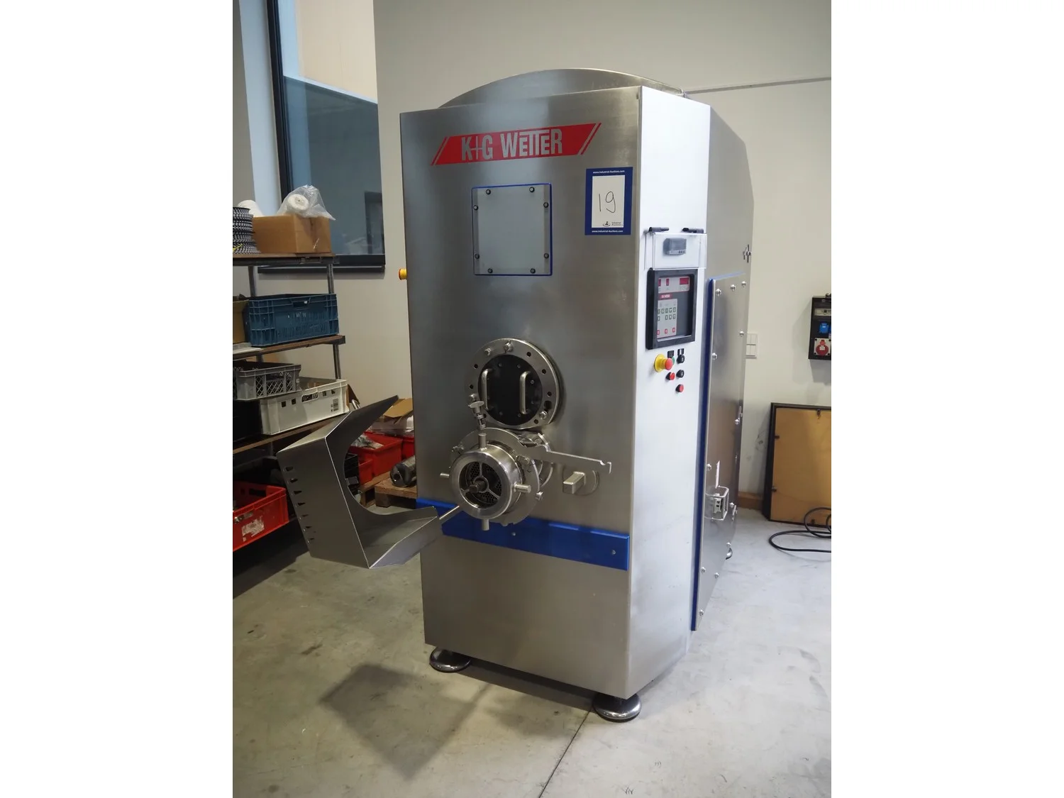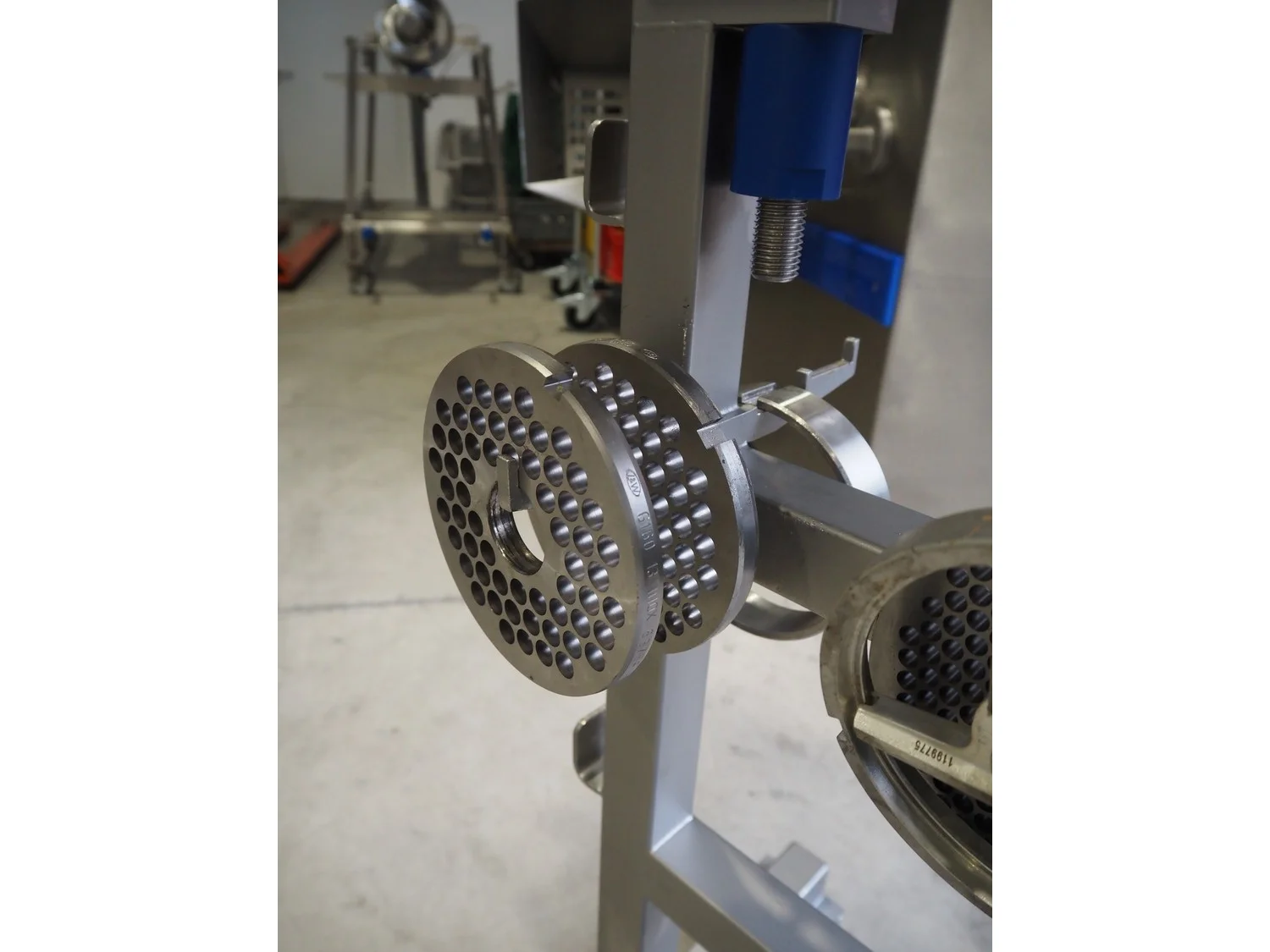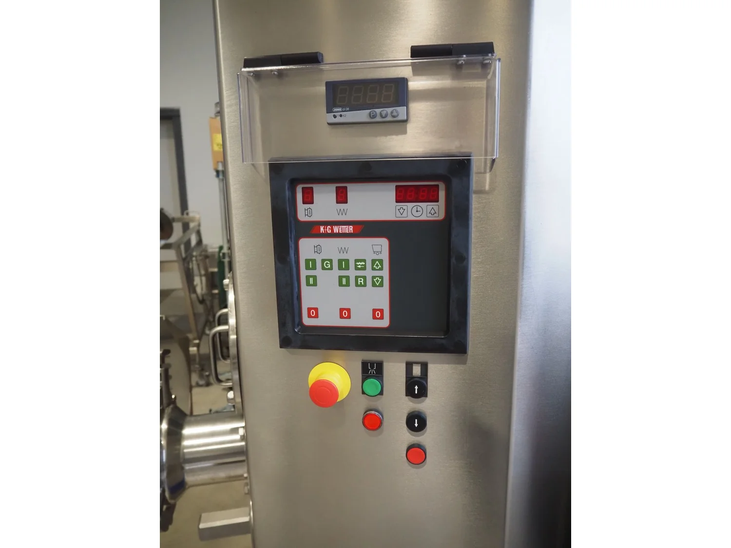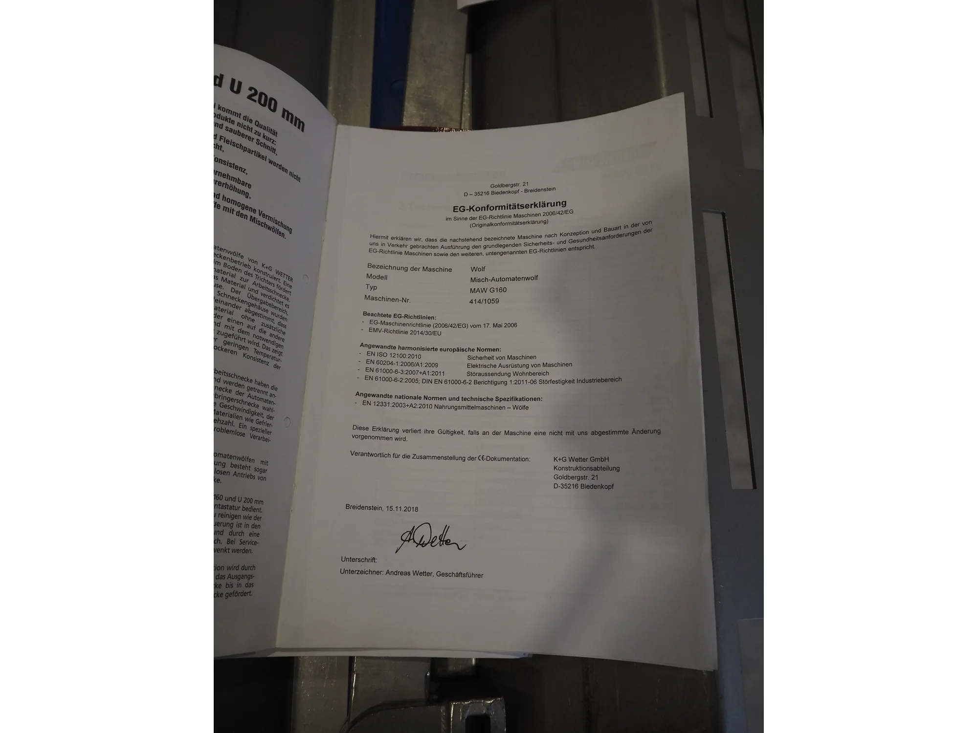 K+G Wetter cooled mixer-grinder, type: MAW G160, machine number: 414/1059, year of construction: 2018, 400 V, 3 Ph, 50 Hz, 72 A, 36 kW, plate diameter: 160 mm, total dimensions: 2400 mm x 1200 mm x 2200 mm. With tool trolley, dimensions: 1000 mm x 600 mm x 1120 mm and lifter for meat bins, lifting height: 2200 mm, dimensions lifter: 3200 mm x 1300 mm x 1200 mm