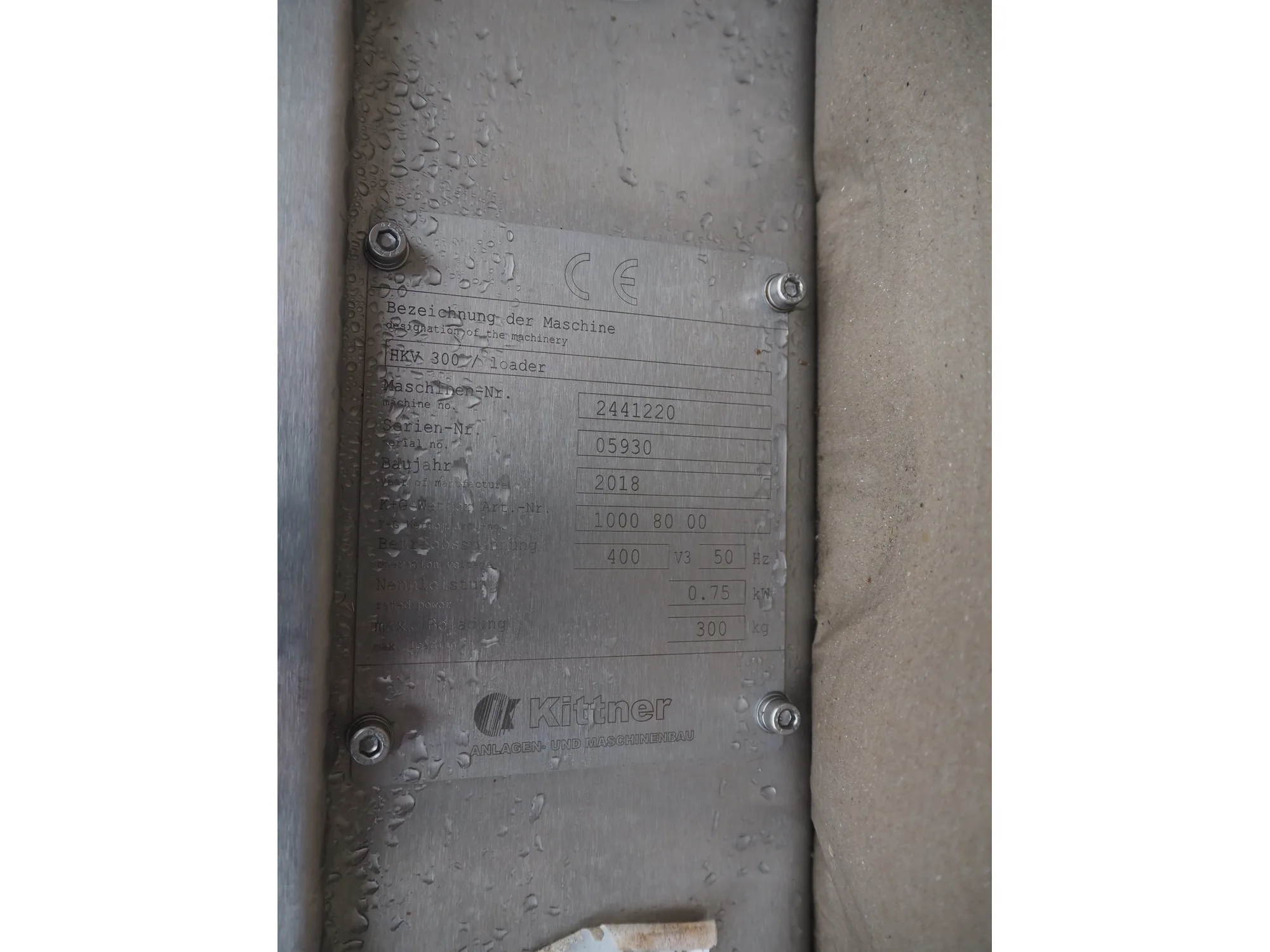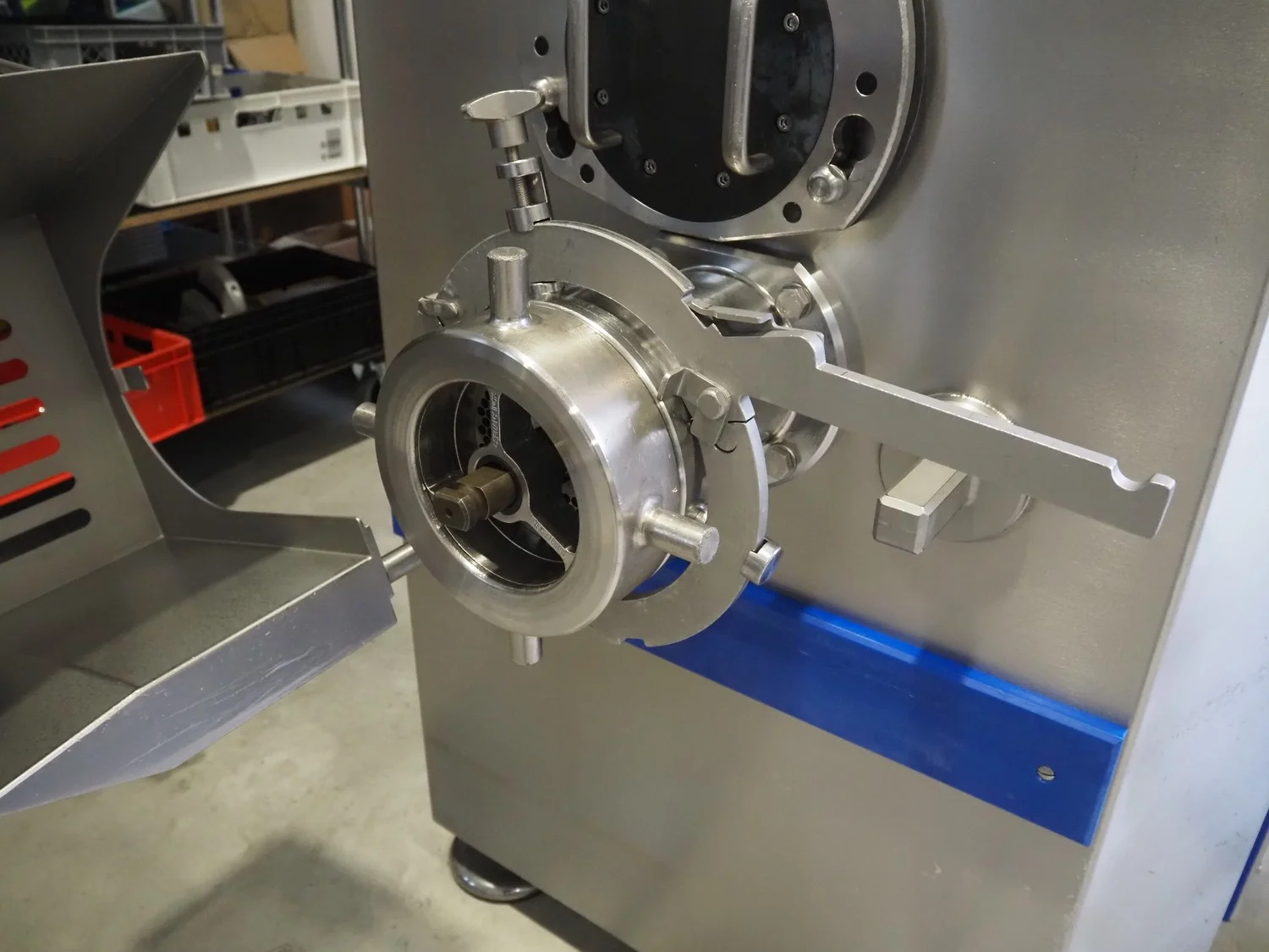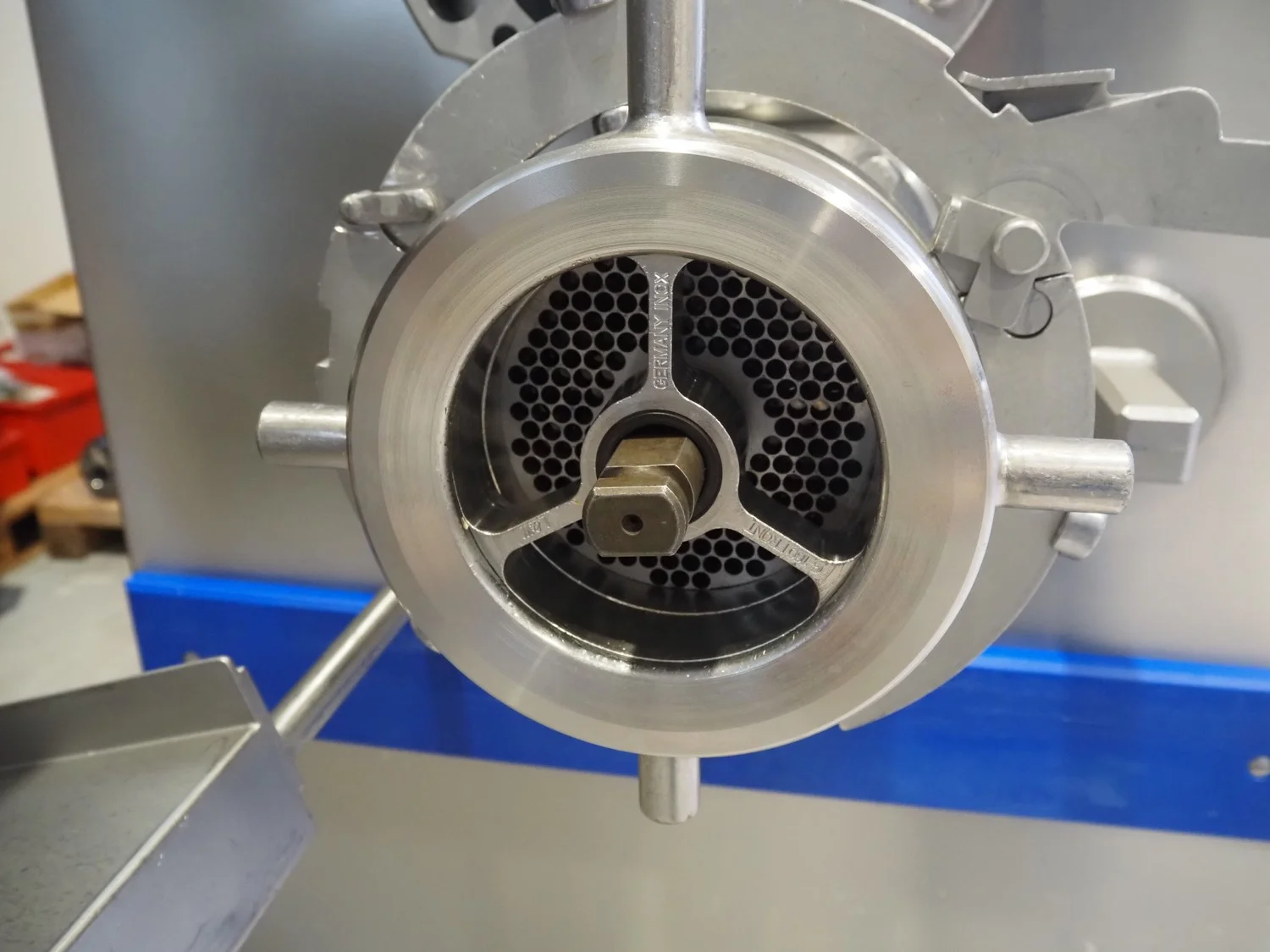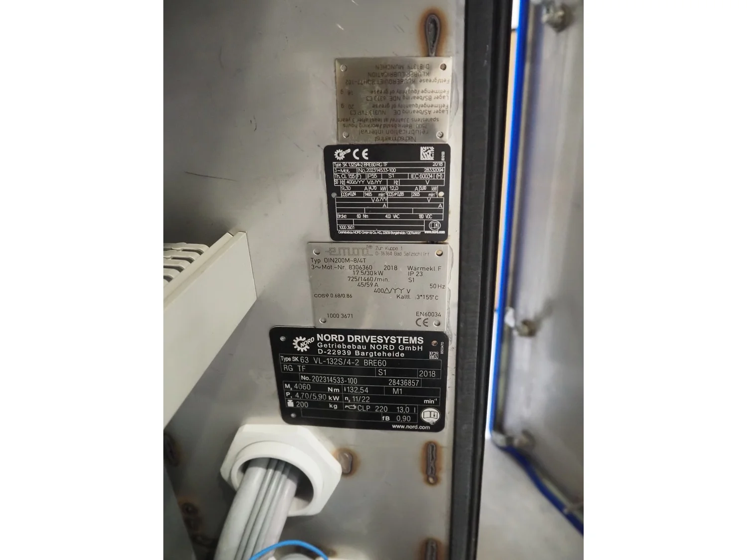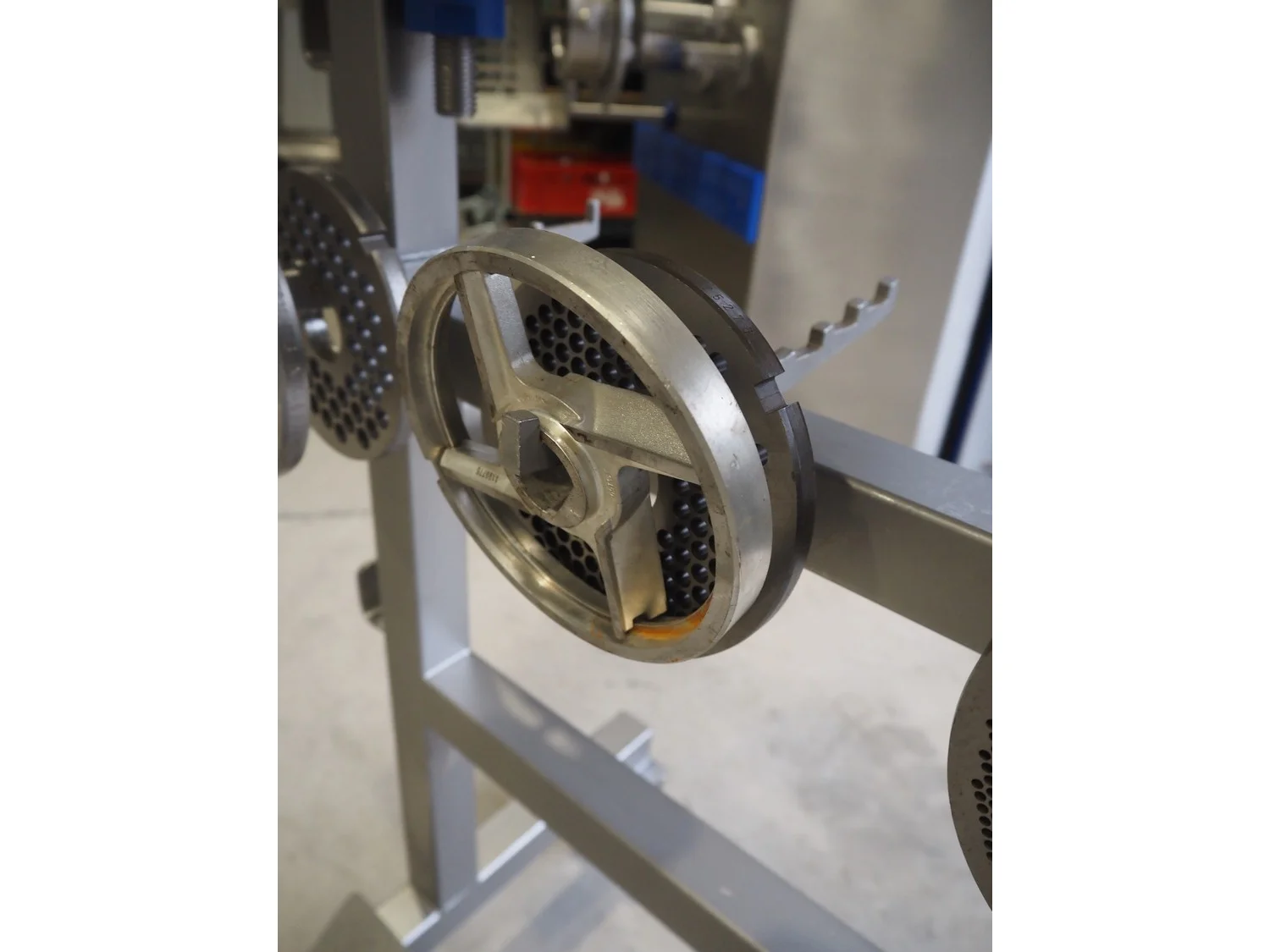 K+G Wetter cooled mixer-grinder, type: MAW G160, machine number: 414/1059, year of construction: 2018, 400 V, 3 Ph, 50 Hz, 72 A, 36 kW, plate diameter: 160 mm, total dimensions: 2400 mm x 1200 mm x 2200 mm. With tool trolley, dimensions: 1000 mm x 600 mm x 1120 mm and lifter for meat bins, lifting height: 2200 mm, dimensions lifter: 3200 mm x 1300 mm x 1200 mm