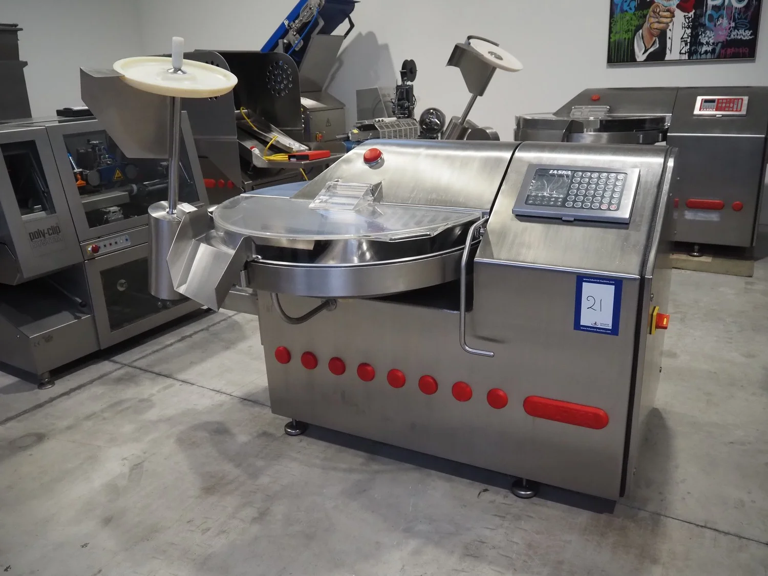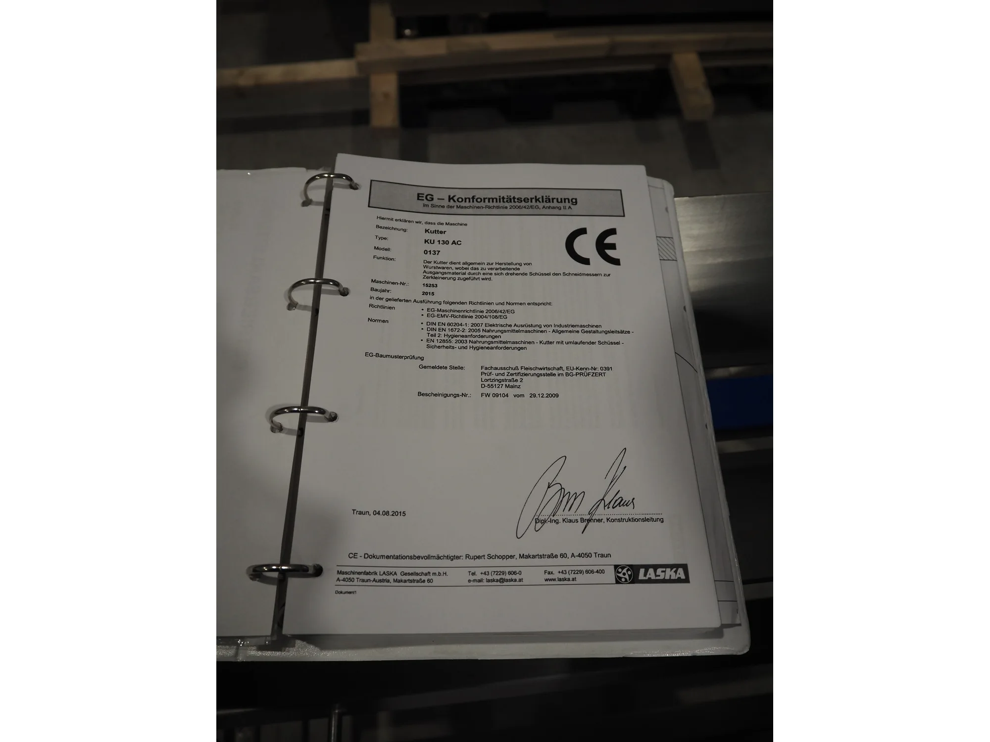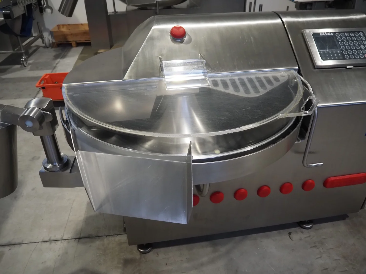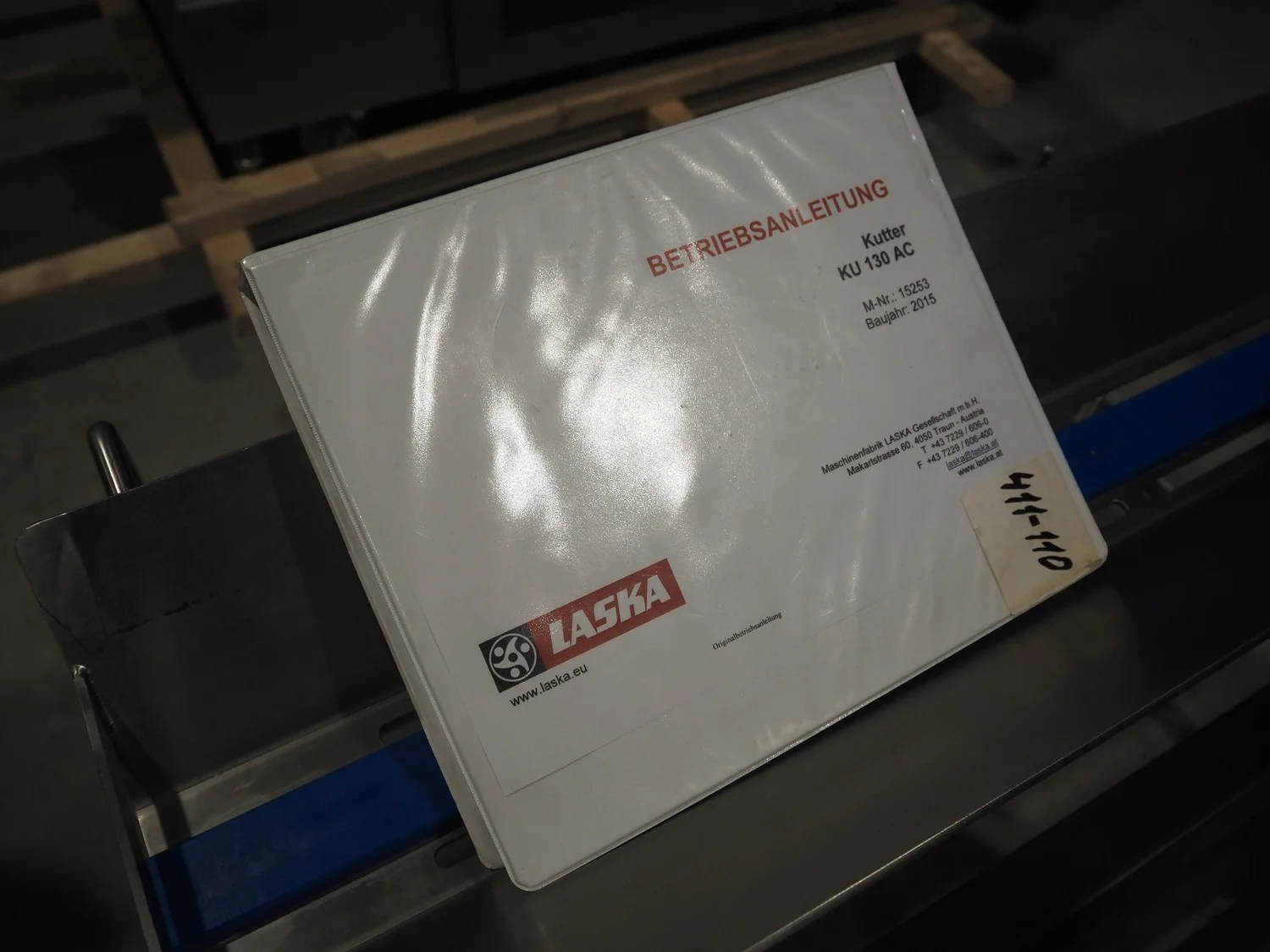 Laska cutter with ejector, type: KU 130 AC, machine number: 15253, year of construction: 2015, 380 V, 3 Ph, 50 Hz, 127 A, 62 kW, s/s bowl, volume: 130 liter, dimensions: 2280 mm x 1600 mm x 1680 mm.