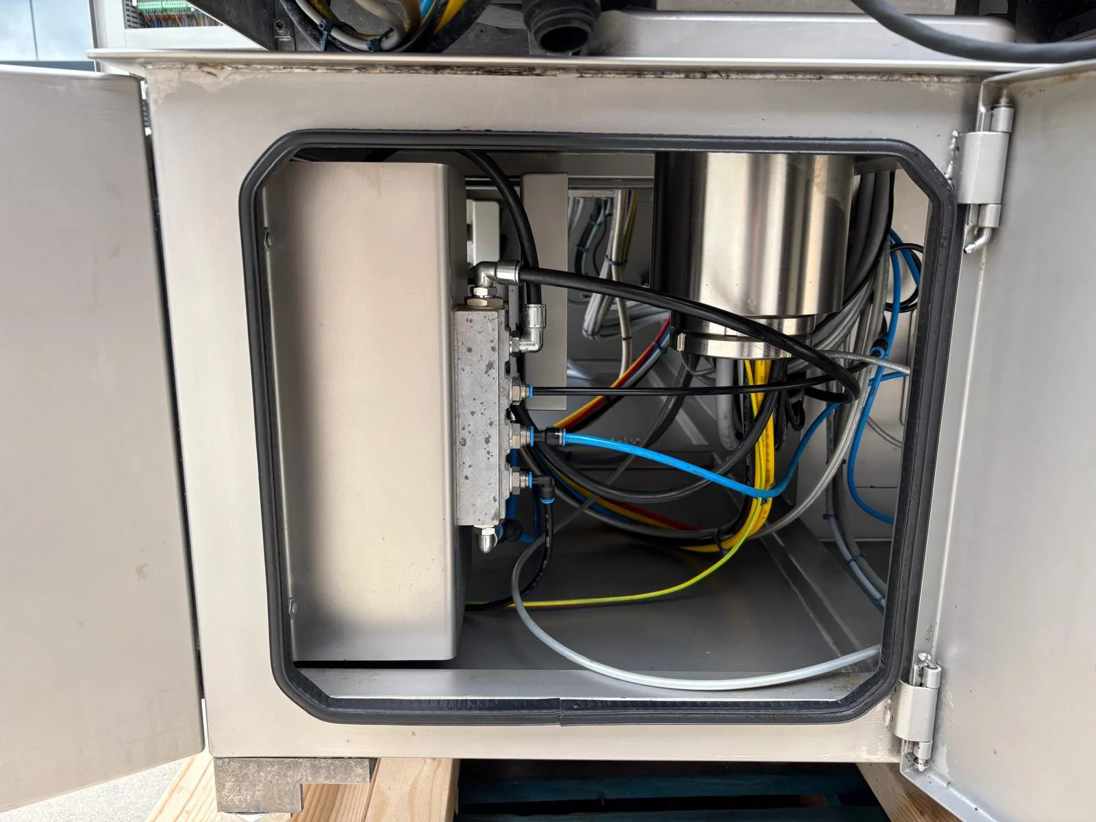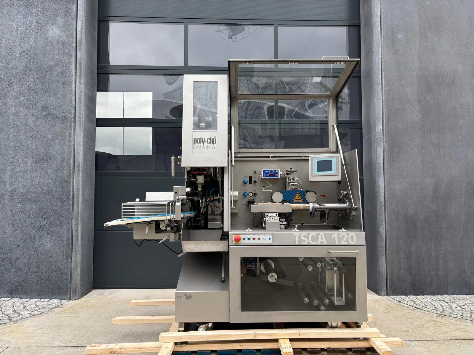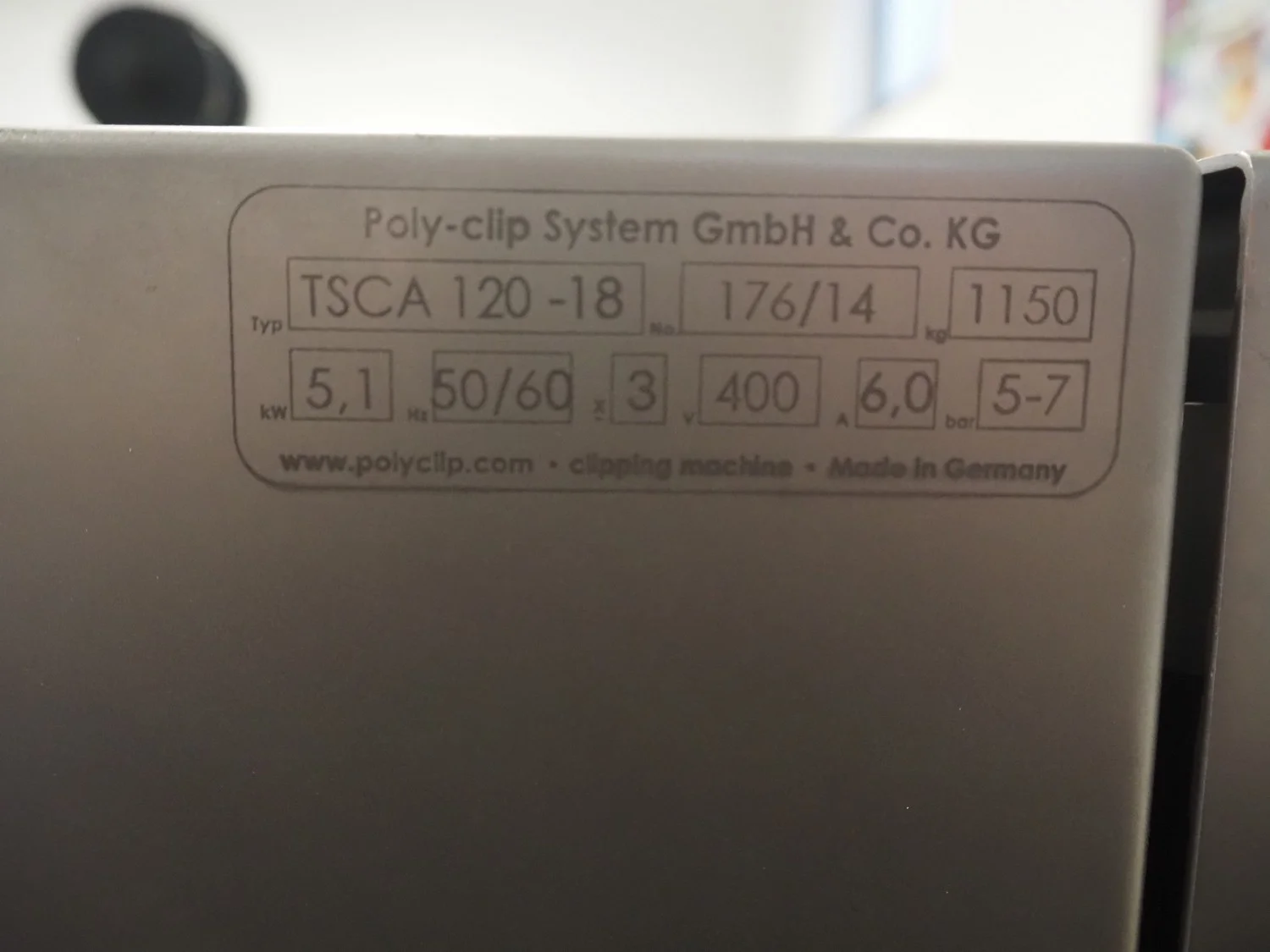 Poly-clip System GmbH & Co. KG mobile automatic sealing and clipping machine, one form shoulder, type: TSCA 120-18, number: 176, year of construction: 2014, 400 V, 3 Ph, 50/60 Hz, 6.0 A, 5.1 kW, 1150 kg, dimensions: 1500 mm x 950 mm x 1850 mm. Overhauled in 2025.