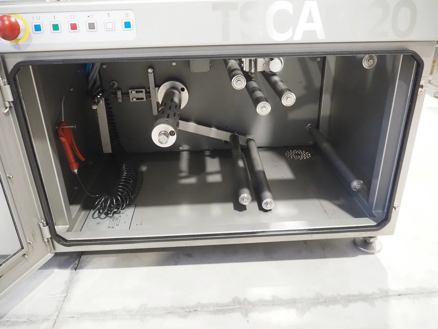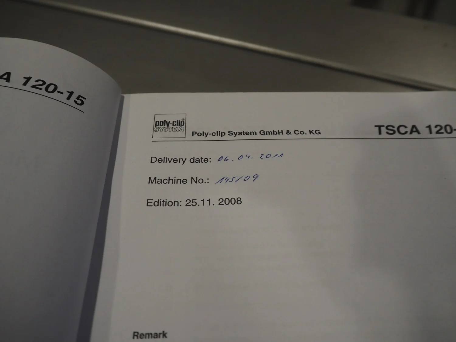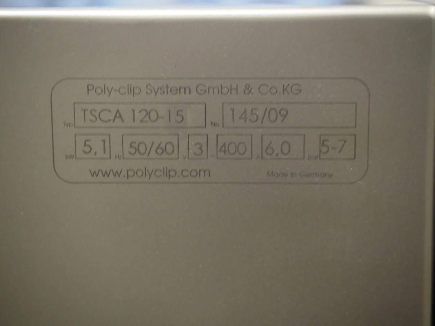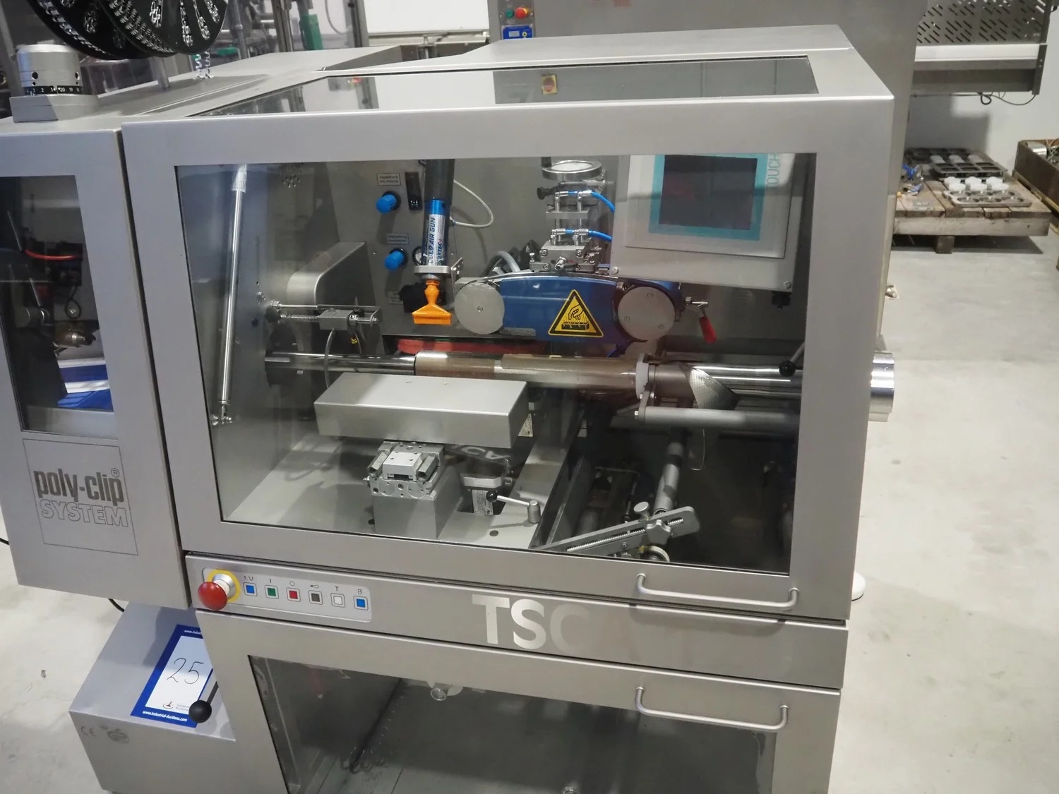 Poly-clip System GmbH & Co. KG mobile automatic sealing and clipping machine, one form shoulder, type: TSCA 120-15, number: 145, year of construction: 2009, 400 V, 3 Ph, 50/60 Hz, 6.0 A, 5.1 kW, dimensions: 1500 mm x 950 mm x 1850 mm. Overhauled.