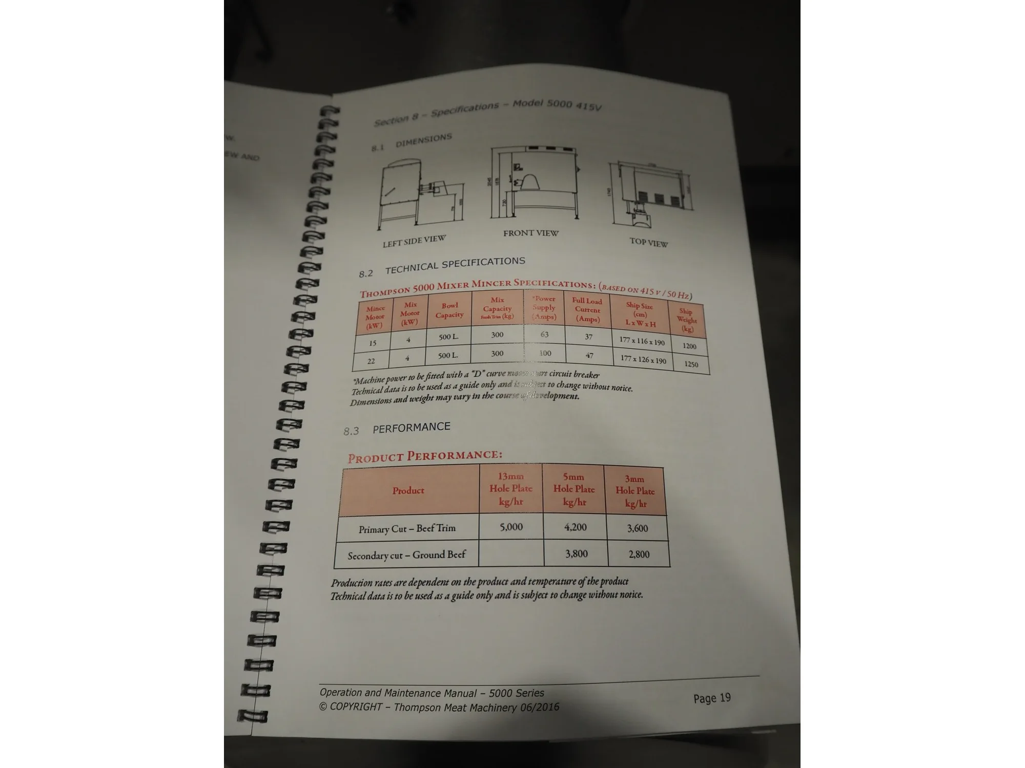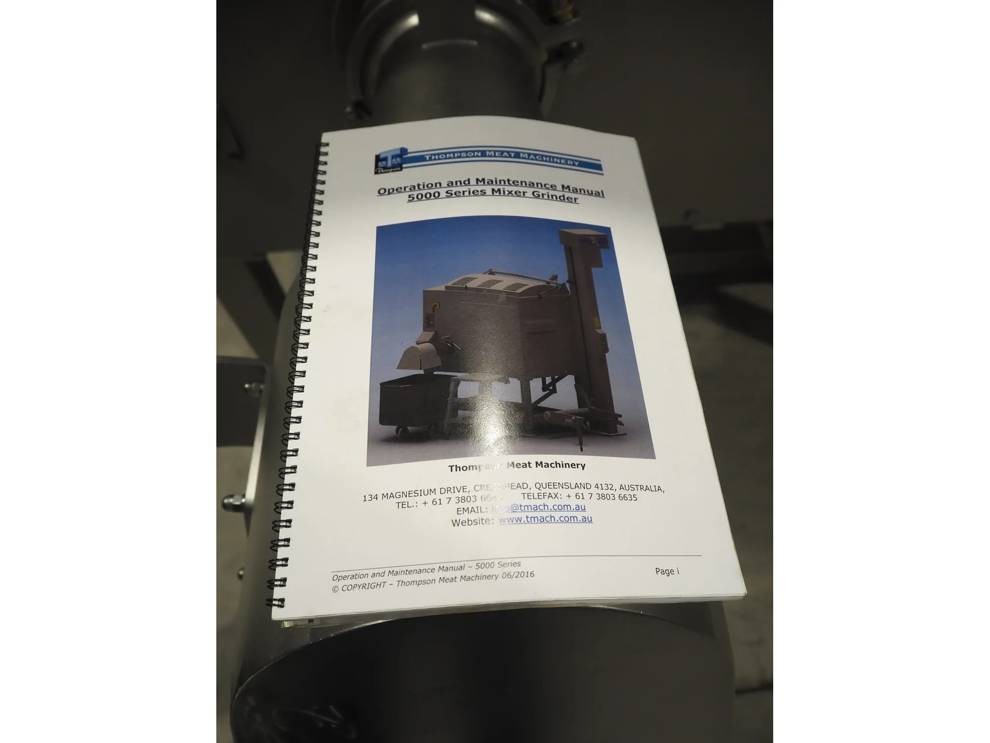 Thompson Meat Machinery mixer-grinder, type: 5000, serial number: 5000~m~2~18, year of construction: 05~2017, 415/400 V, 50 Hz, 42.7/37.4/8.02 A, 22.0/4.0 kW, dimensions: 1800 mm x 1250 mm x 1900 mm. With lifter for meat bins.