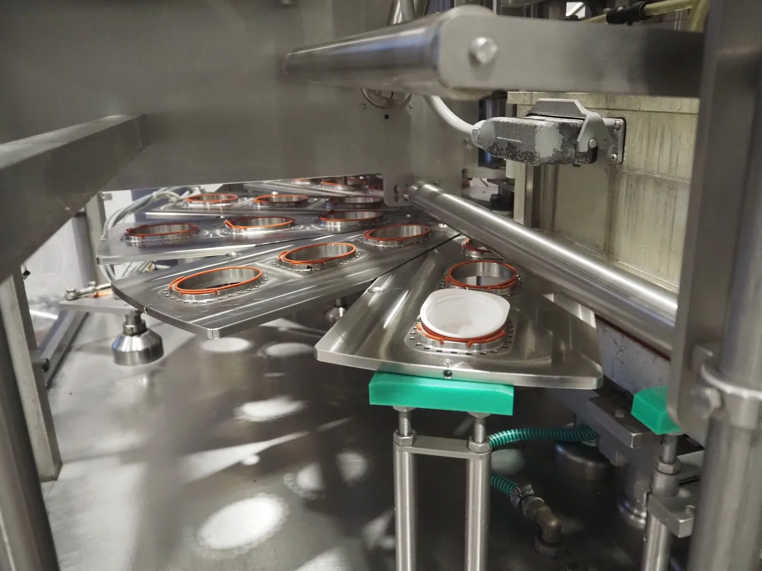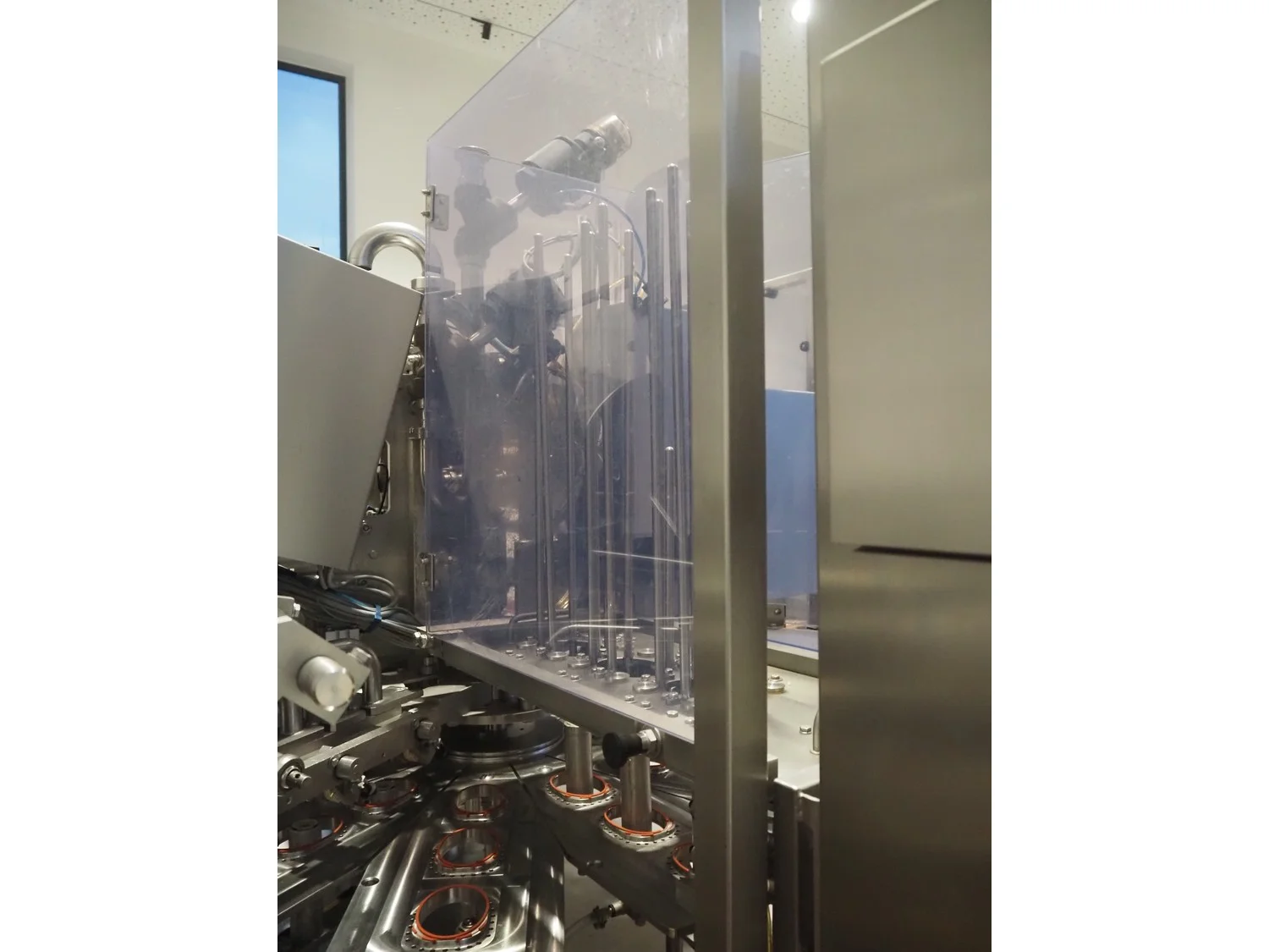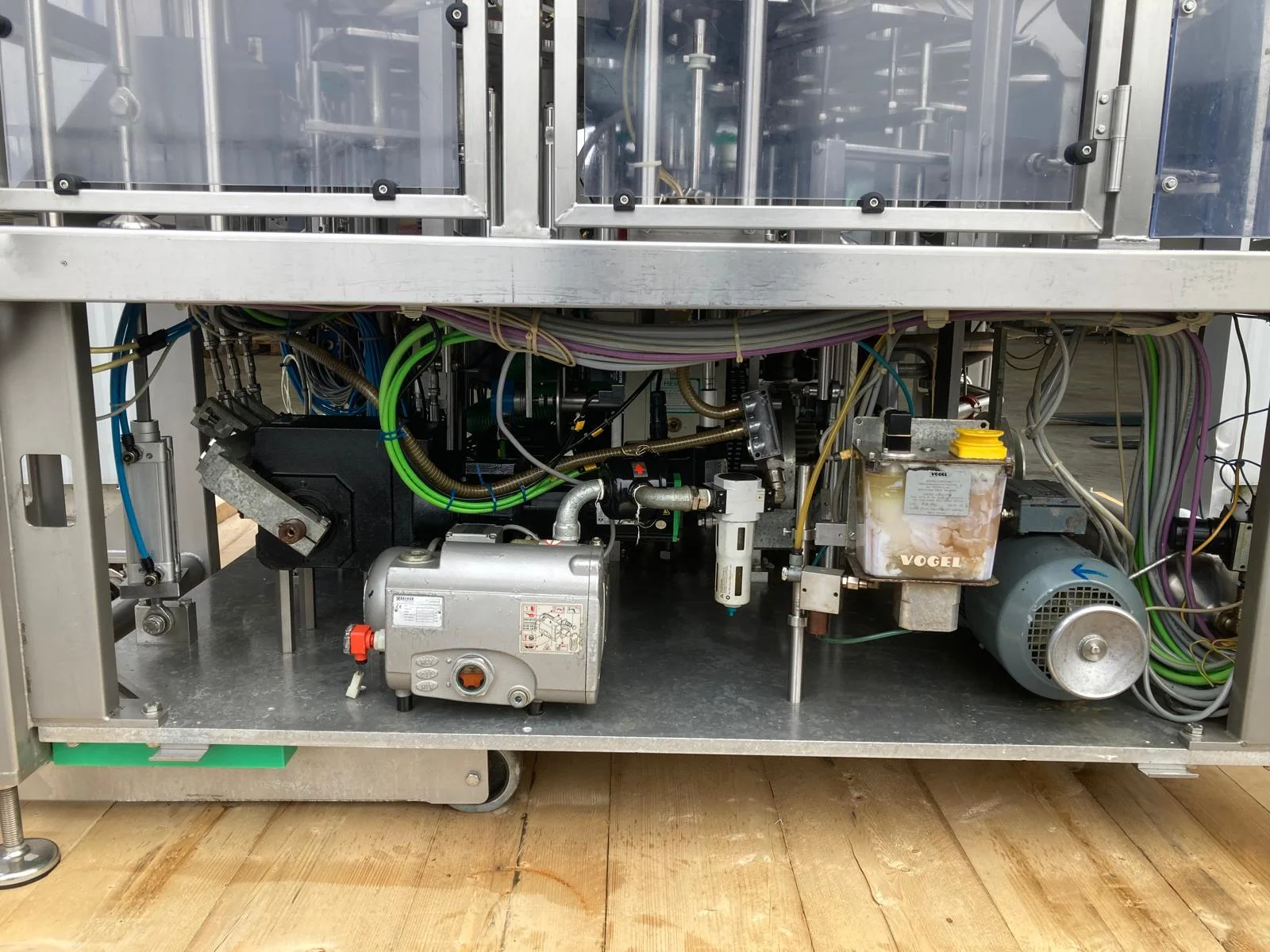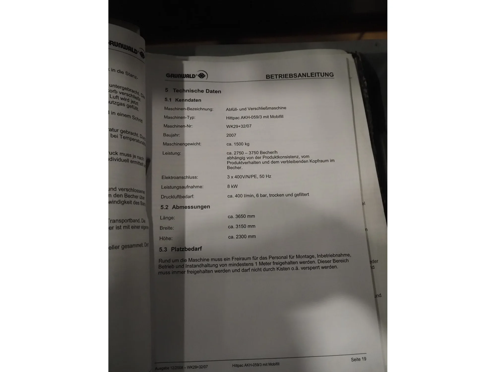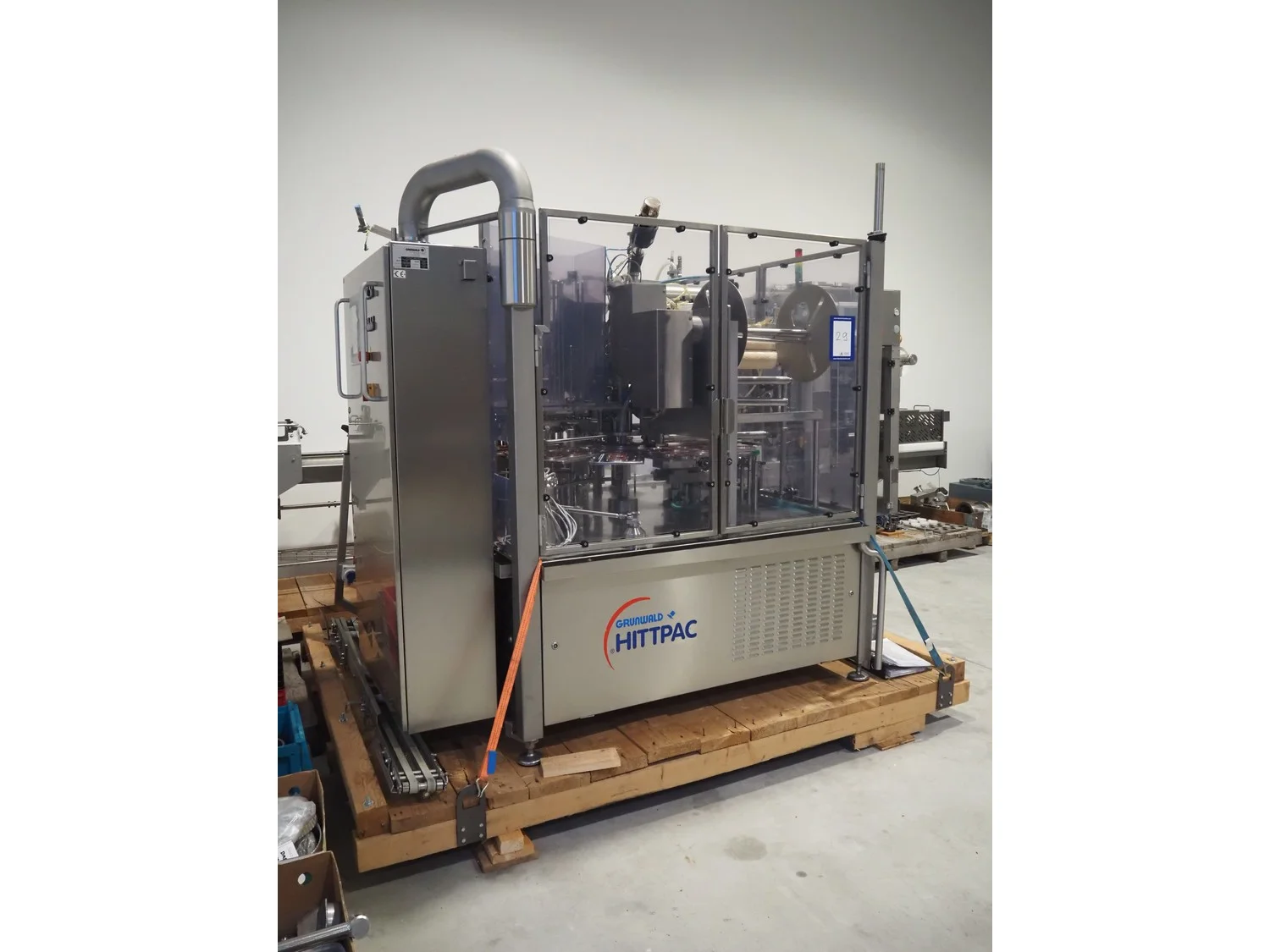 Herbert Grunwald GmbH cup filling and sealing machine, type: Hittpac AKH-059/3, number: 29/07, year of construction: 2007, 400 V, 3 Ph, 50 Hz, 18.0 A, 8.0 kW, Busch vacuum pump, dimensions cups: 100 mm x 70 mm, total dimensions: 3650 mm x 3150 mm x 2300 mm.