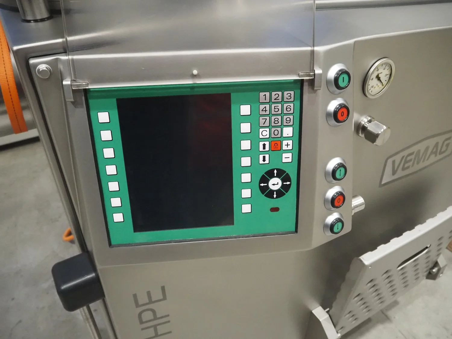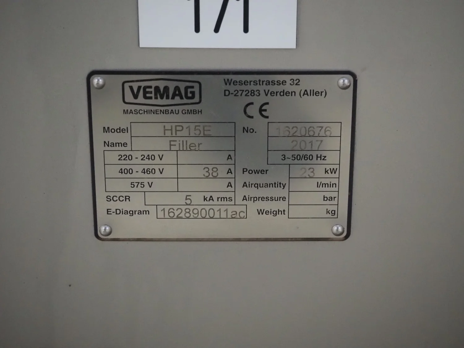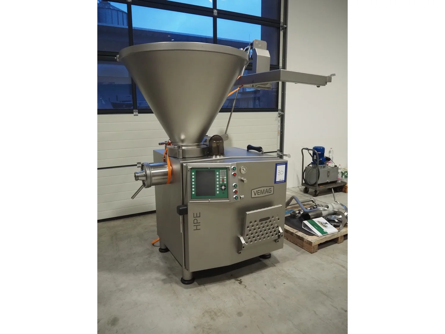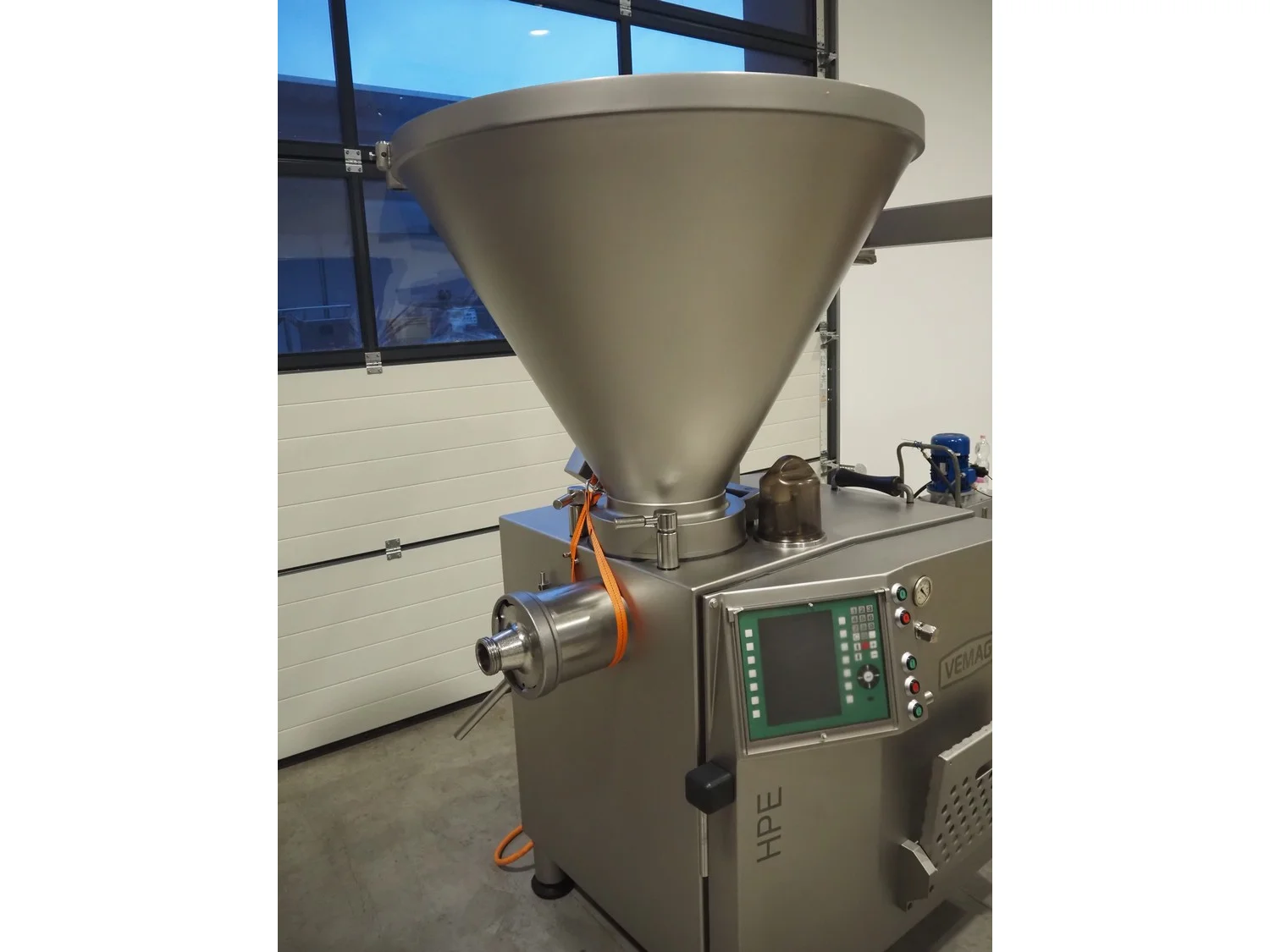 Vemag vacuum filling machine with lifter for meat bins, model: HP15E, number: 1620676, year of construction: 2017, 400-460 V, 3 Ph, 50/60 Hz, 38 A, 23 kW, dimensions: 2150 mm x 1450 mm x 2500 mm.