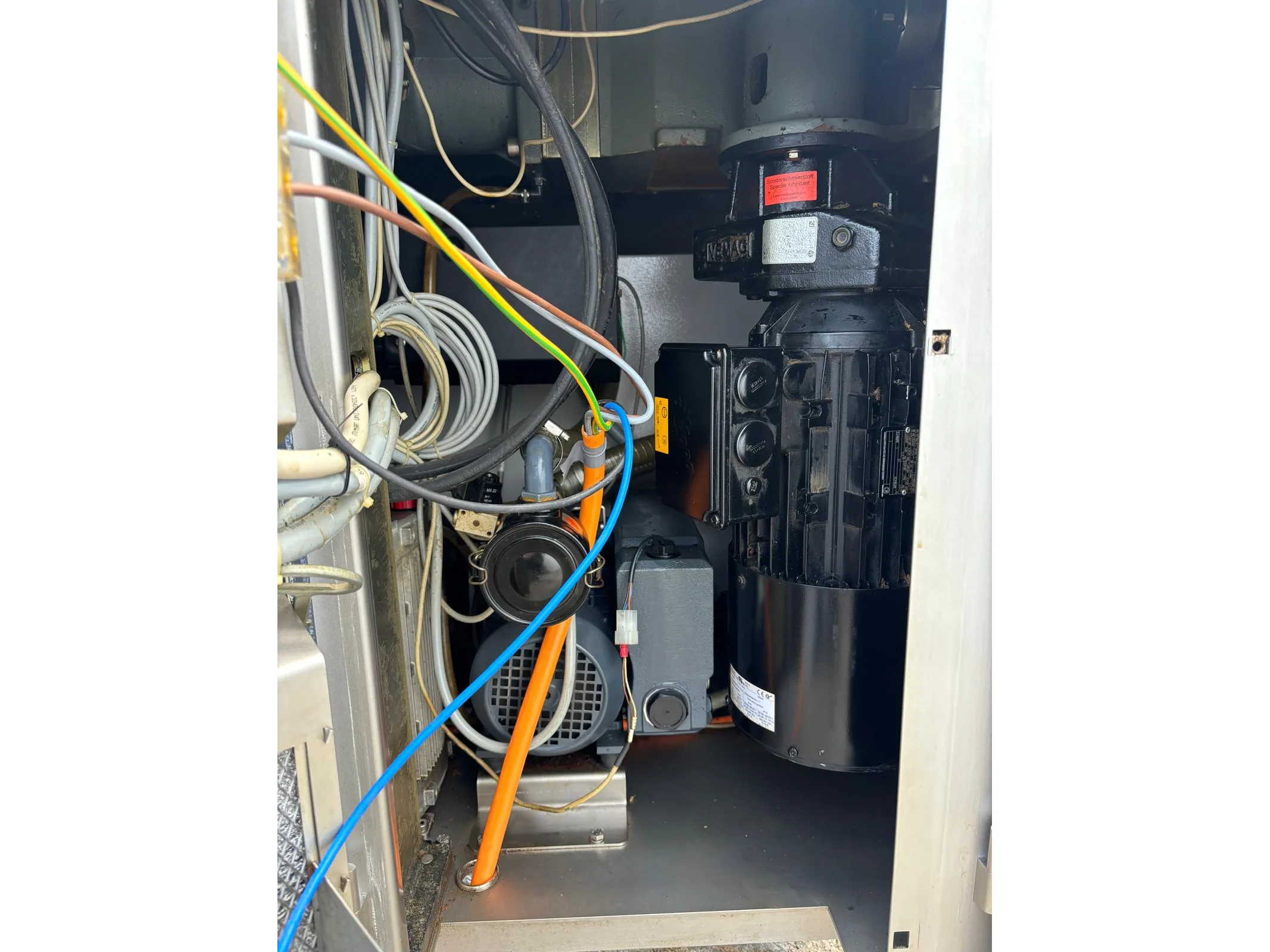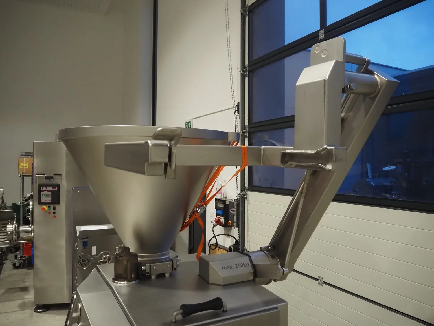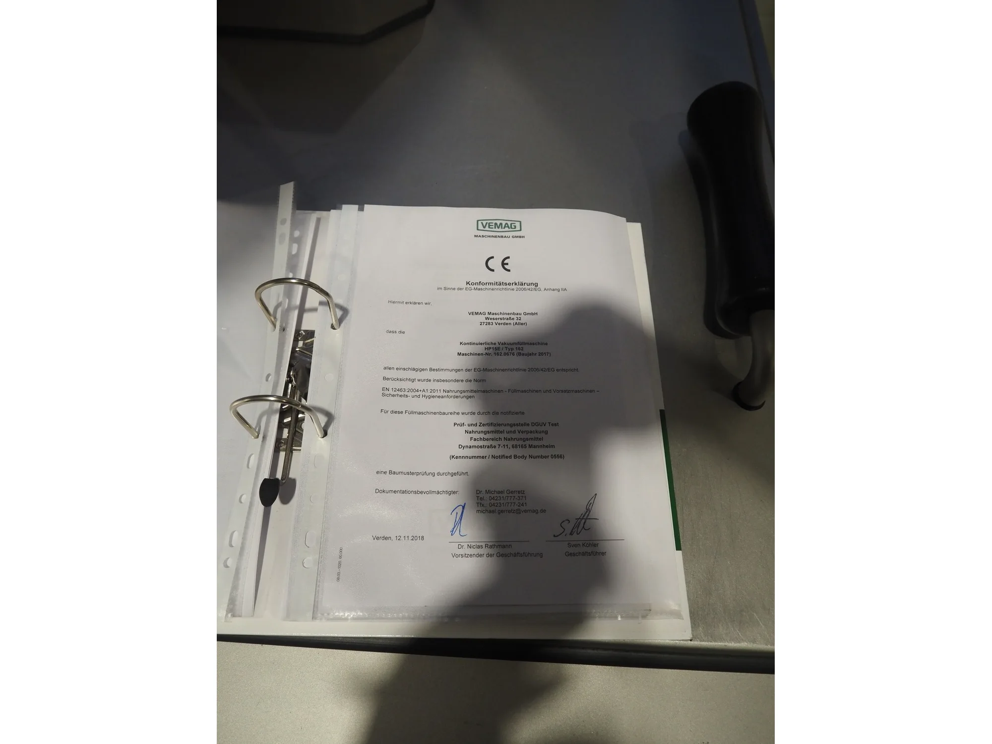 Vemag vacuum filling machine with lifter for meat bins, model: HP15E, number: 1620676, year of construction: 2017, 400-460 V, 3 Ph, 50/60 Hz, 38 A, 23 kW, dimensions: 2150 mm x 1450 mm x 2500 mm.
