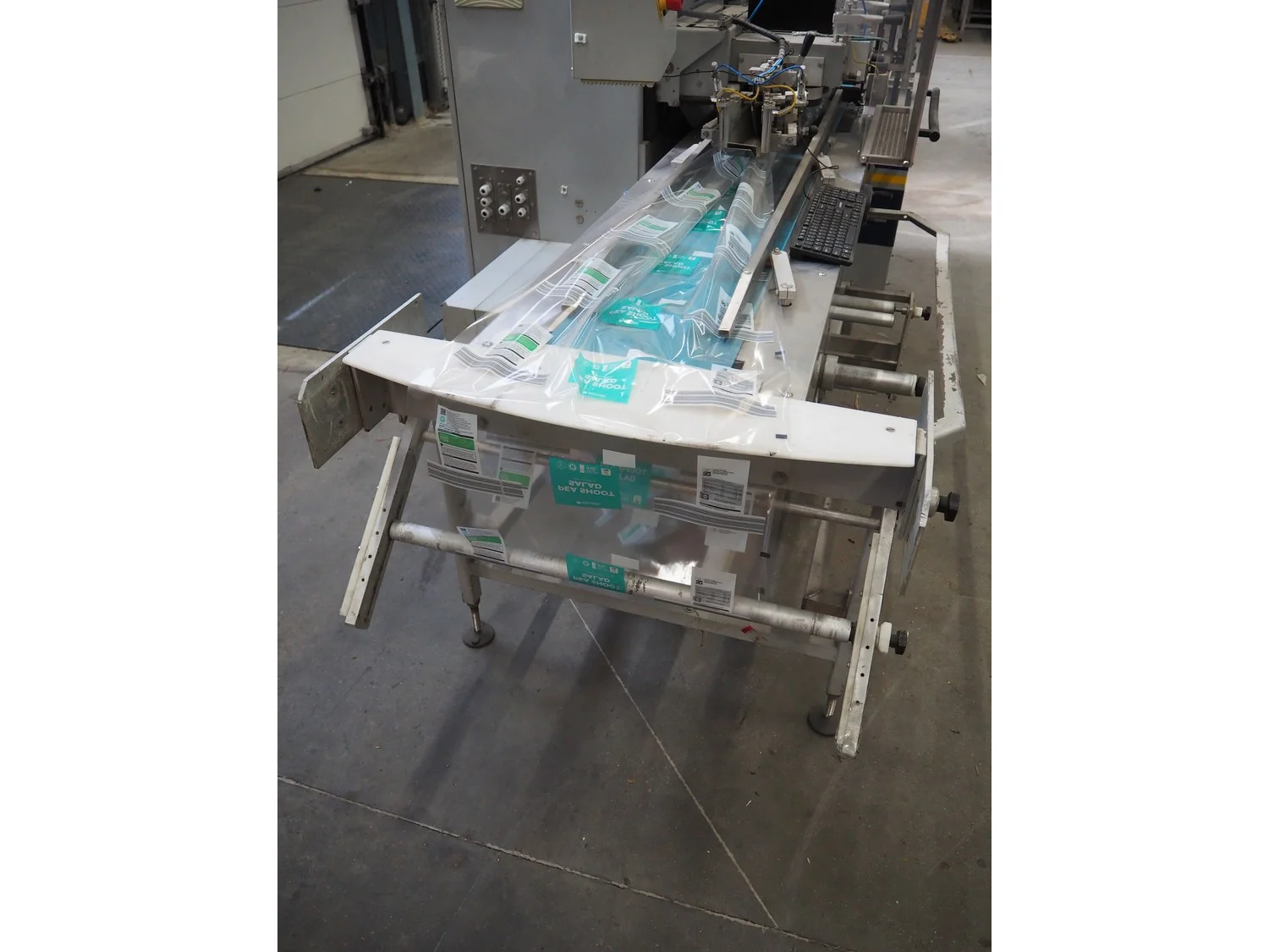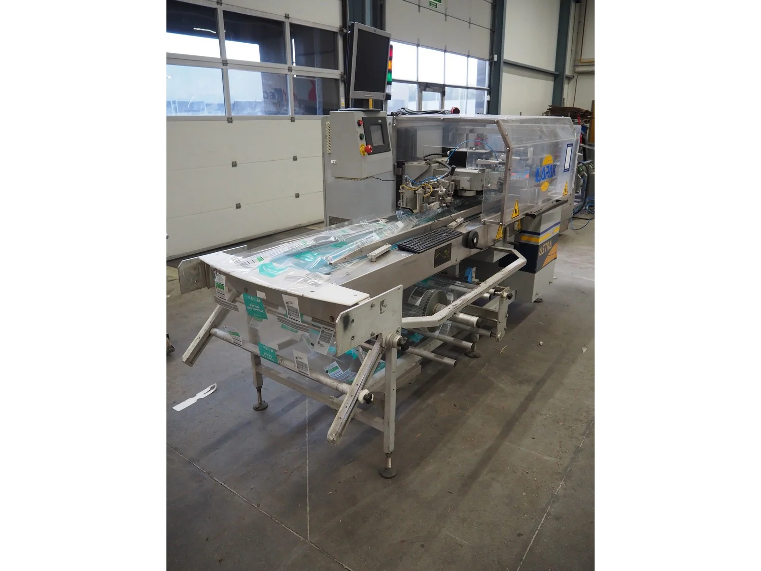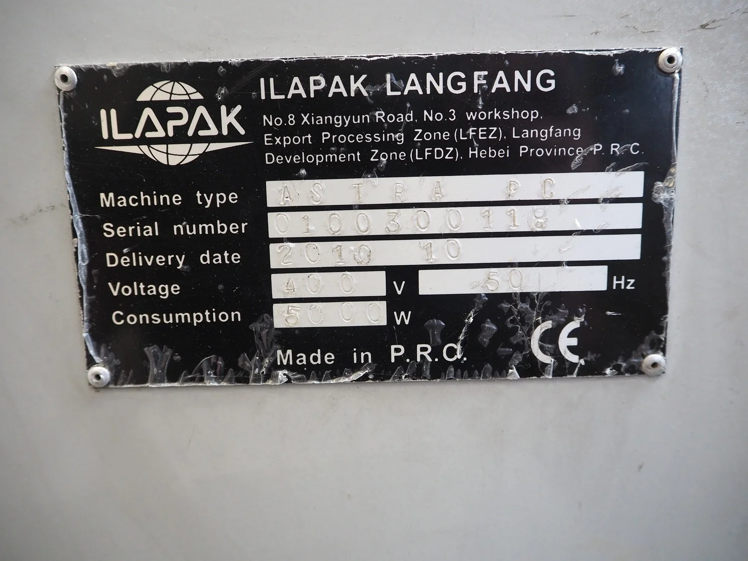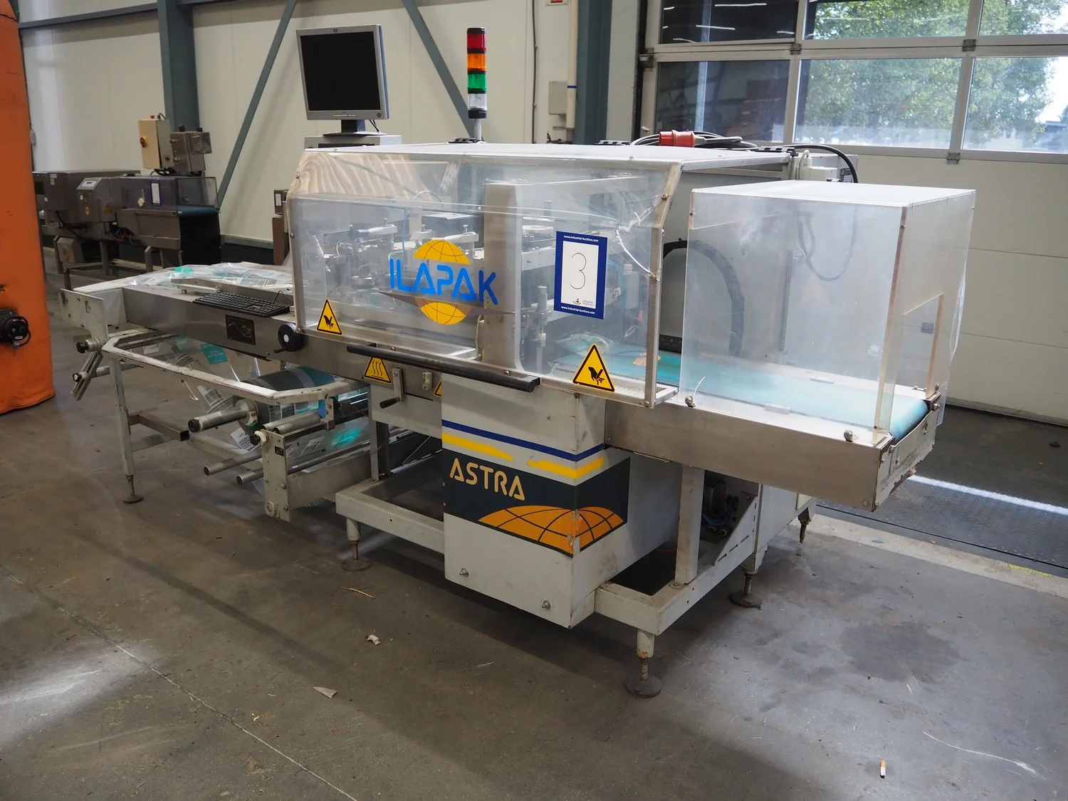 Ilapak flowpacker, type: ASTRA PC, serial number: 0100300118, year of construction: 2010-10, 400 V, 50 Hz, 5000 Watt, seal width: 350 mm, plastic belt, belt width: 300 mm, film width: 550 mm, total dimensions: 3300 mm x 1400 mm x 1900 mm.