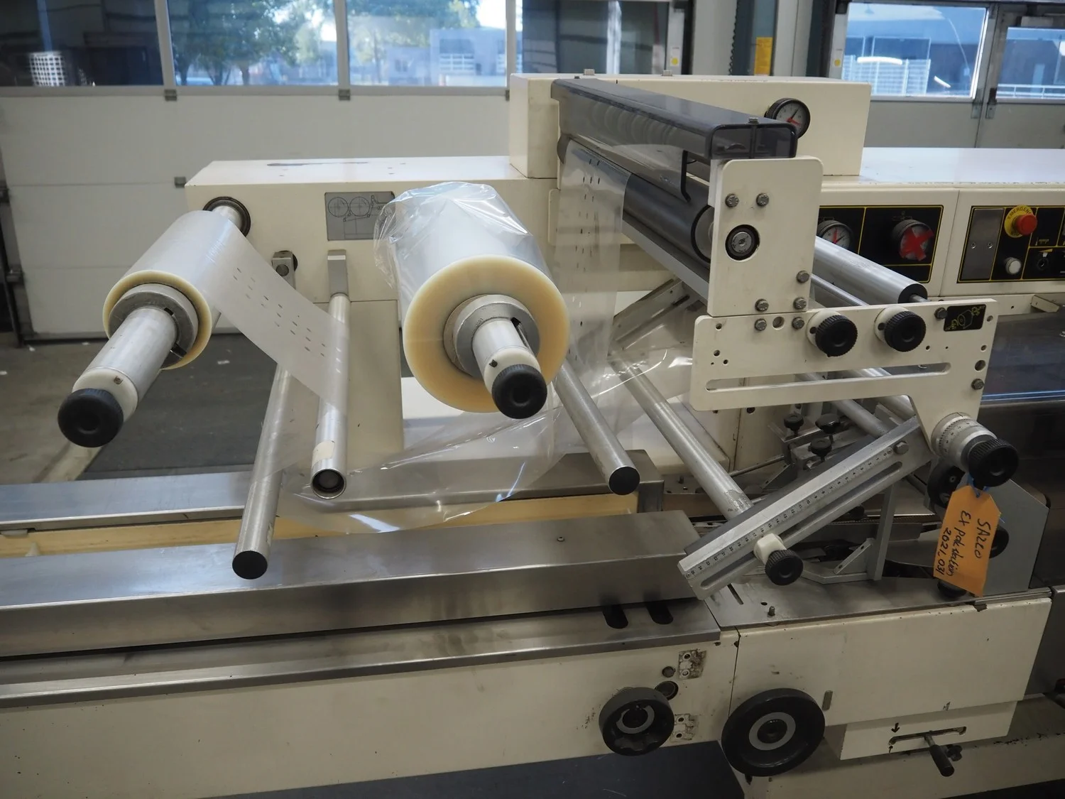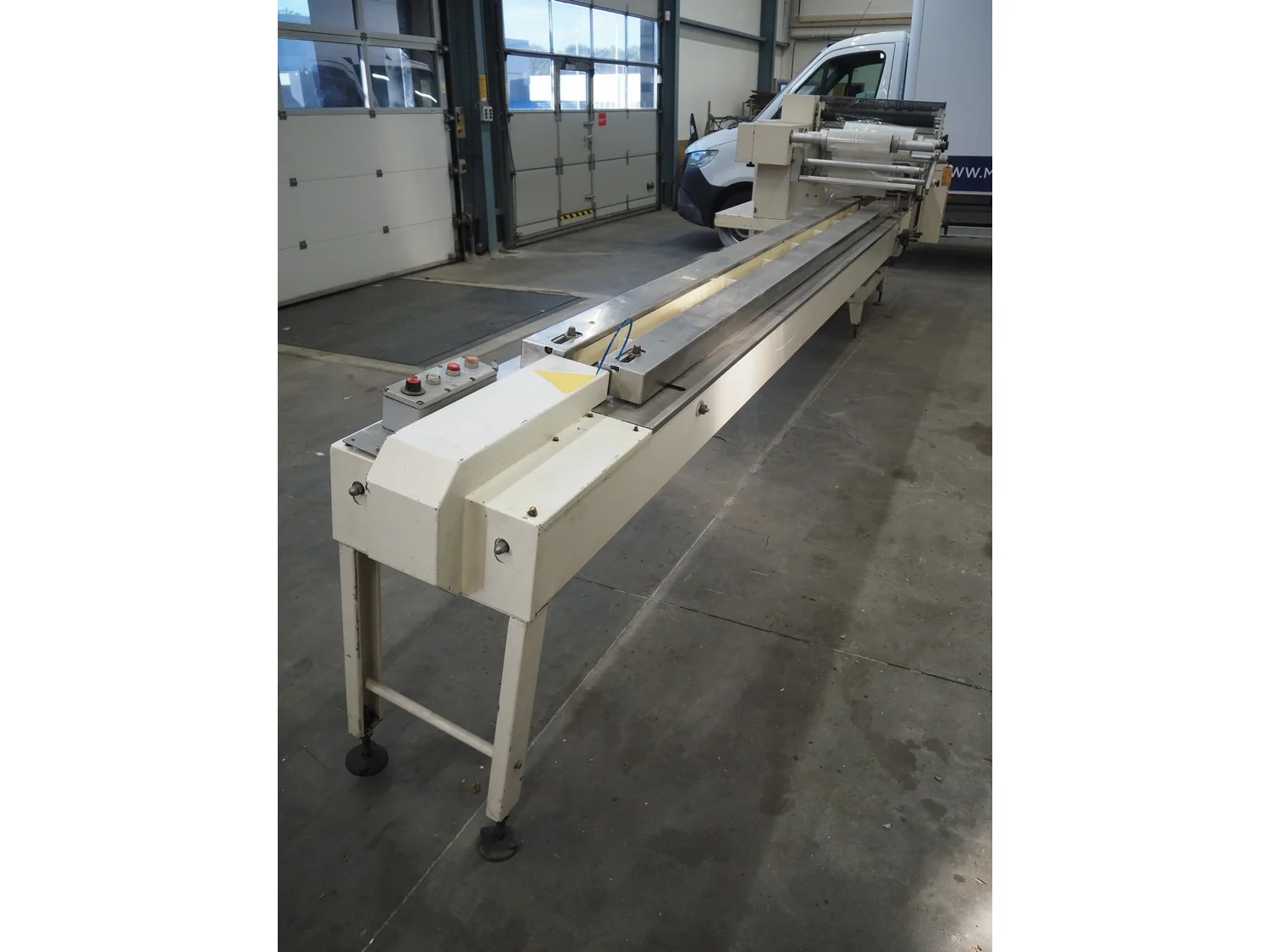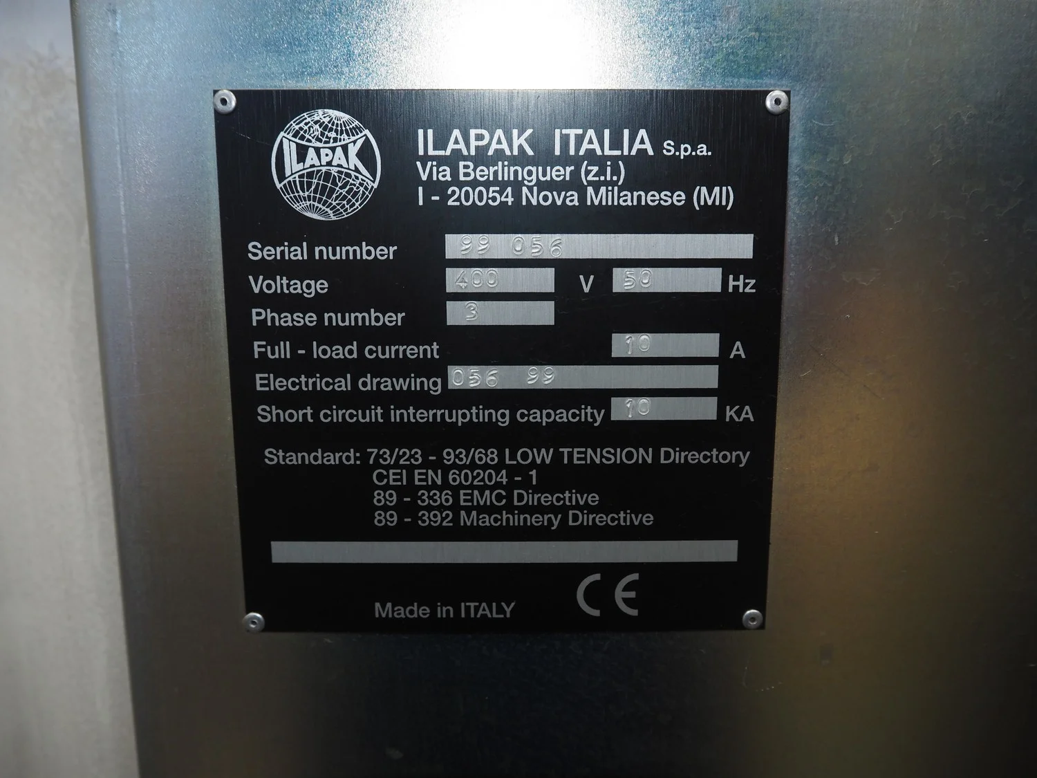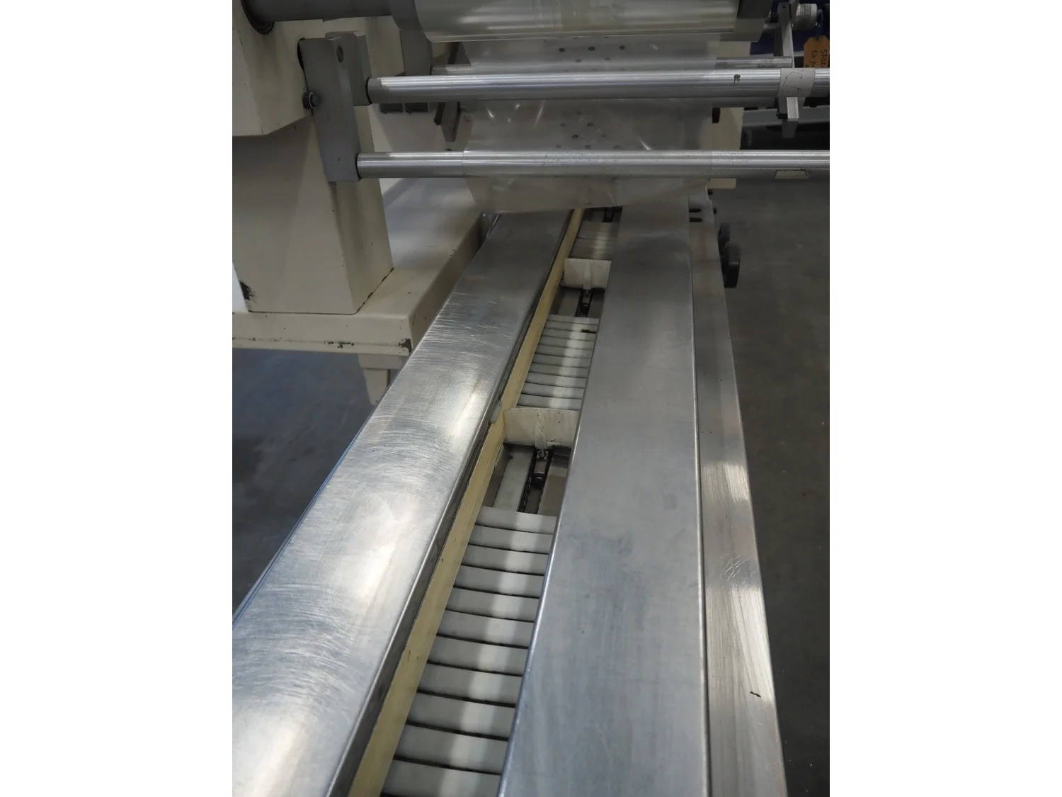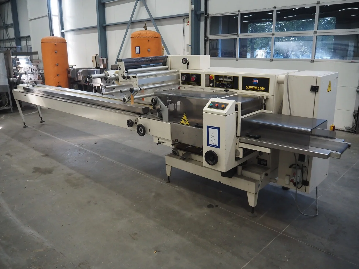 Ilapak Italia S.p.a. flowpacker, type: Superflow, serial number: 99 056, 400 V, 3 Ph, 50 Hz, 10 A, seal width: 250 mm, plastic belt, belt width: 100 mm, film width: 400 and 350 mm, total dimensions: 6800 mm x 1300 mm x 1600 mm.