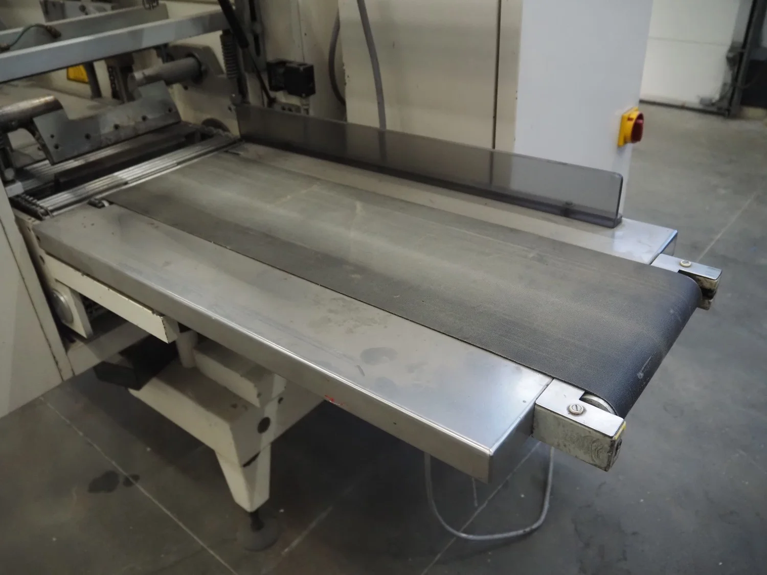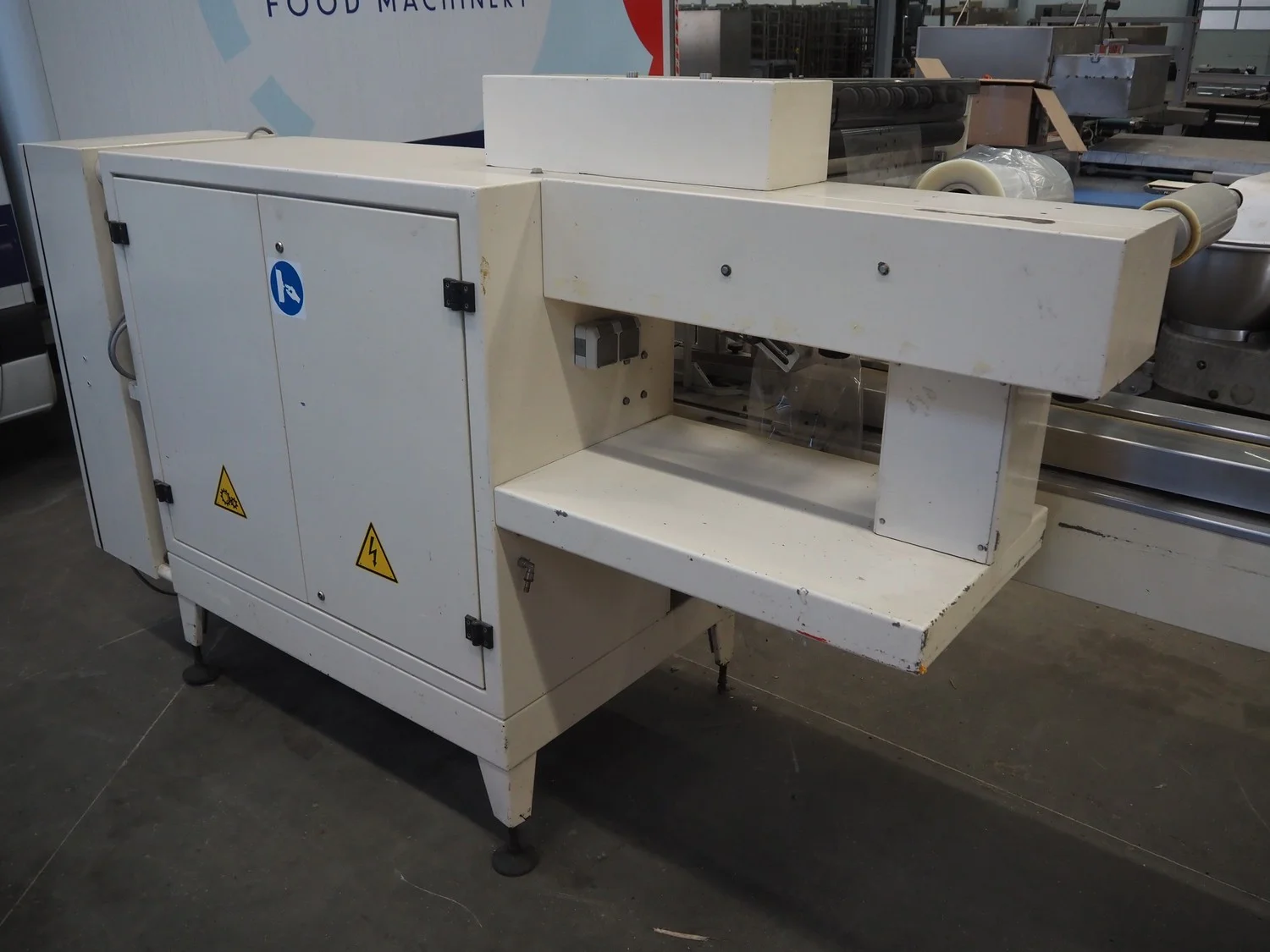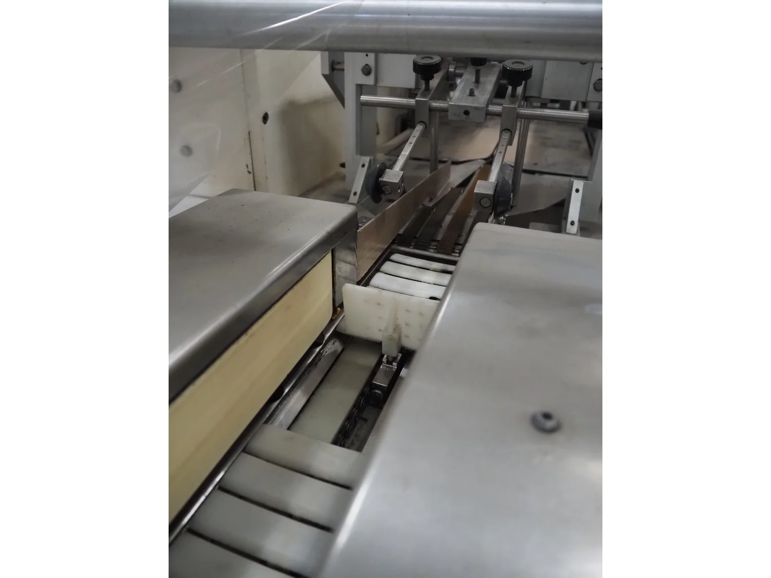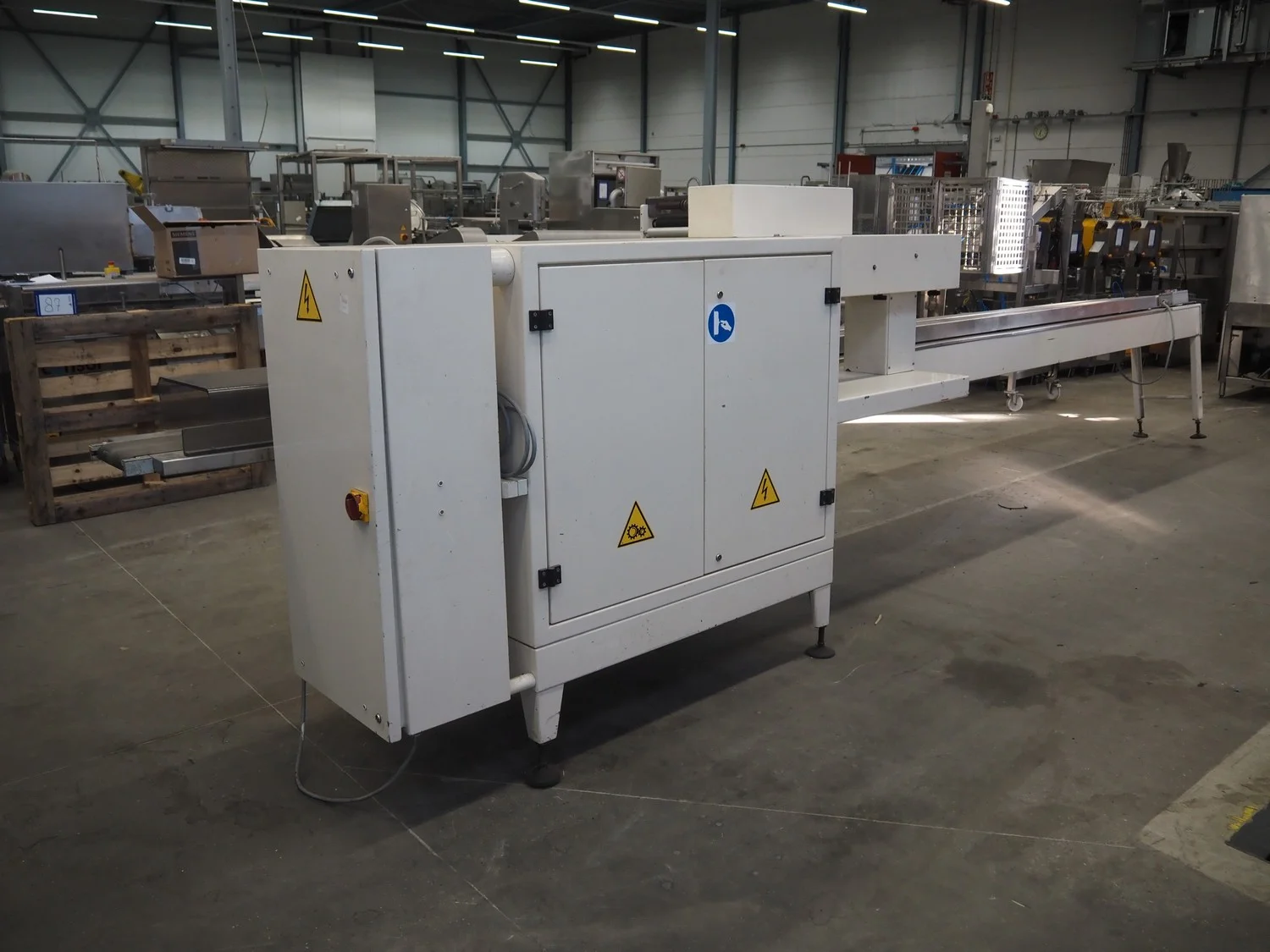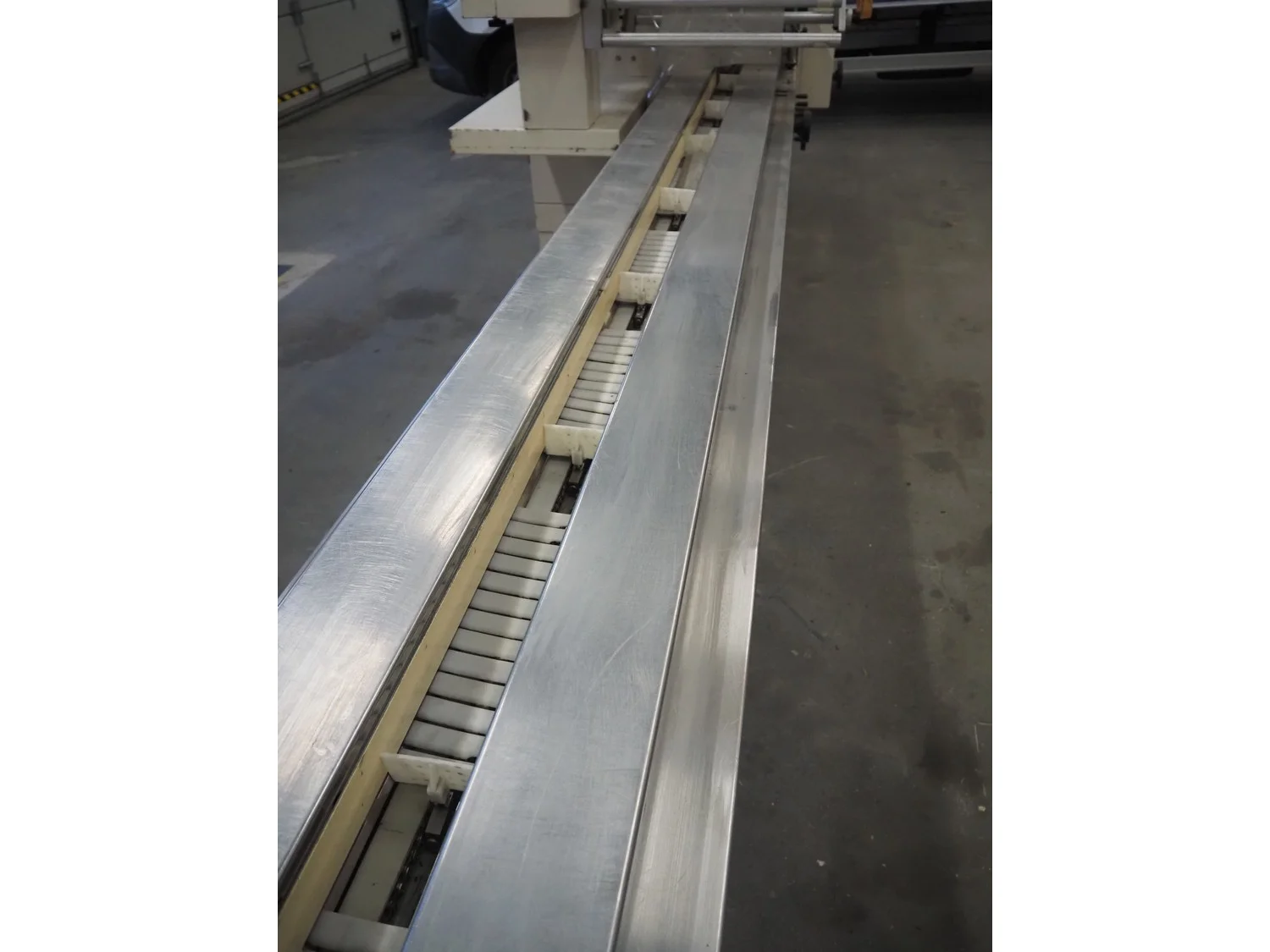 Ilapak Italia S.p.a. flowpacker, type: Superflow, serial number: 99 056, 400 V, 3 Ph, 50 Hz, 10 A, seal width: 250 mm, plastic belt, belt width: 100 mm, film width: 400 and 350 mm, total dimensions: 6800 mm x 1300 mm x 1600 mm.
