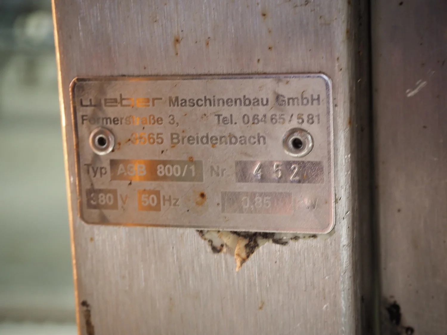 Weber Maschinenbau GmbH mobile skinning and derinding machine, type: ASB 800/1, number: 452, 380 V, 50 Hz, 0.85 kW, working width: 380 mm, total dimensions: 670 mm x 850 mm x 1200 mm. Incomplete.