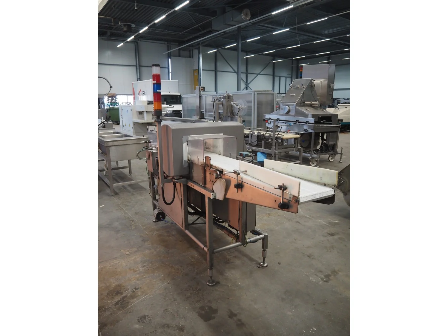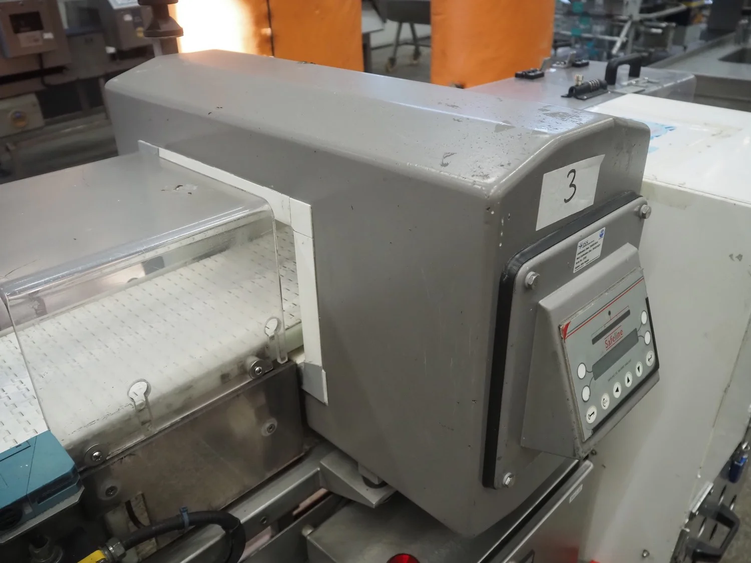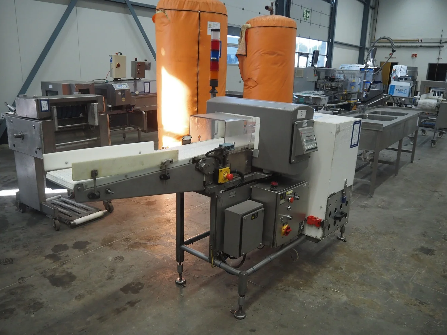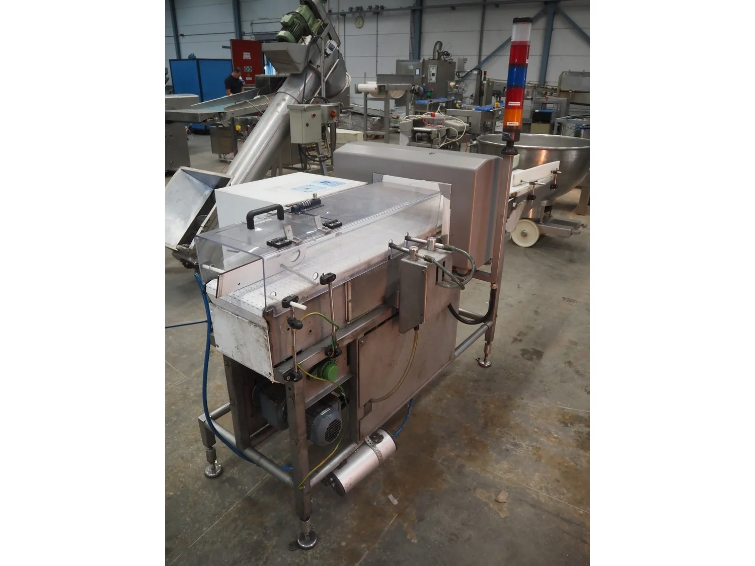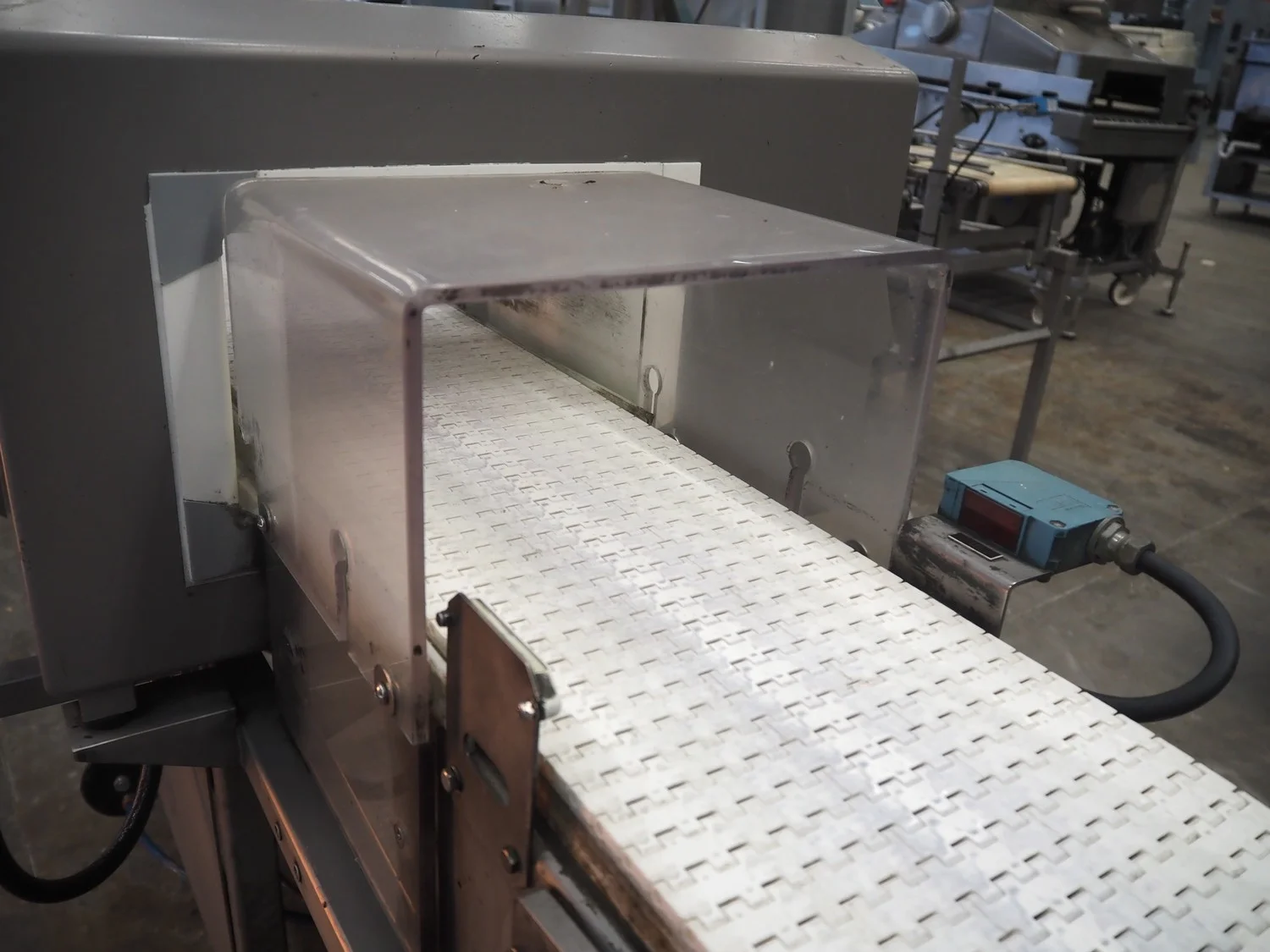 Safeline metal detector with rejecter, clearance: 310 mm x 140 mm, plastic belt, belt width: 250 mm, total dimensions: 2500 mm x 900 mm x 1850 mm.