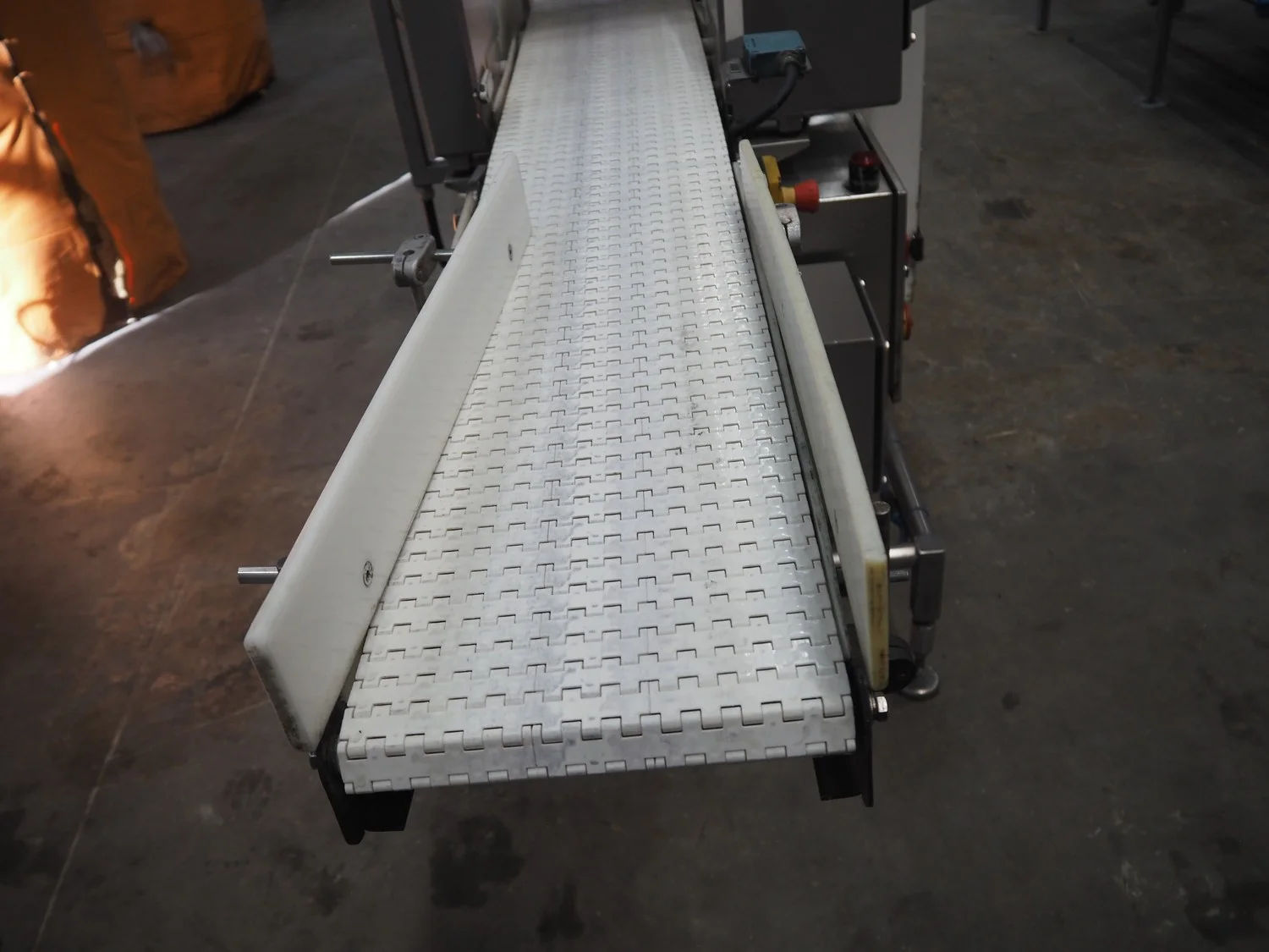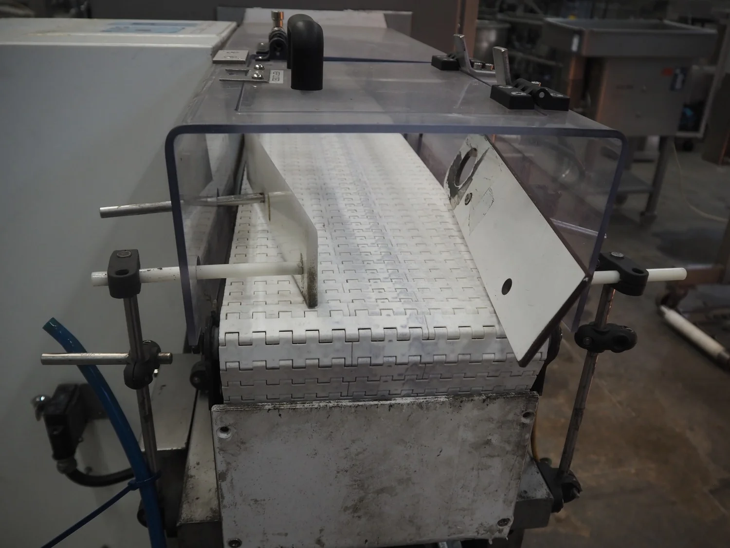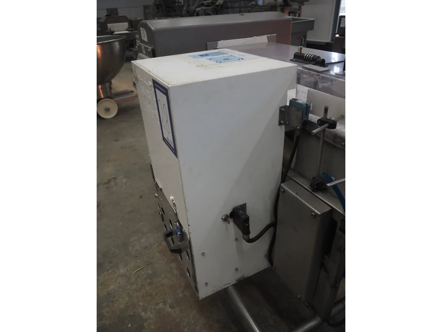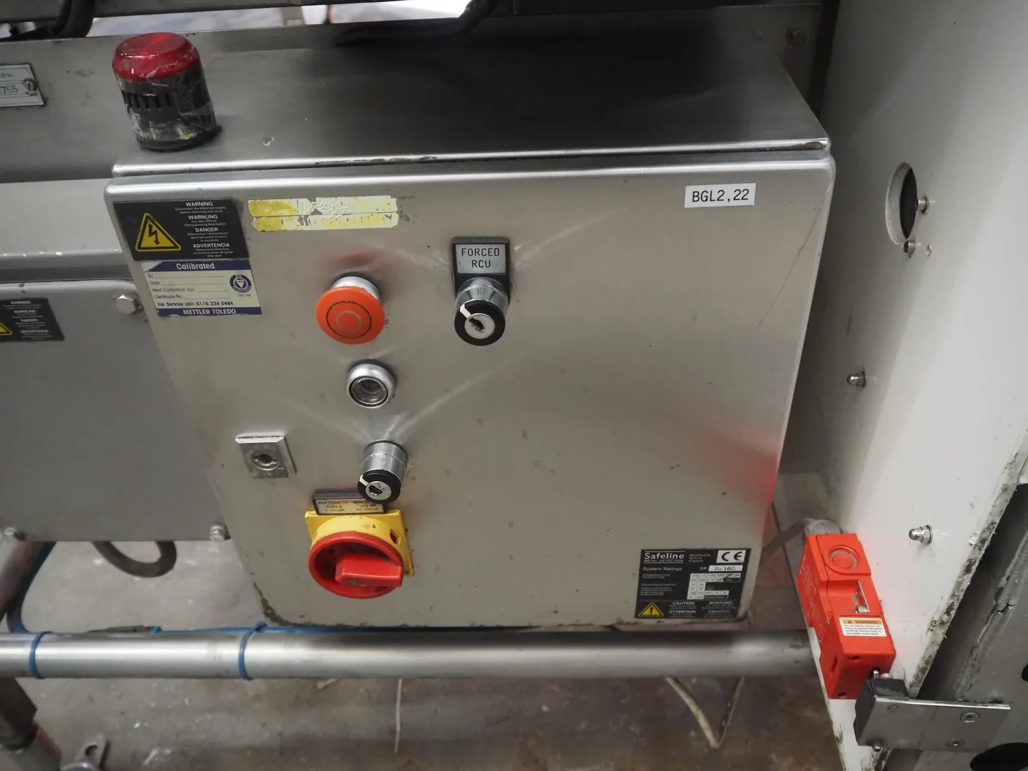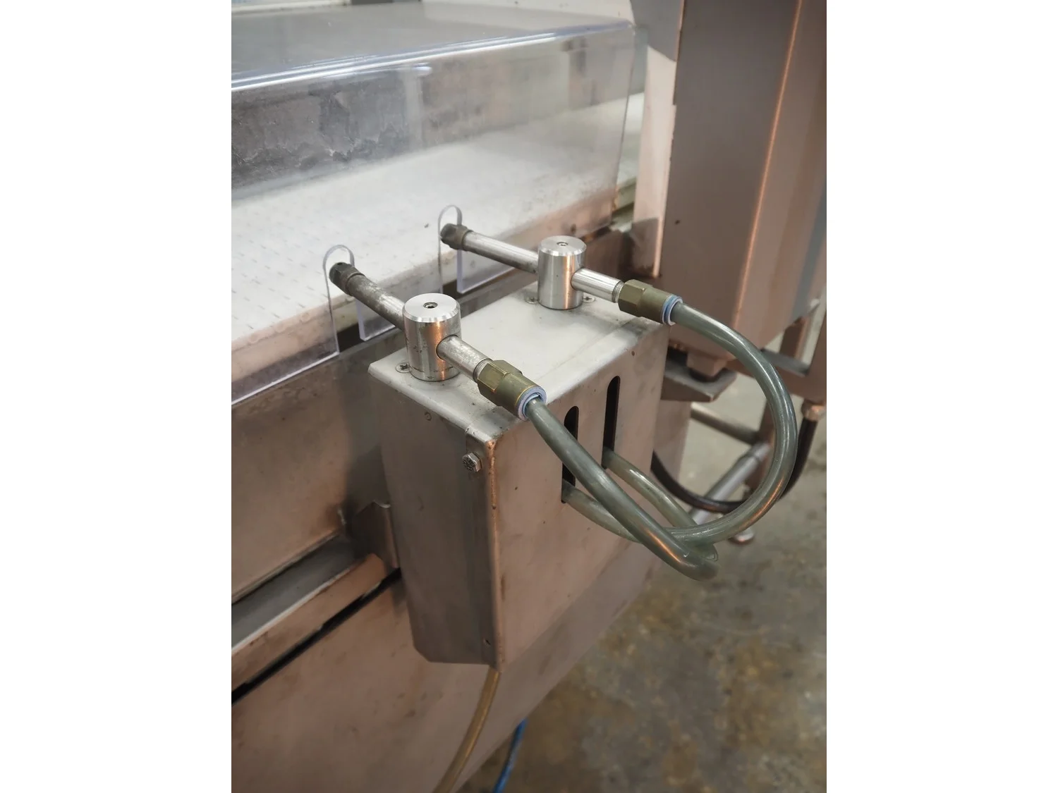 Safeline metal detector with rejecter, clearance: 310 mm x 140 mm, plastic belt, belt width: 250 mm, total dimensions: 2500 mm x 900 mm x 1850 mm.