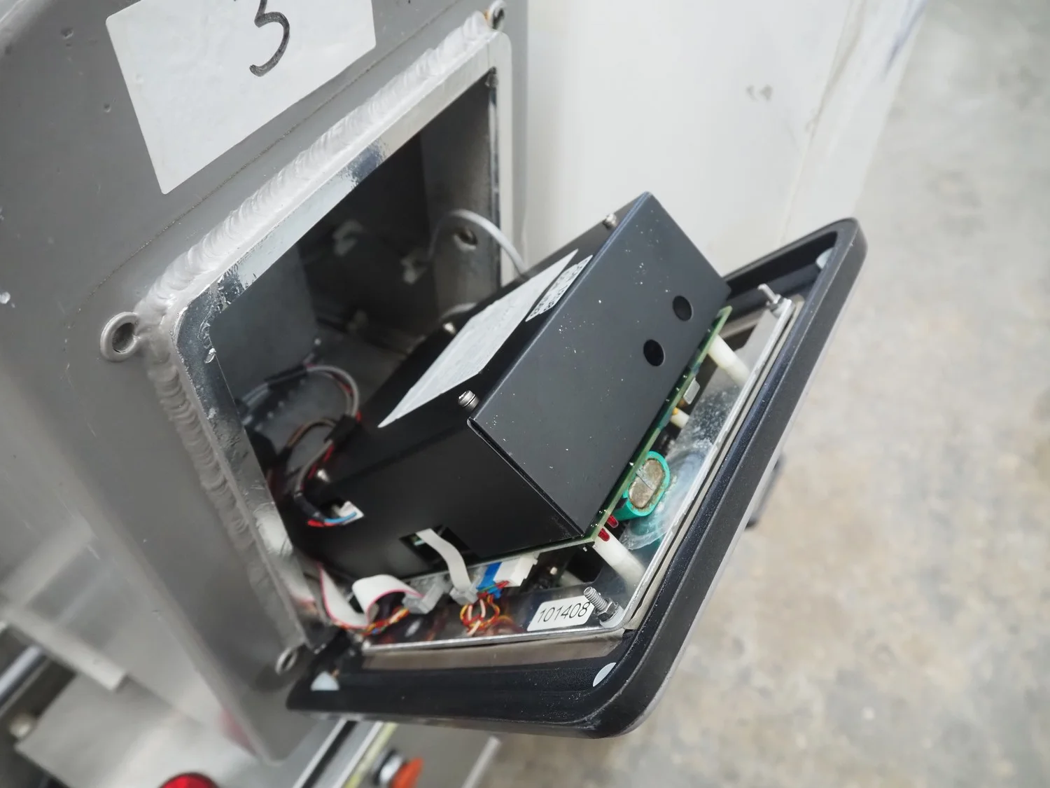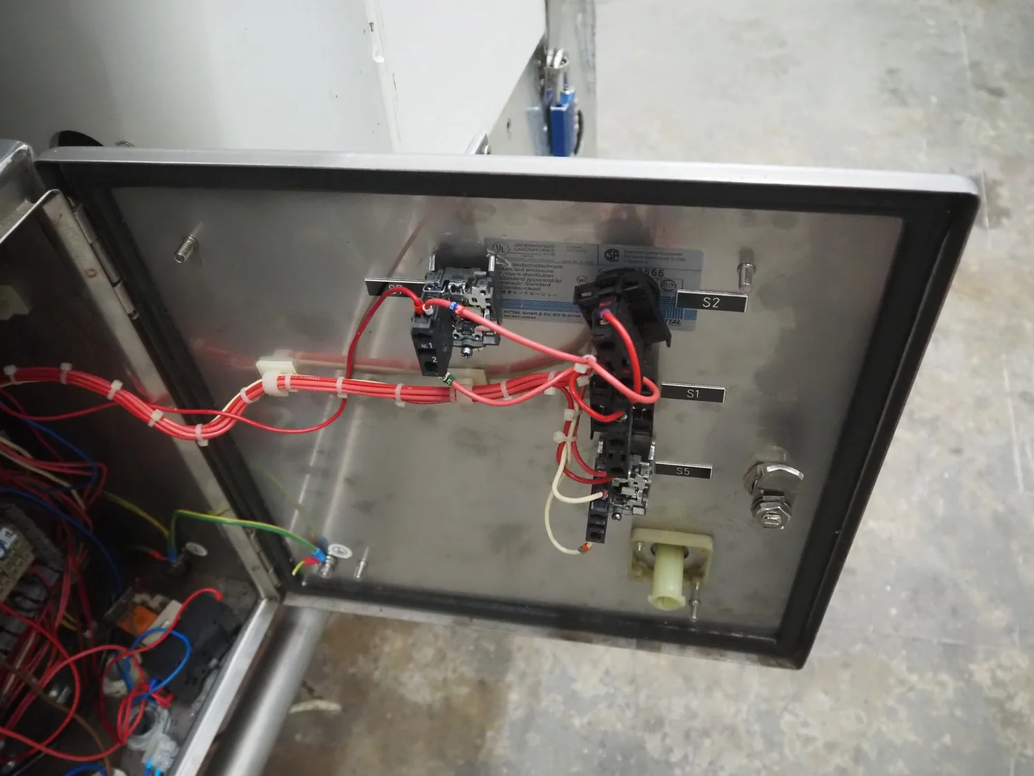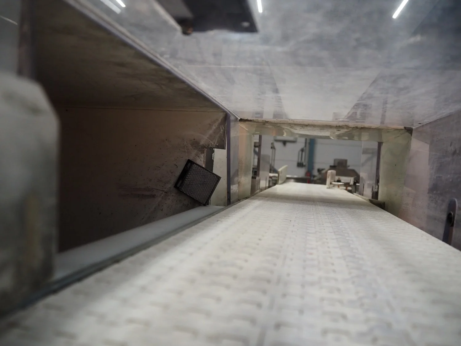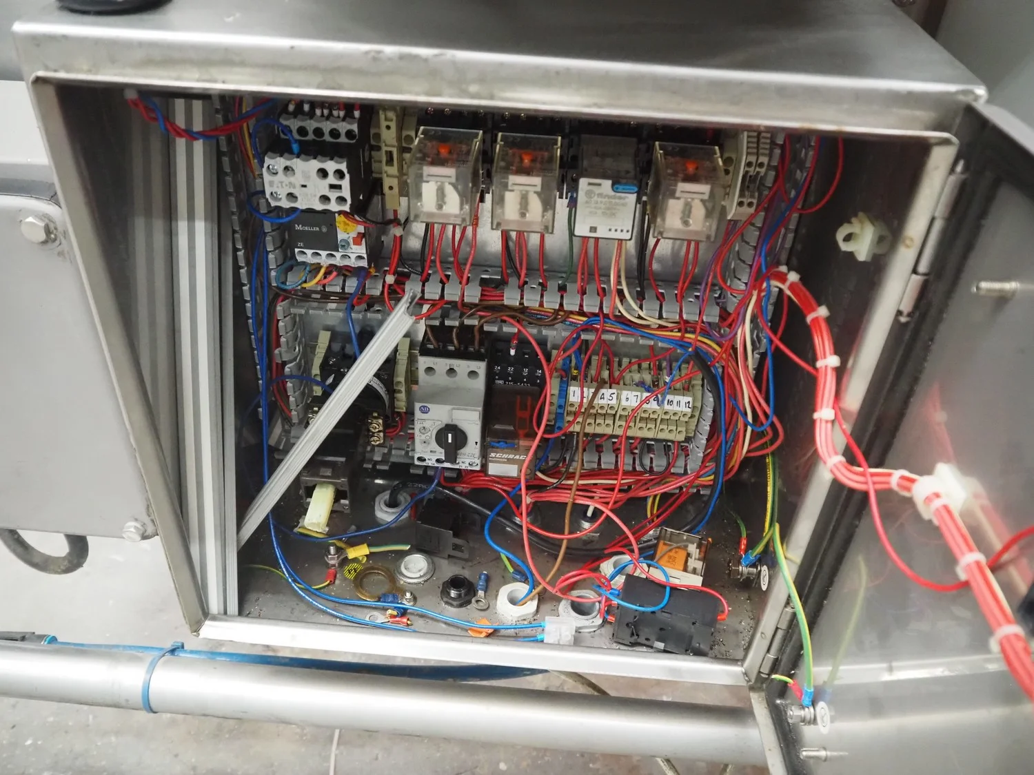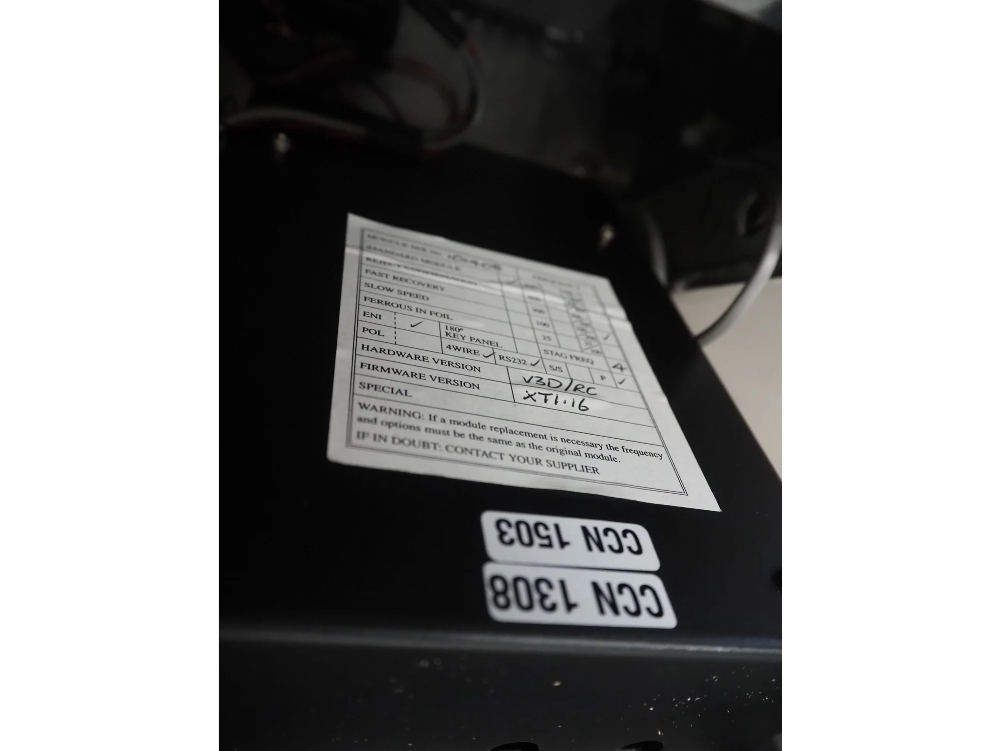 Safeline metal detector with rejecter, clearance: 310 mm x 140 mm, plastic belt, belt width: 250 mm, total dimensions: 2500 mm x 900 mm x 1850 mm.