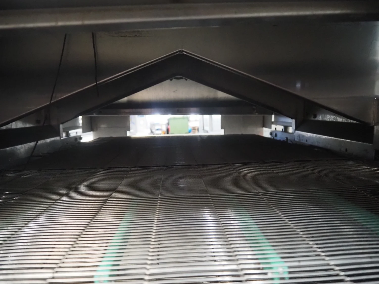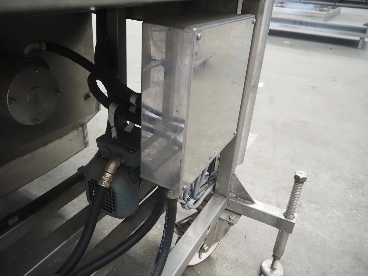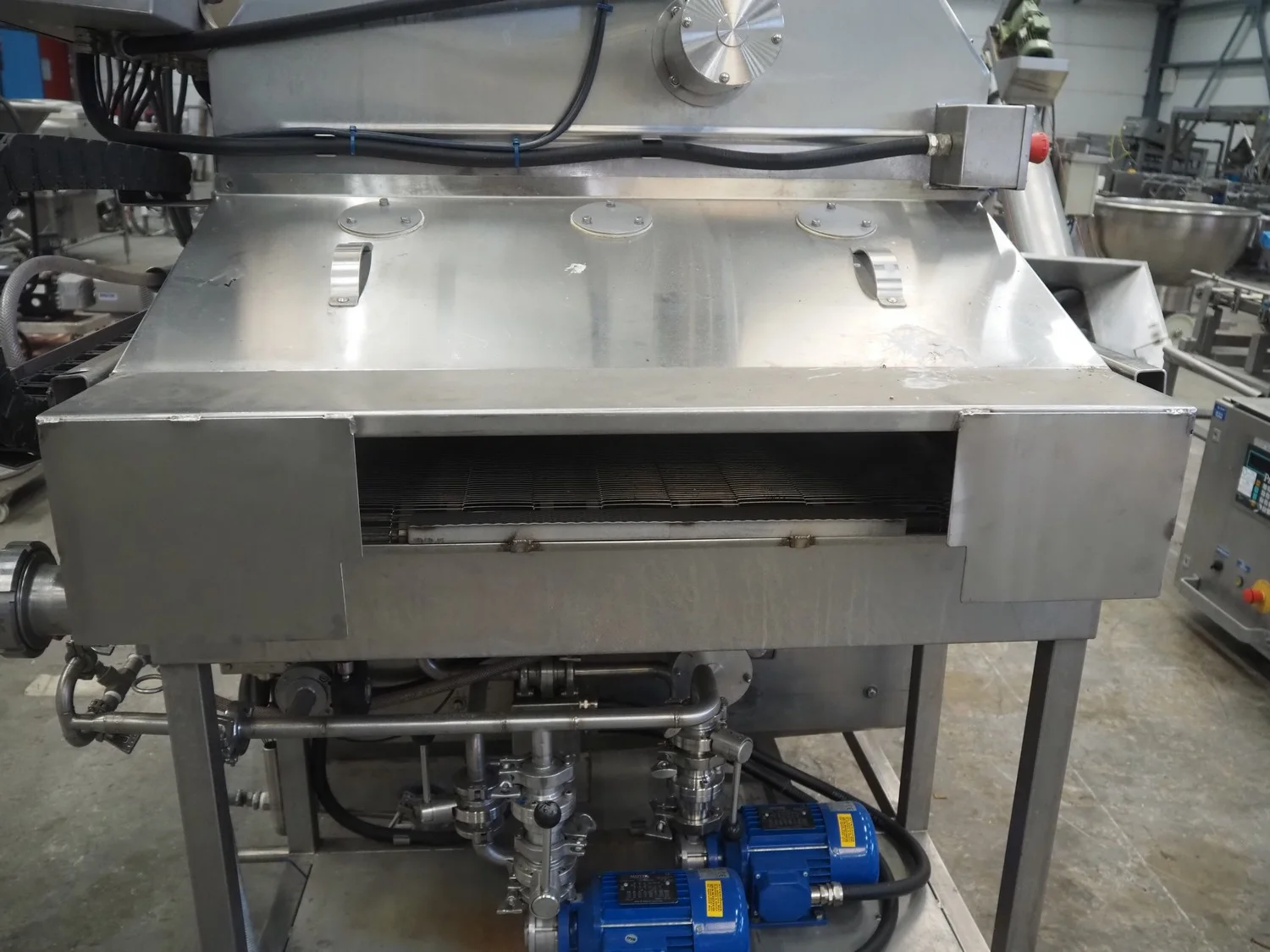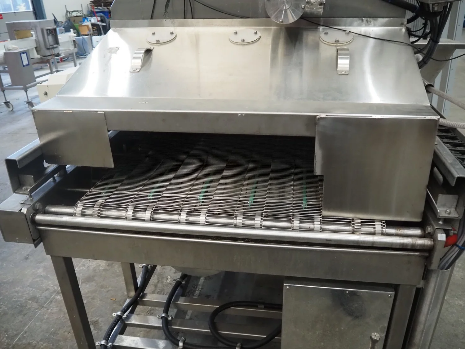 Mobile glazing machine, s/s mesh belt, belt width: 800 mm, total dimensions: 1700 mm x 1550 mm x 2440 mm.