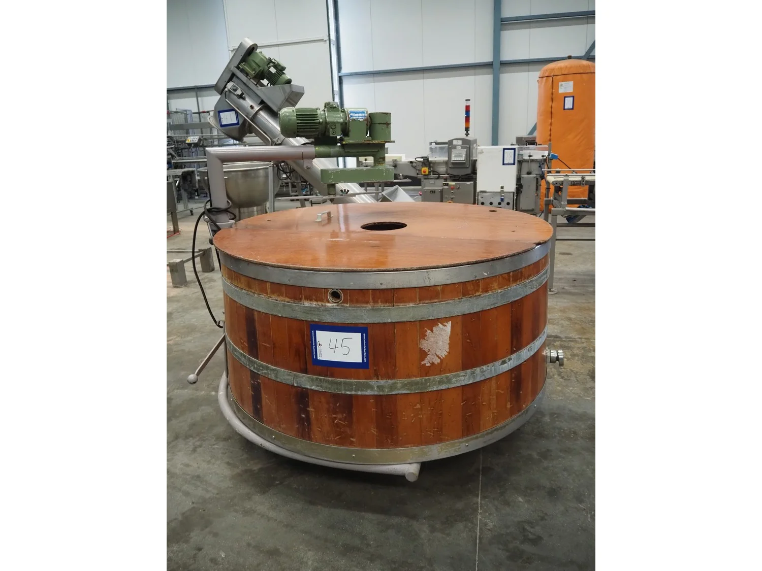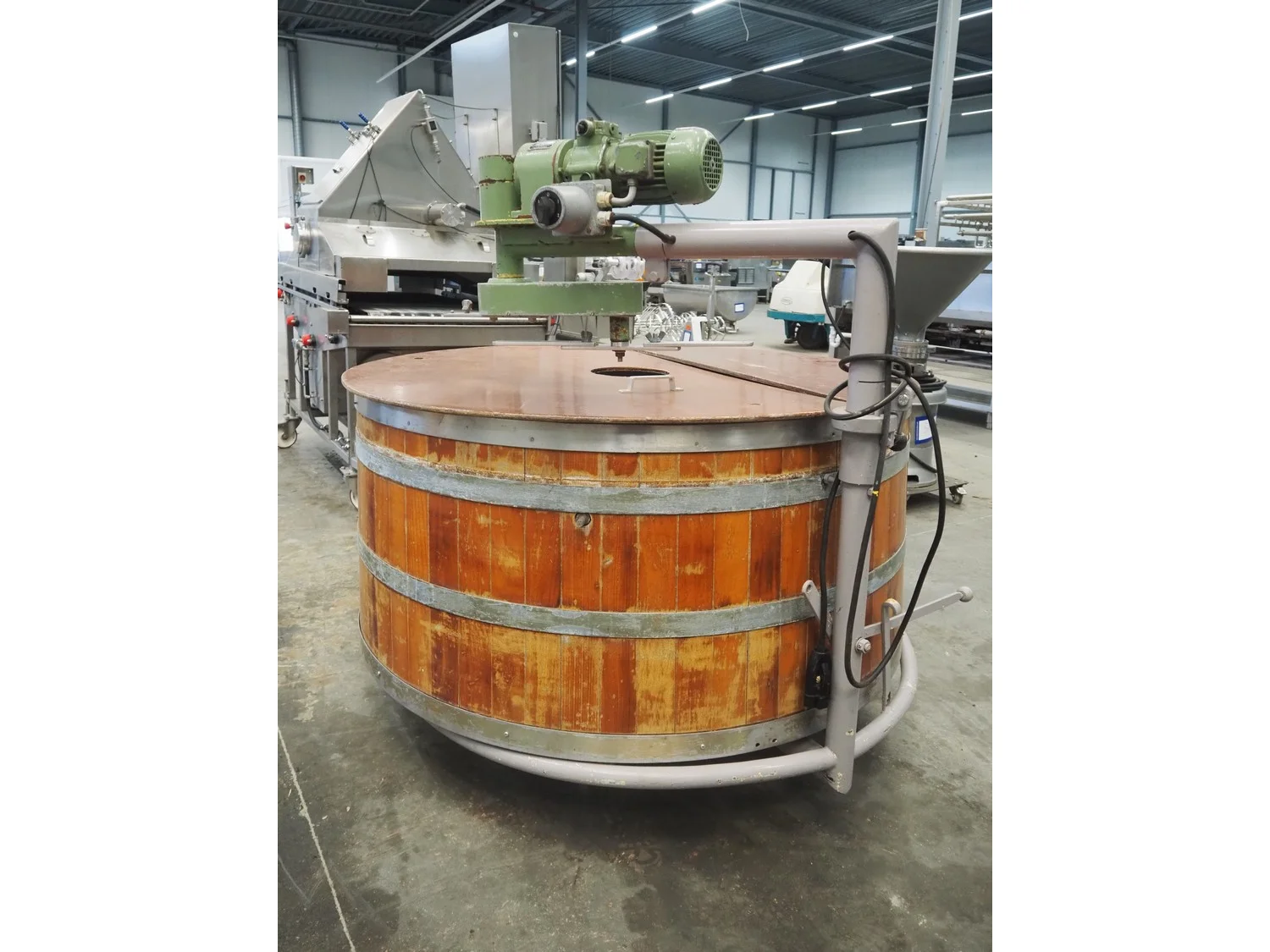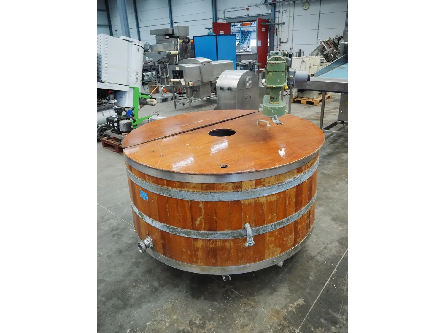 Gebr. Van den Heuvel mobile wooden cheese vat with agitator, inside dimensions: 1300 mm x 1300 mm x 680 mm, total dimensions: 1600 mm x 1450 mm x 1500 mm.