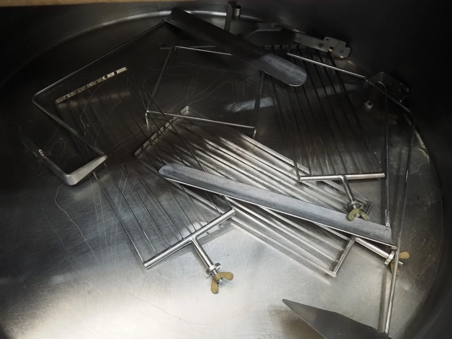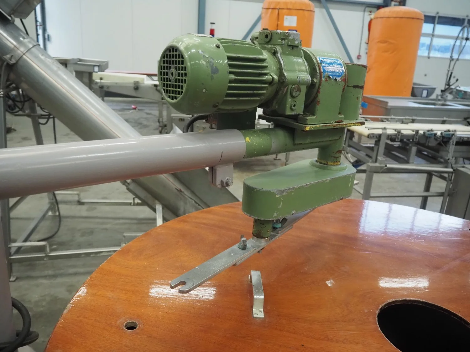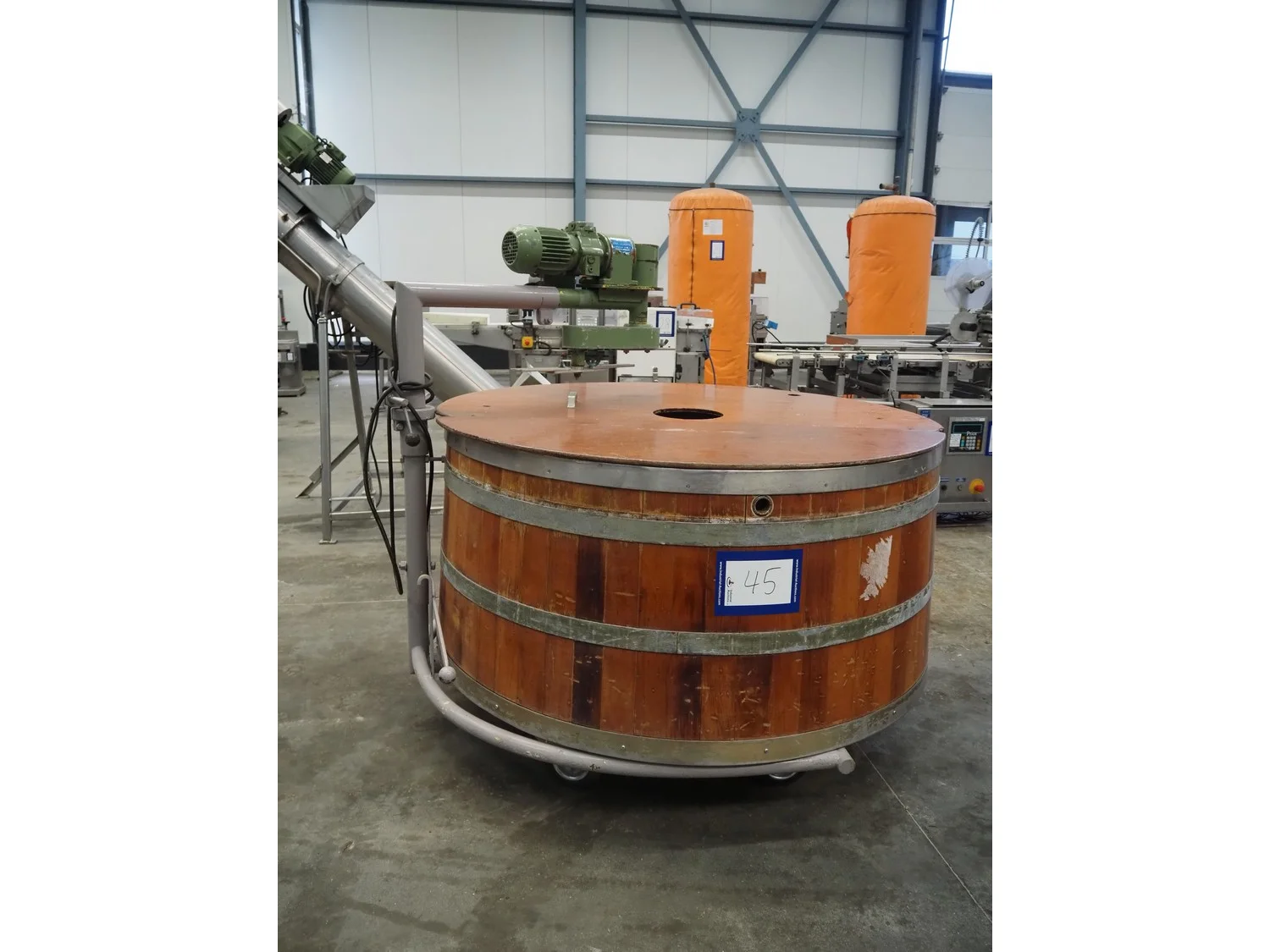 Gebr. Van den Heuvel mobile wooden cheese vat with agitator, inside dimensions: 1300 mm x 1300 mm x 680 mm, total dimensions: 1600 mm x 1450 mm x 1500 mm.