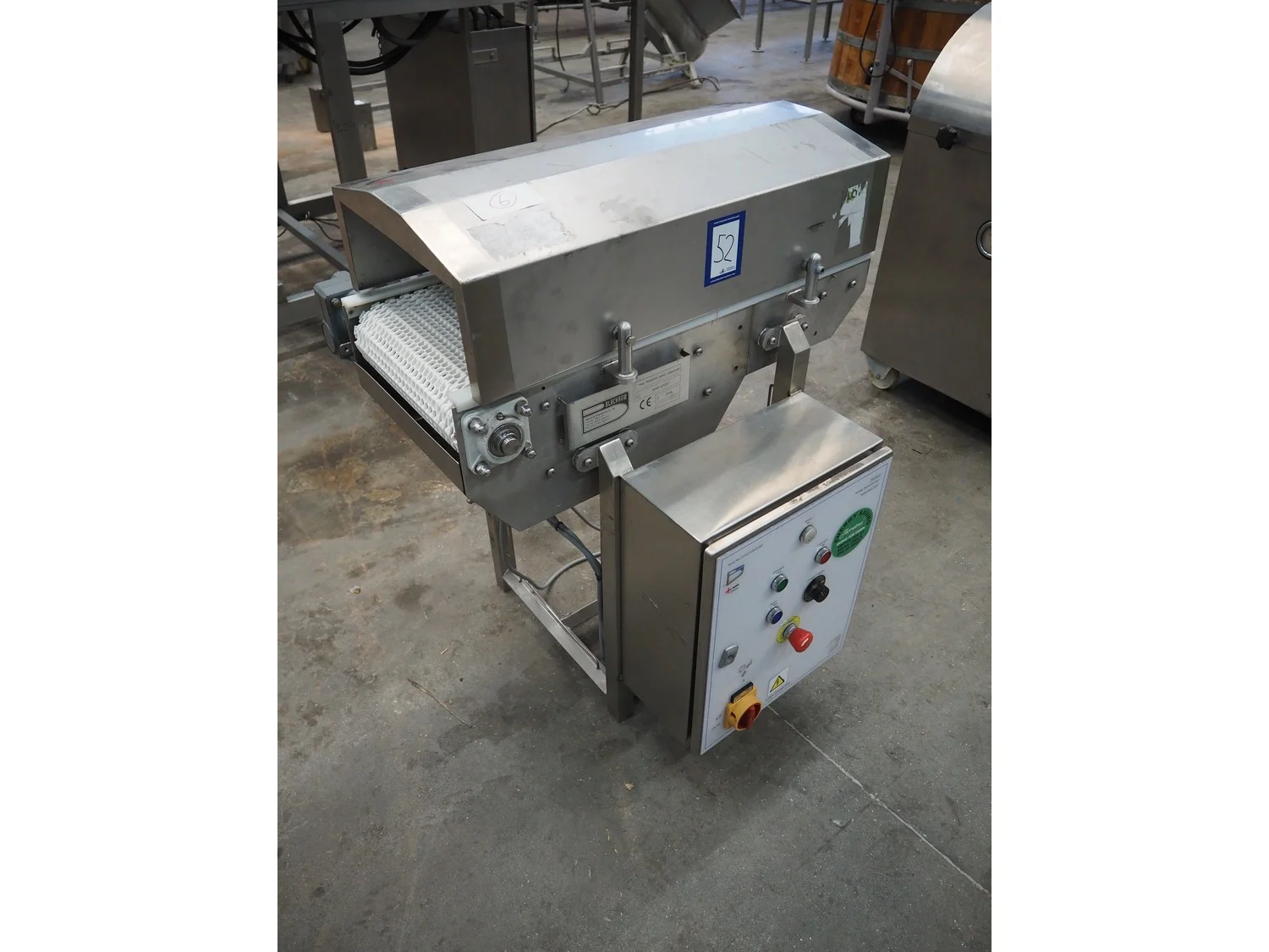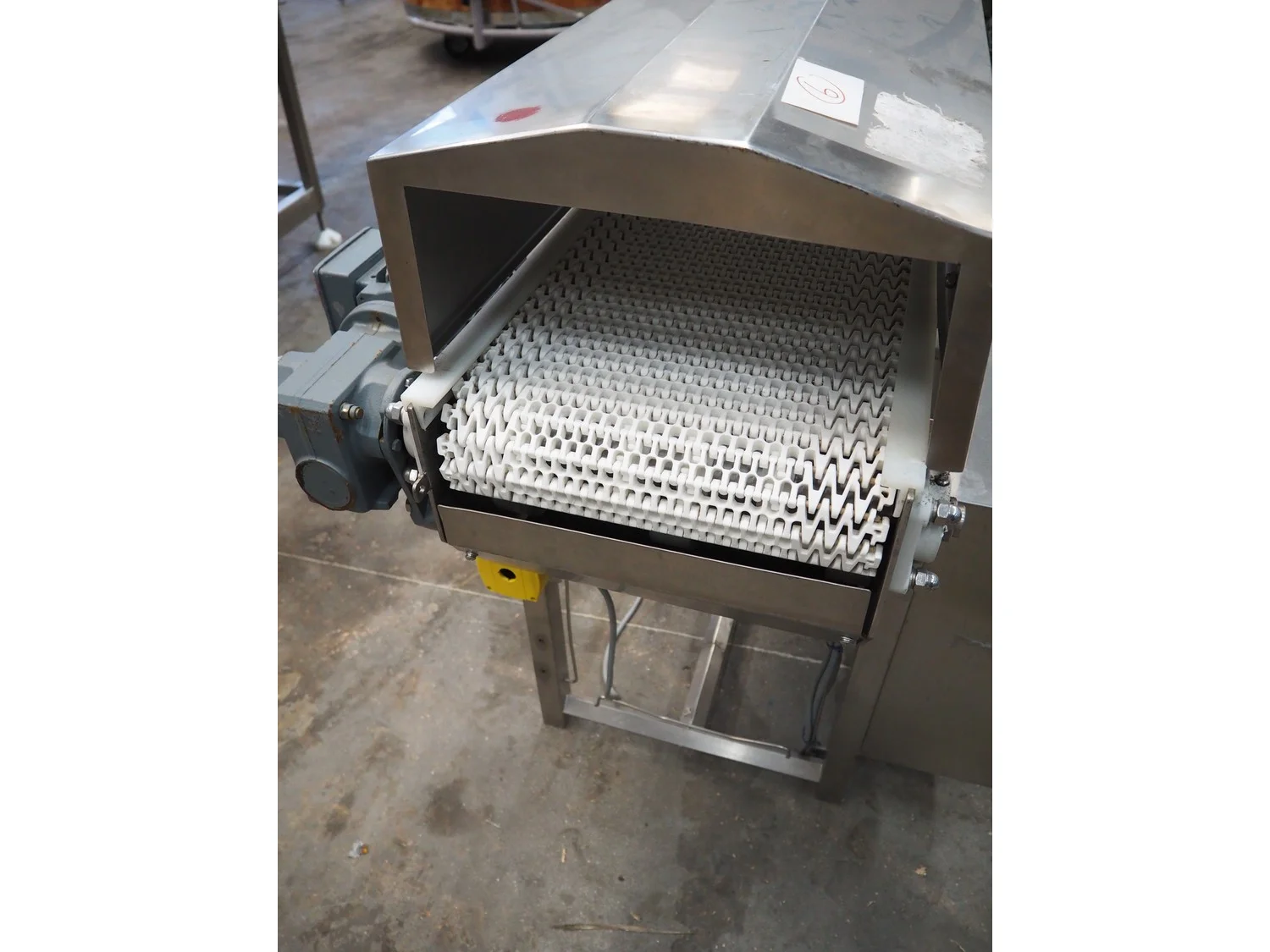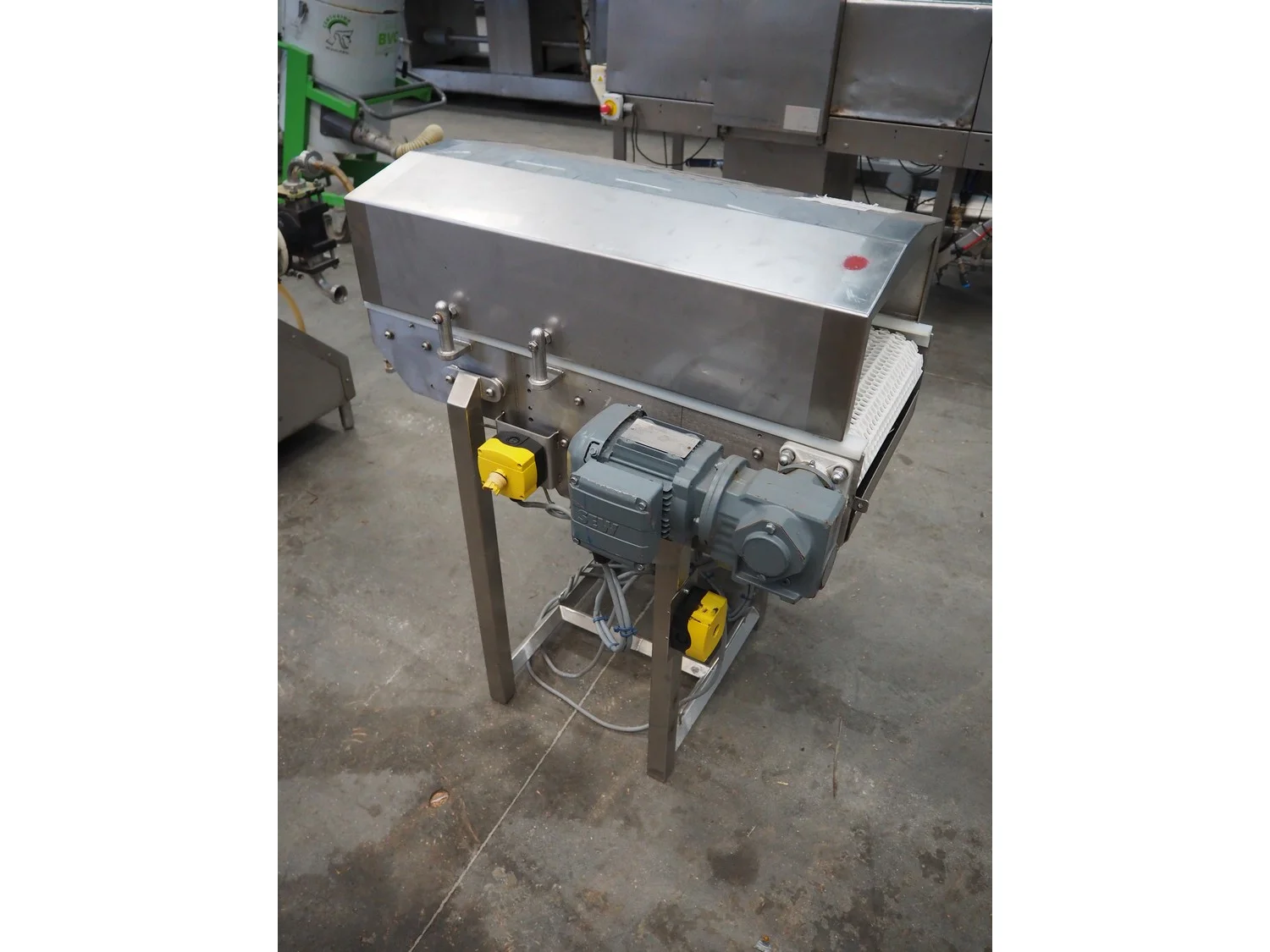Blackrow transport belt, type: tray transfer bend conveyor, serial number: 5018-127227, year of construction: 2015, s/s frame, plastic belt, belt width: 350 mm, total dimensions: 850 mm x 850 mm x 1000 mm.