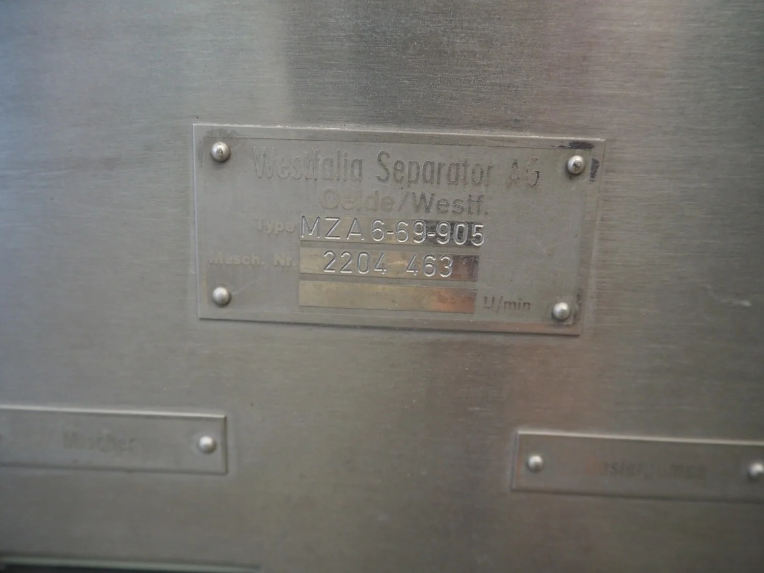 Westfalia Separator AG separator, type: MZA 6-69-905, machine number: 2204 463, dimensions: 900 mm x 800 mm x 1100 mm.