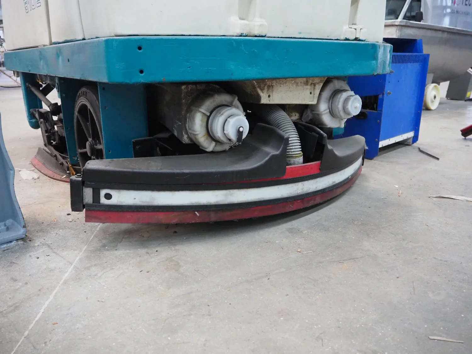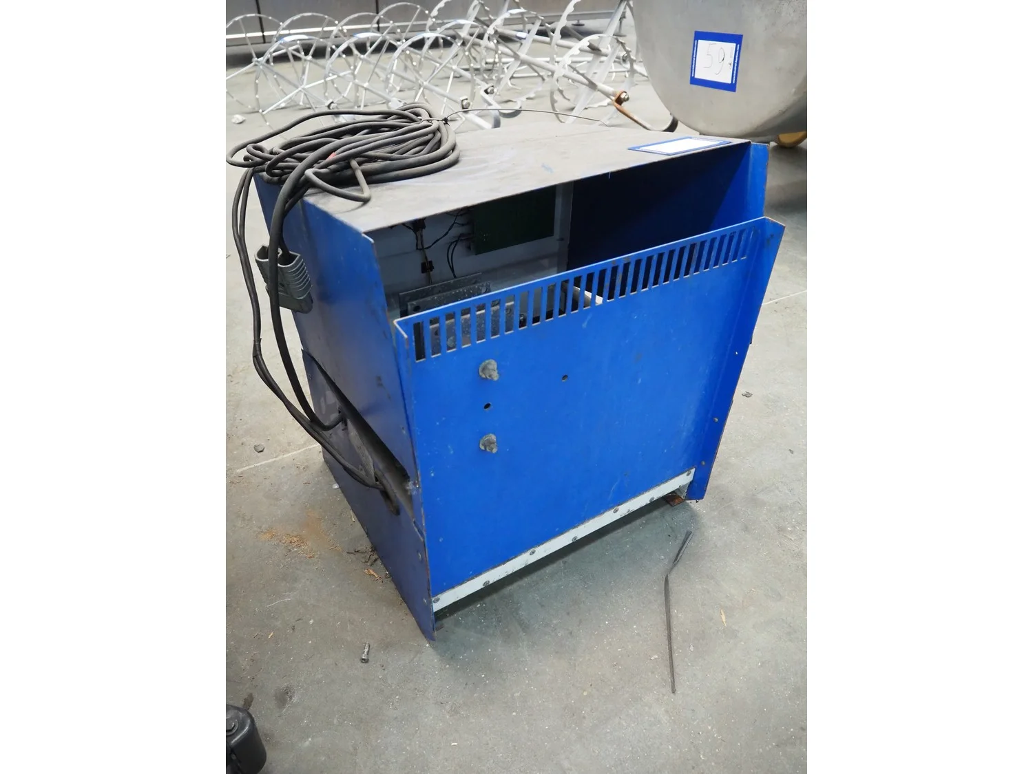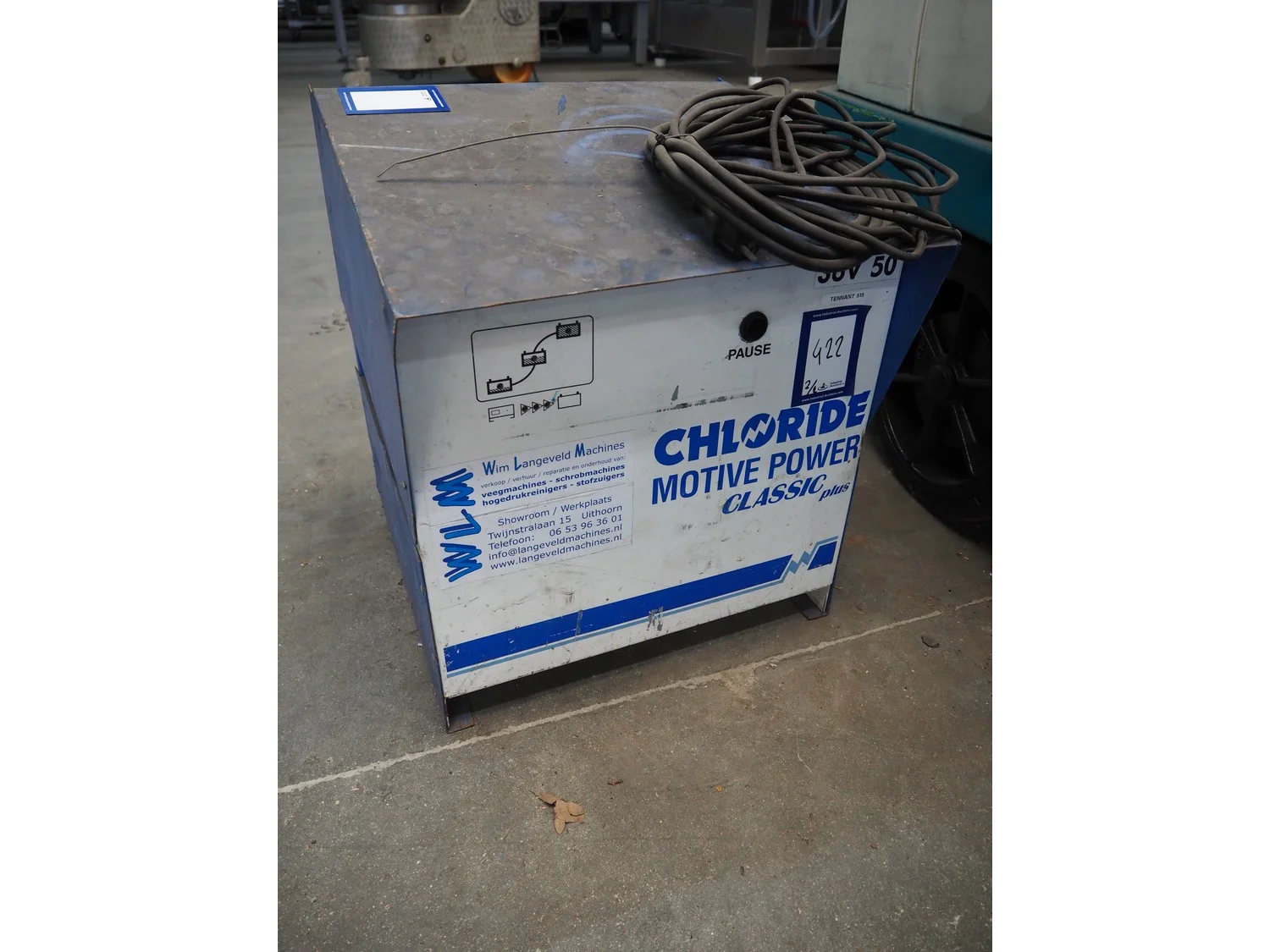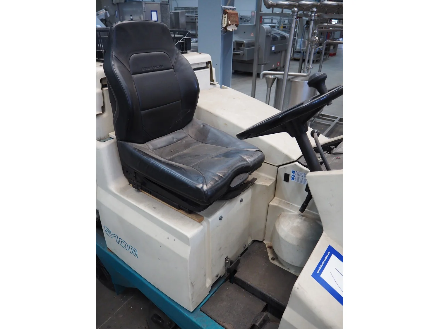 Tennant floor scrubbing machine, model: 510E, dimensions: 1200 mm x 2100 mm x 1600 mm. With Chloride motive power battery charger, 36 V.