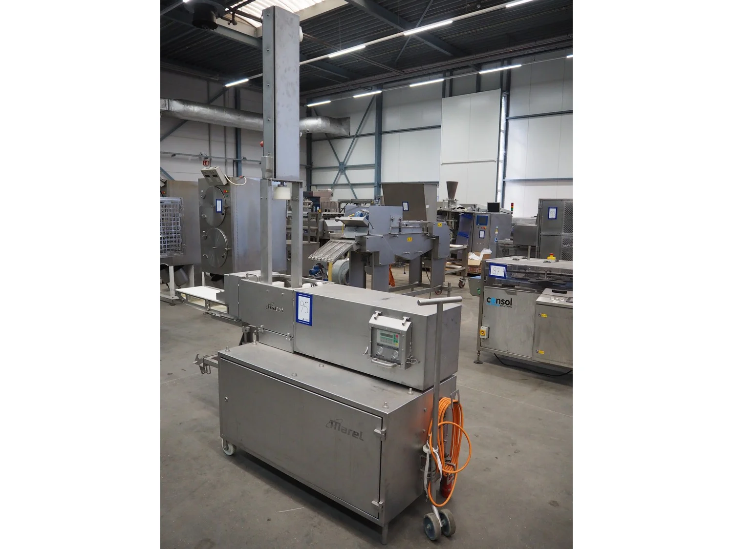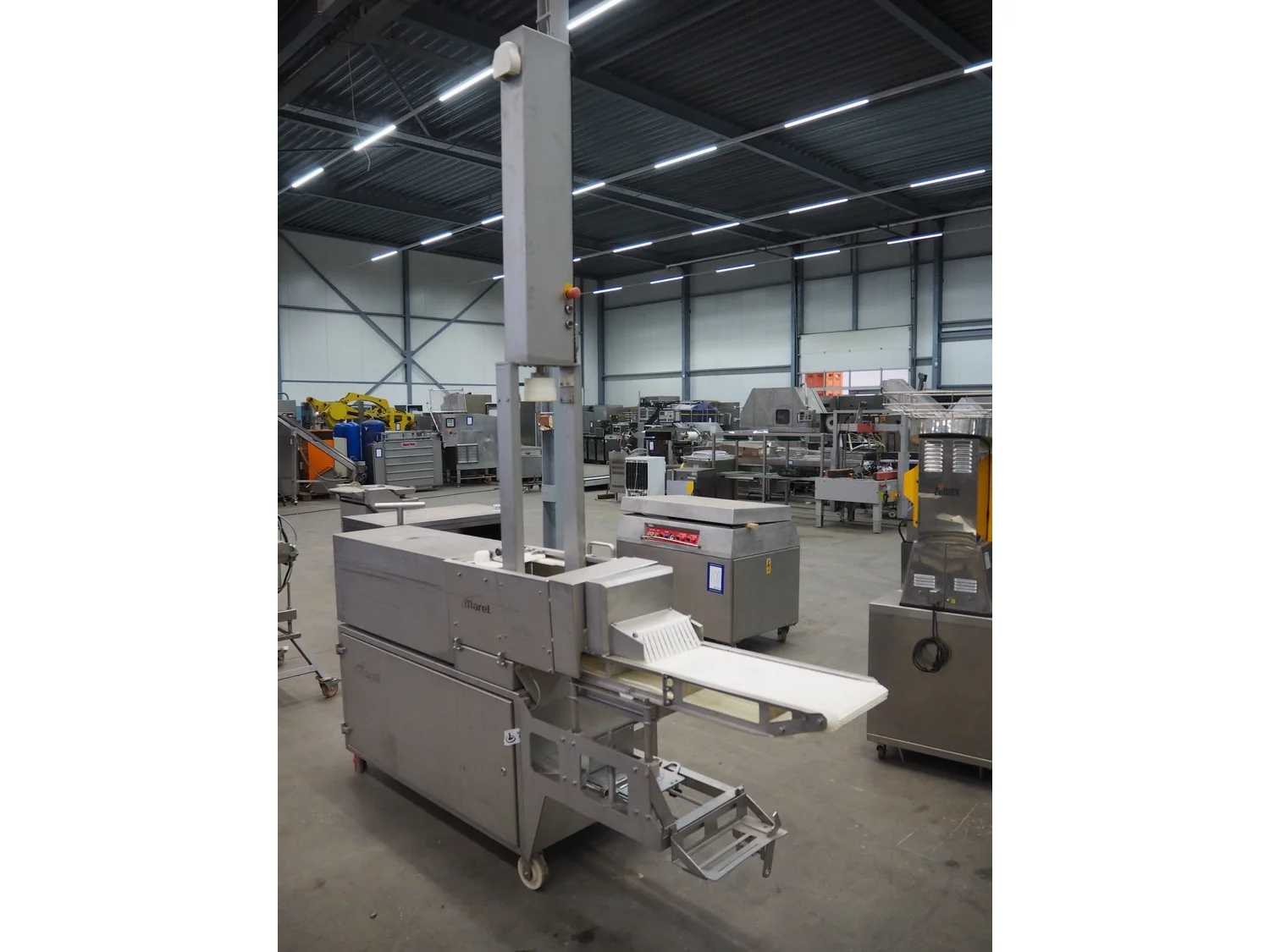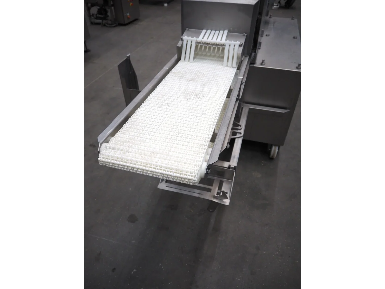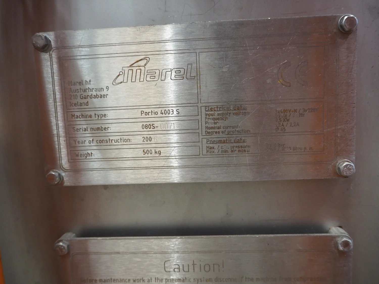Marel portioning machine, type: Portio 4003S, serial number: 080S-0071, year of construction: 2006, 400 V, 3 Ph, 50/60 Hz, 1.2/2.2 A, weight: 500 kg, plastic belt, belt width: 250 mm, total dimensions: 2700 mm x 800 mm x 3000 mm.