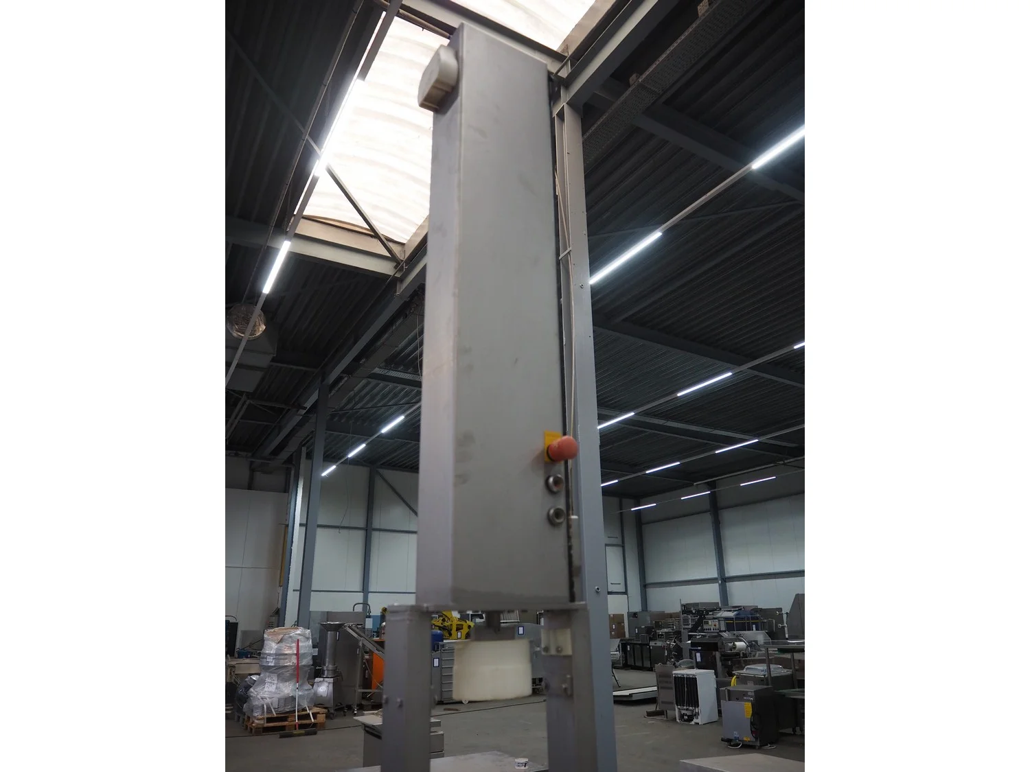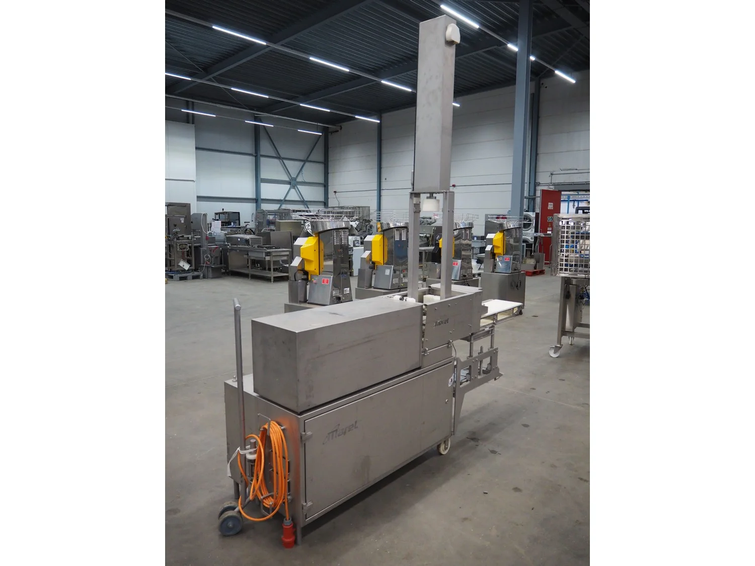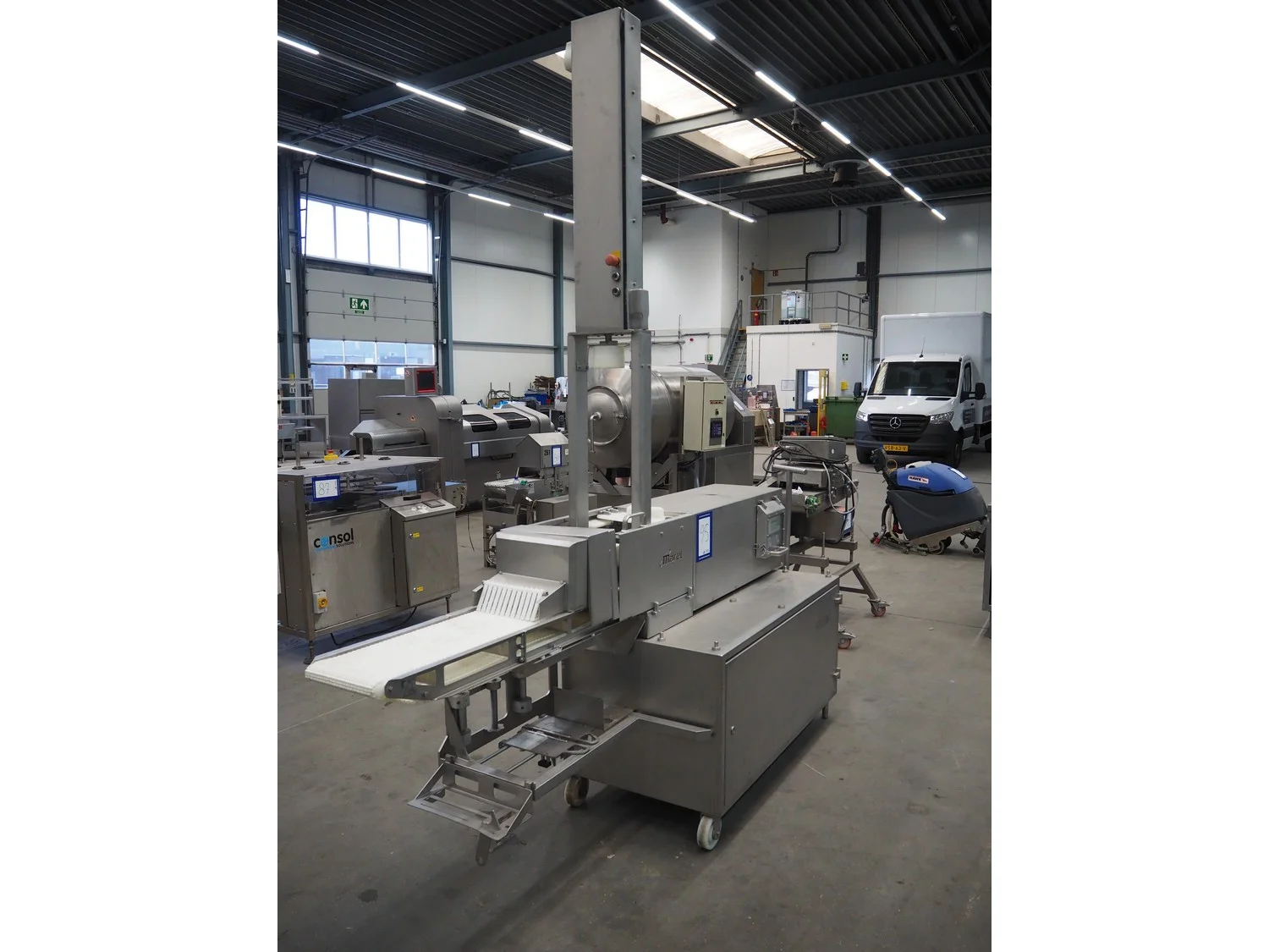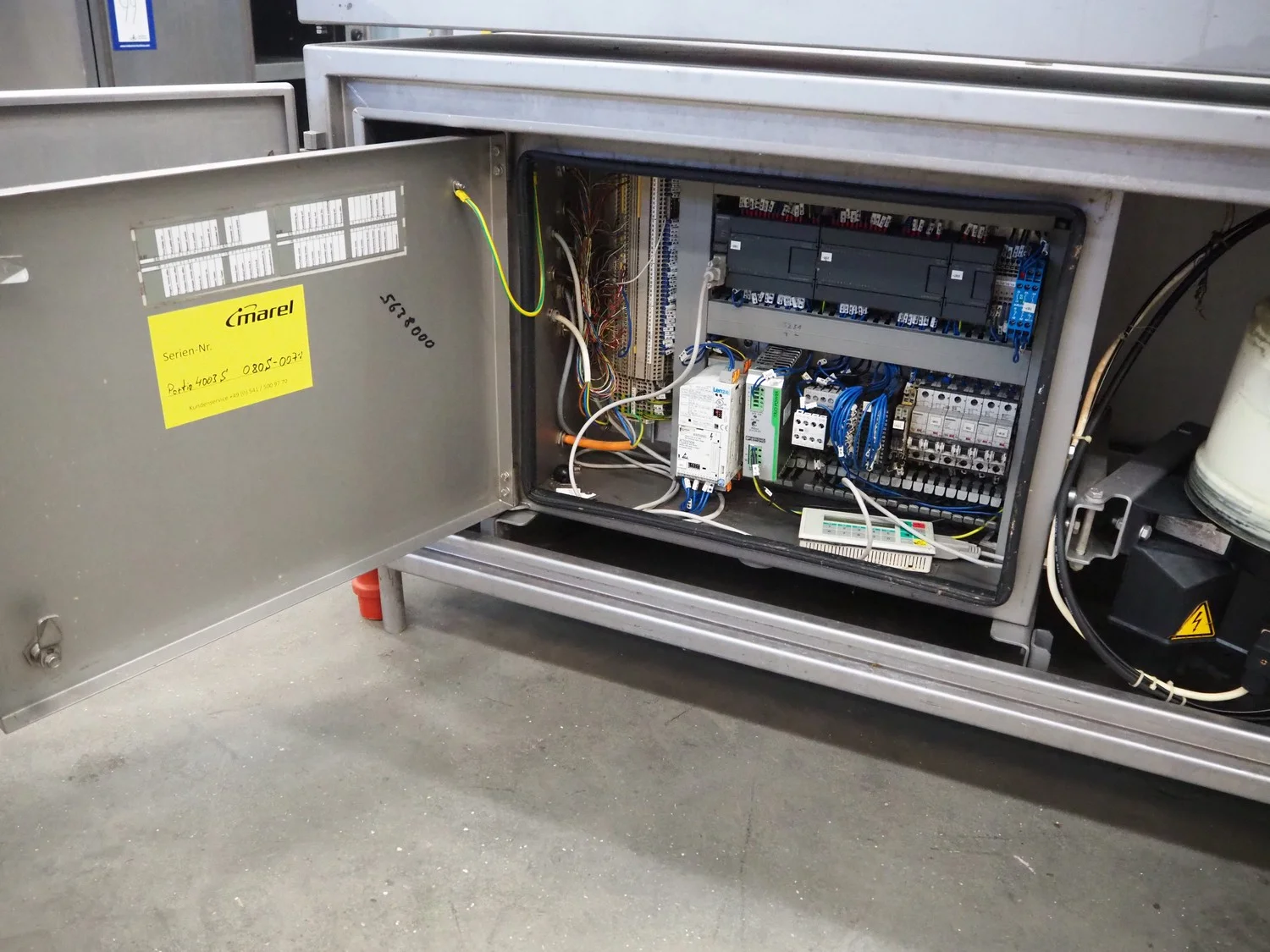 Marel portioning machine, type: Portio 4003S, serial number: 080S-0071, year of construction: 2006, 400 V, 3 Ph, 50/60 Hz, 1.2/2.2 A, weight: 500 kg, plastic belt, belt width: 250 mm, total dimensions: 2700 mm x 800 mm x 3000 mm.