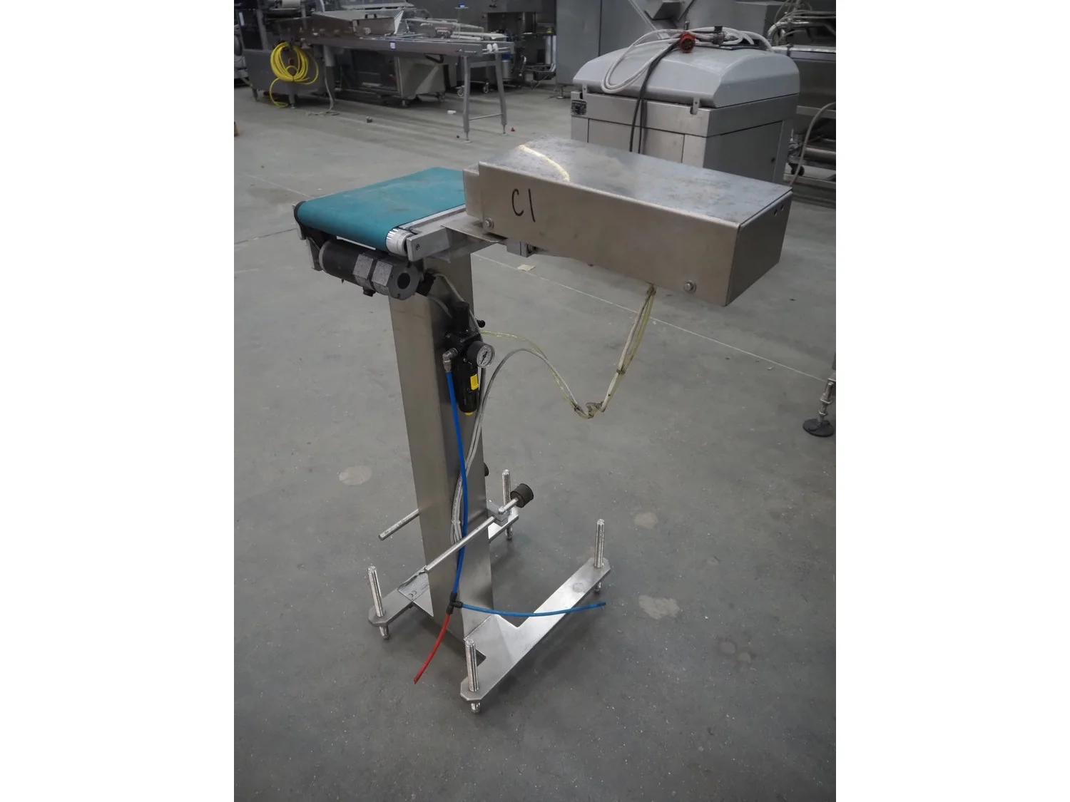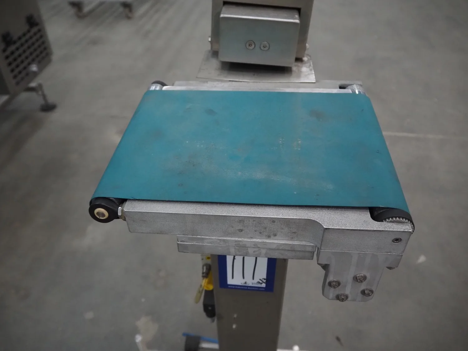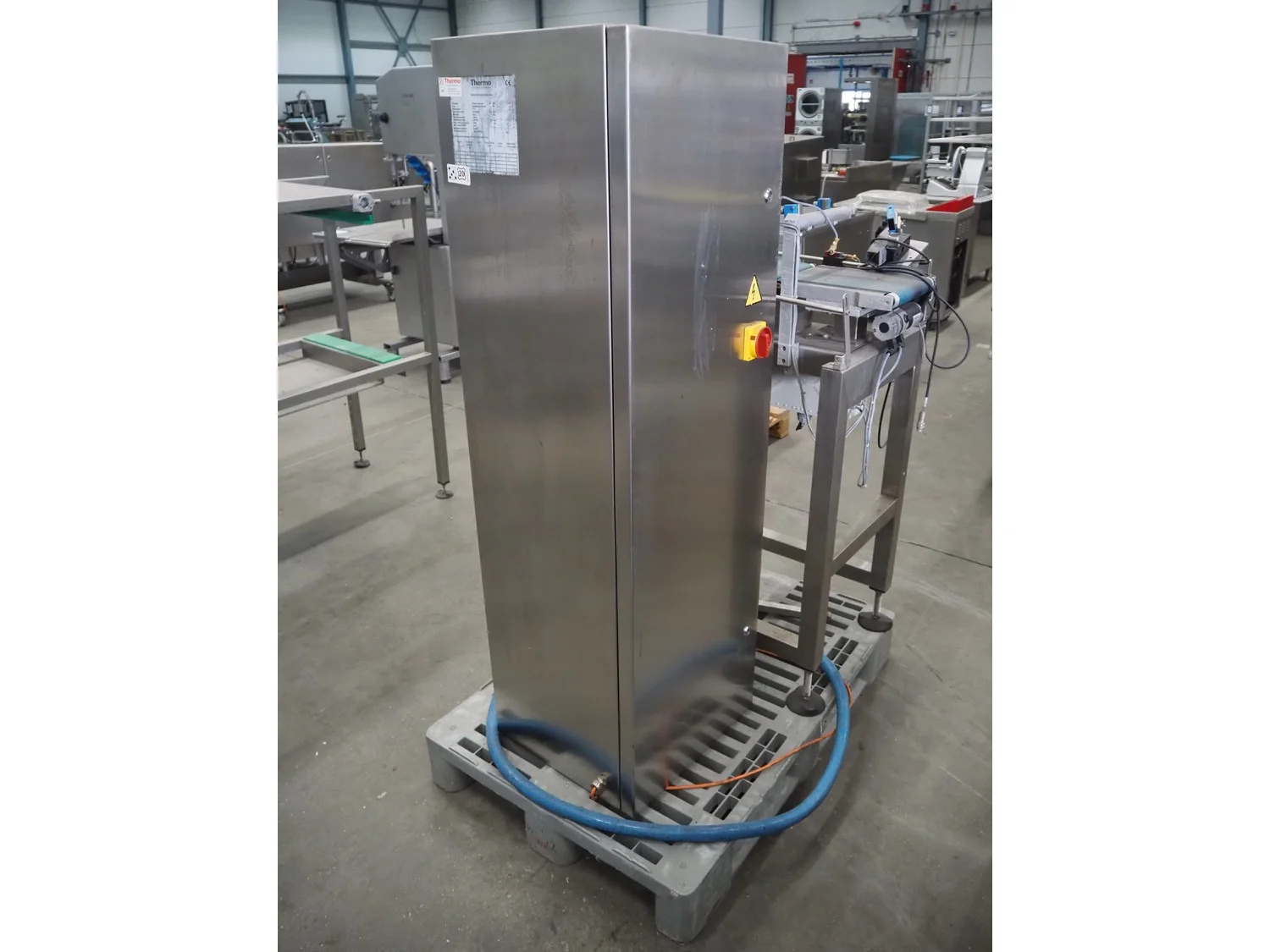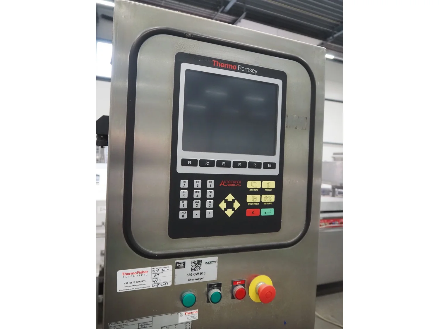 Thermo Ramsey checkweigher with rejecter, model: Sentron C, serial number: 5773, year of construction: 2003, 230 V, 50 Hz, 0.6 kVA, maximum weight: 1500 gram, minimum weight: 35 gram, e=: 0.5 gram, plastic belt, belt width: 195 mm, total dimensions: 900 mm x 800 mm x 1250 mm. With Thermo Ramsey control panel, dimensions: 500 mm x 430 mm x 1770 mm.
